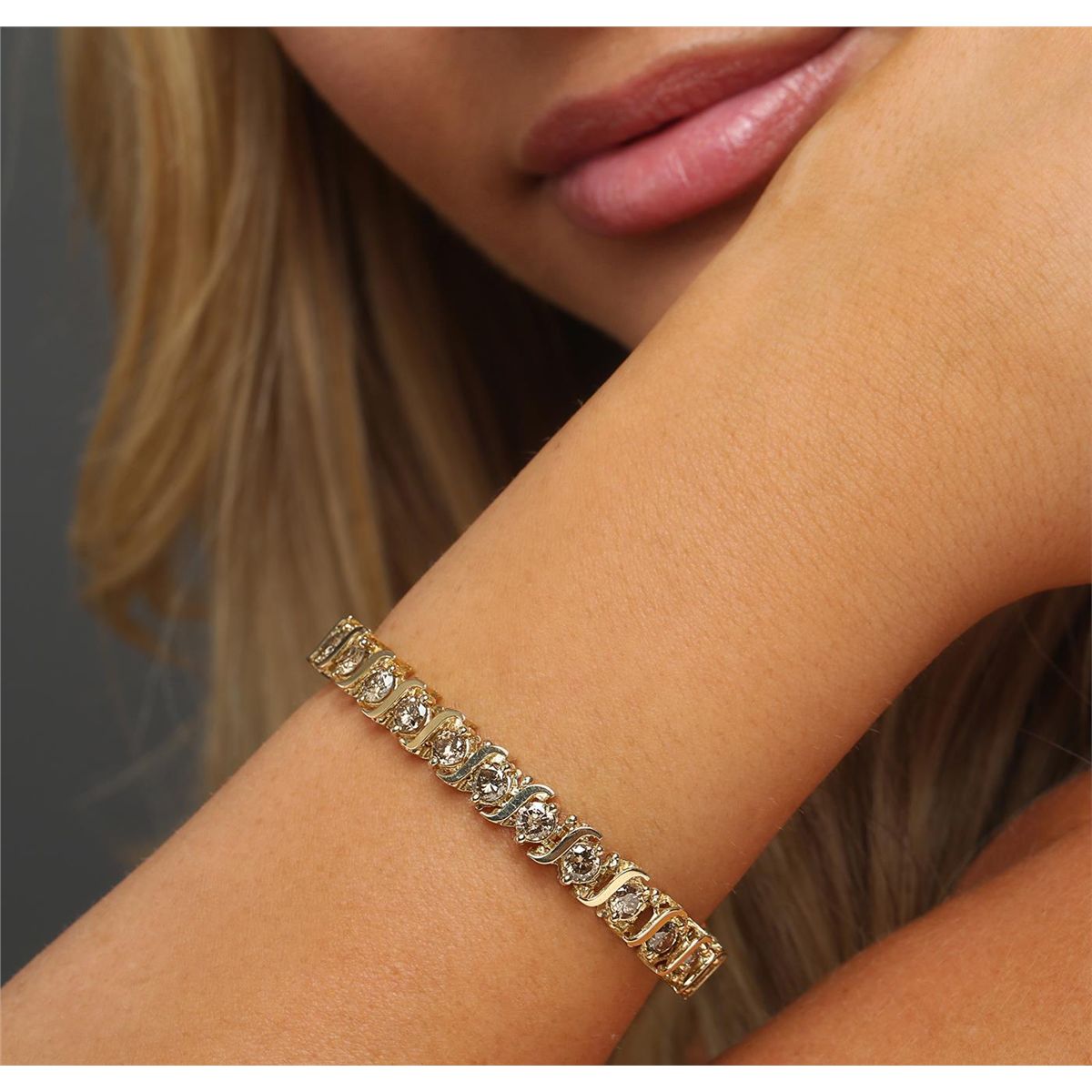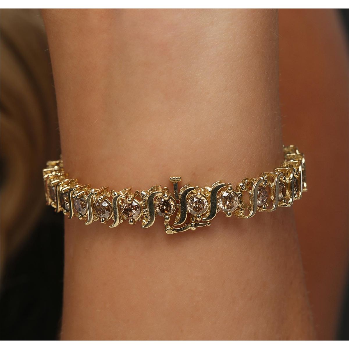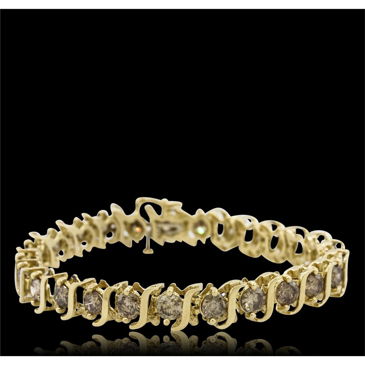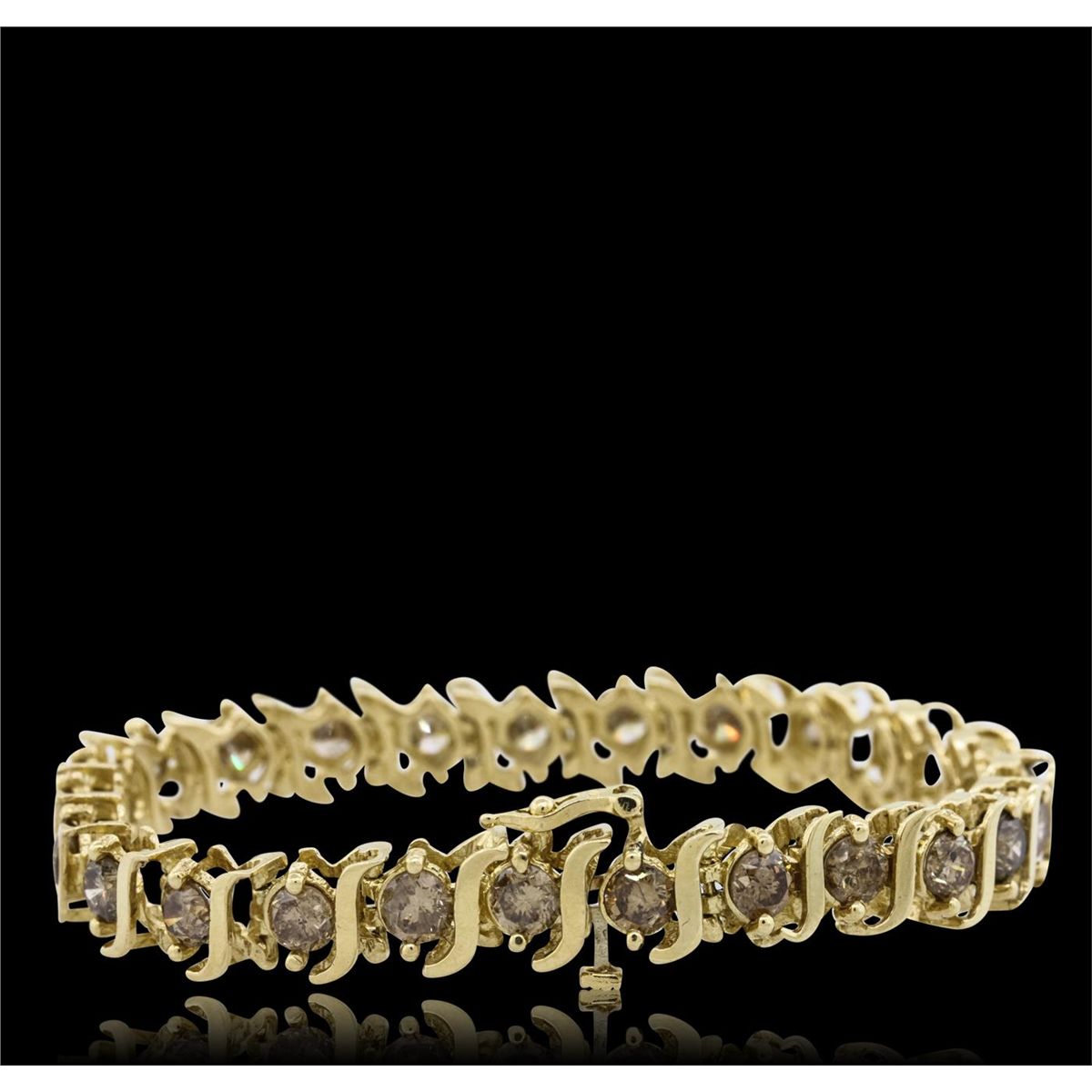 One electronically tested 14KT yellow gold ladies cast & assembled diamond "S" link bracelet. Seven inch length bracelet features a flexible diamond and "S" link ribbon, terminating in a concealed clasp with safety. Bright polish finish. Identified with markings of "14K". Condition is new, good workmanship. Containing: Twenty-Five prong set round brilliant cut diamonds, measuring 4.50 - 4.40 x 2.70mm (depth est.) approximate total weight of 25 Stones = 8.25ct. Color grade is an average for the group. Graded in the setting. Clarity: I-1 to I-2. Total Weight of Diamonds 8.25ct. Total Weight of Bracelet 20.83 grams. AIG Appraised at $25,620.00.