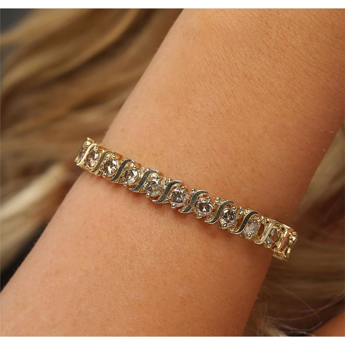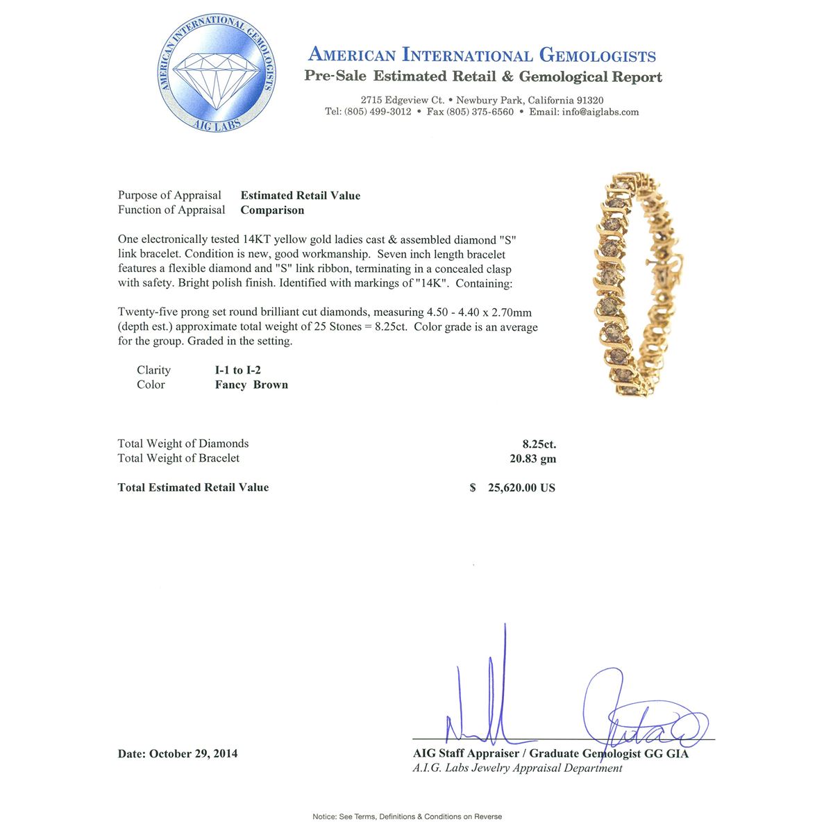 One electronically tested 14KT yellow gold ladies cast & assembled diamond "S" link bracelet. Seven inch length bracelet features a flexible diamond and "S" link ribbon, terminating in a concealed clasp with safety. Bright polish finish. Identified with markings of "14K". Condition is new, good workmanship. Containing: Twenty-Five prong set round brilliant cut diamonds, measuring 4.50 - 4.40 x 2.70mm (depth est.) approximate total weight of 25 Stones = 8.25ct. Color grade is an average for the group. Graded in the setting. Clarity: I-1 to I-2. Total Weight of Diamonds 8.25ct. Total Weight of Bracelet 20.83 grams. AIG Appraised at $25,620.00.