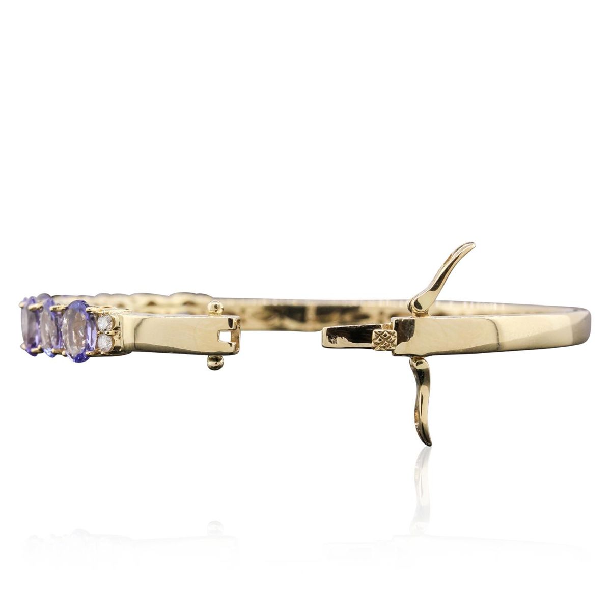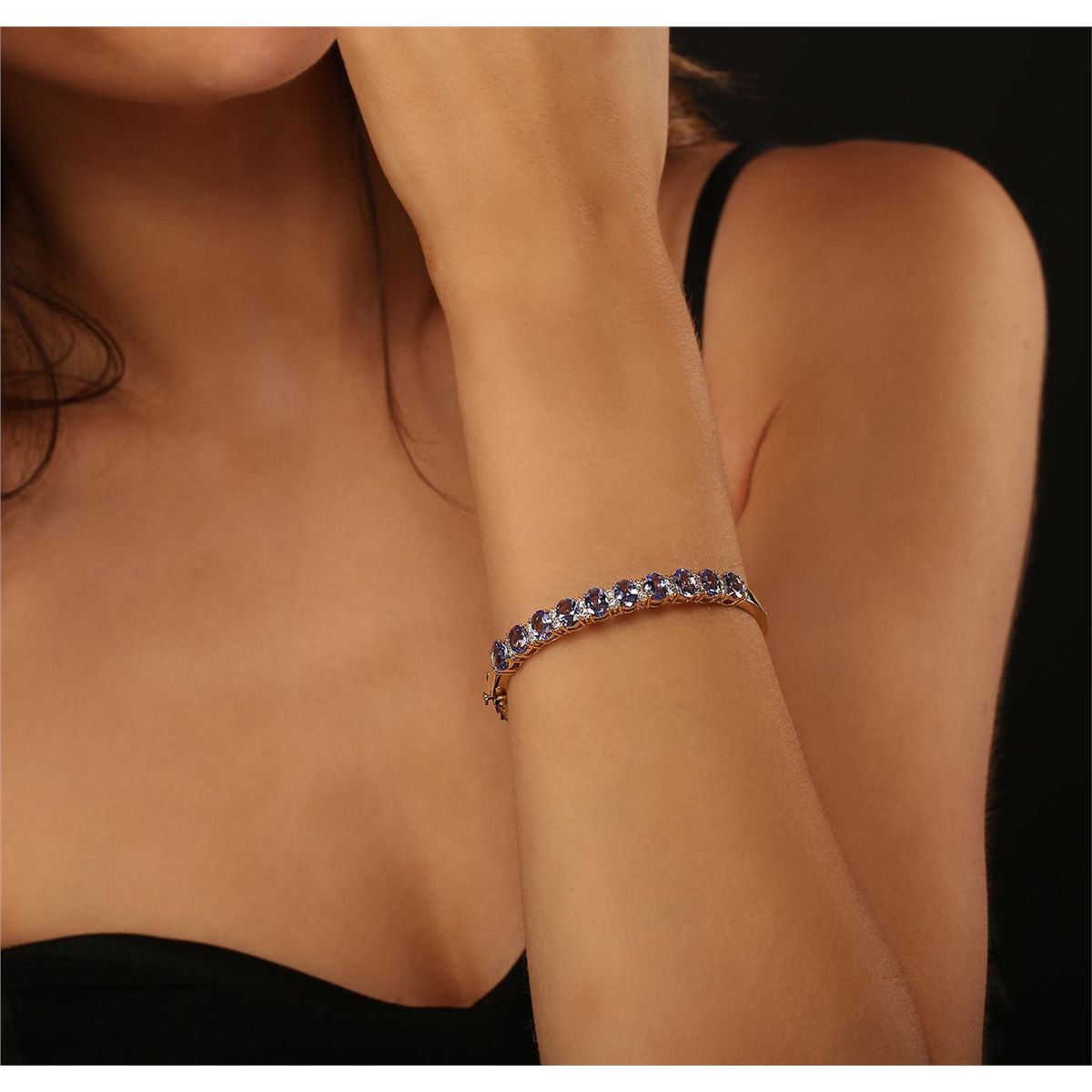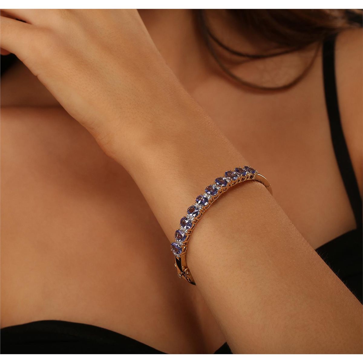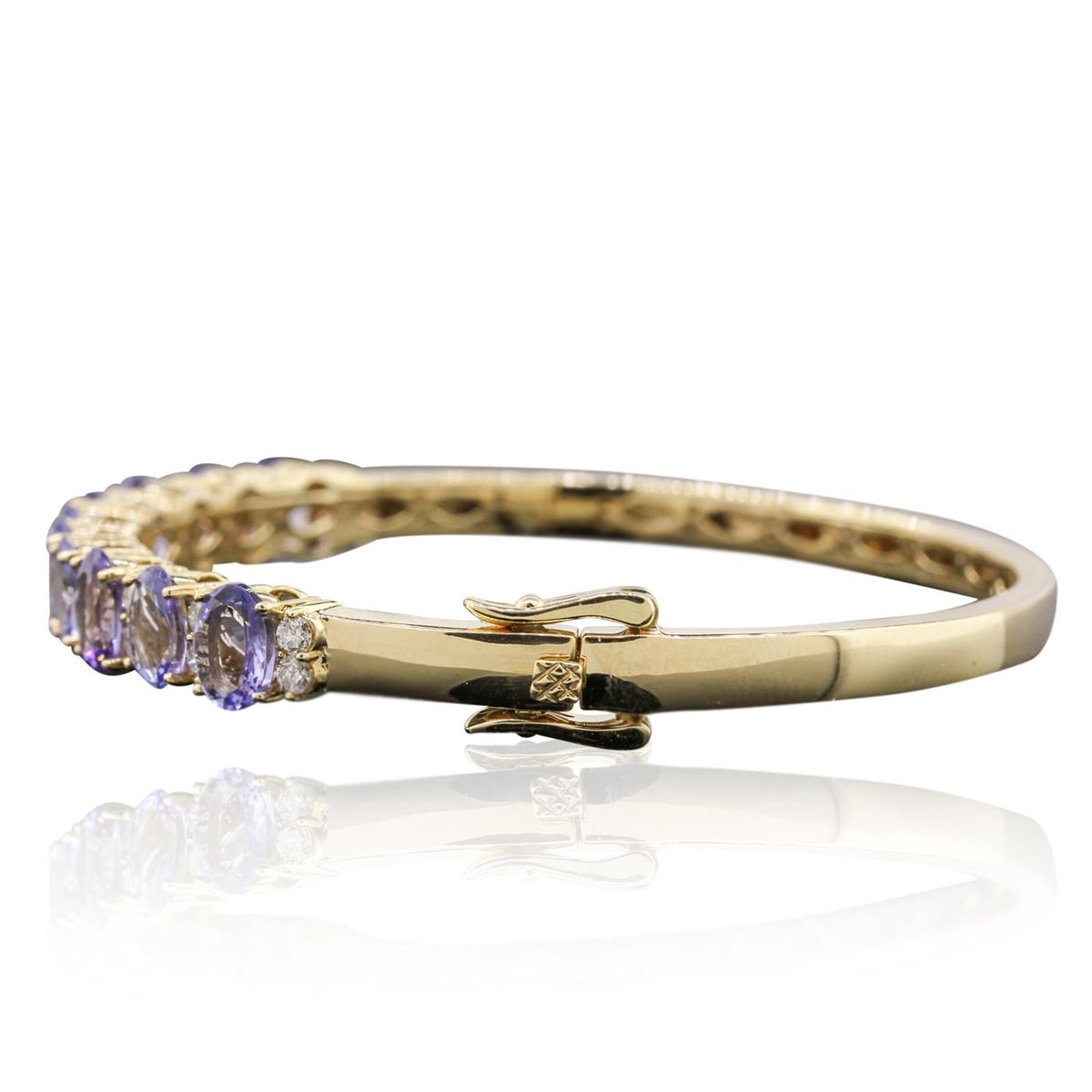 One electronically tested 14KT yellow gold ladies cast tanzanite and diamond bangle bracelet with a bright polish finish. Condition is new, good workmanship. Six and one-half inch length hinged bangle bracelet terminating in a concealed clasp with twin safeties. Identified with markings of "14K". Containing: Ten prong set oval mixed cut natural tanzanites, measuring 7.00 x 5.00 x 3.25mm, 6%. bulge factor, approximate. Total Weight of 8.30ct., clarity is eye clean, type I, medium, very slightly grayish, violet color, (GIA V 5/3), cut is good. Transmitting light with a minimum of distortion, transparent. Measurements & the color grade are an average for the group. Graded in the setting. Tanzanite is a very rare gemstone that is only found in the country of Tanzania. Originally discovered in 1967. Tiffany & Company, named the stone Tanzanite. It is found in the Usumburu Mountains that border the Umba Valley of northern Tanzania. Tanzanite occurs in gray, brown, violet, blue, reddish-purple, & green. The gem is interesting because of its exceptional pleochroism. Rotated in different directions a tanzanite will exhibit multiple changes of color. Tanzanite has a low tolerance to ultrasonic cleaning, and should not be cleaned using this method. Twenty prong set round brilliant cut diamonds, measuring 2.30 - 2.10 x 1.32mm (depth est.) approximate. Total Weight of 20 Stones = 0.87ct. Graded in the setting. Clarity: I-1 to I-2. Color: G - I. Total Weight of Colored Stones 8.30ct. Total Weight of Diamonds 0.87ct. Total Weight of Bangle Bracelet 19.90 grams. AIG Appraised at $9,630.00.