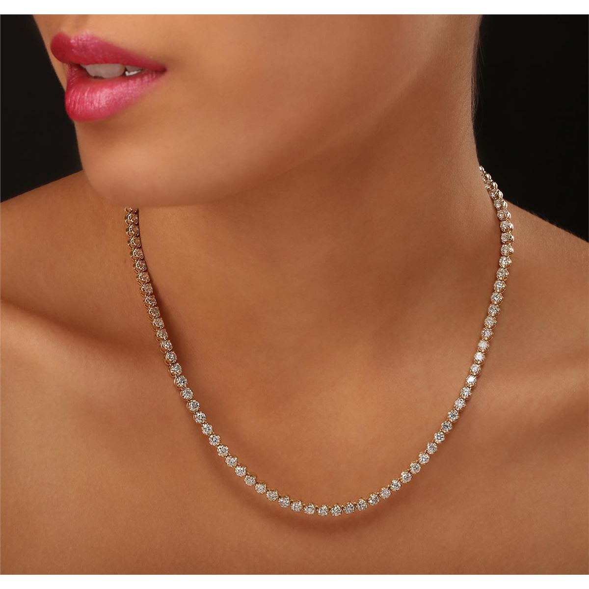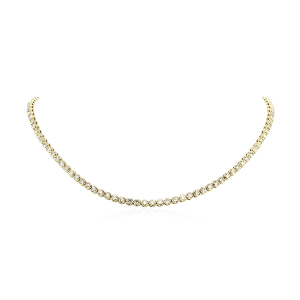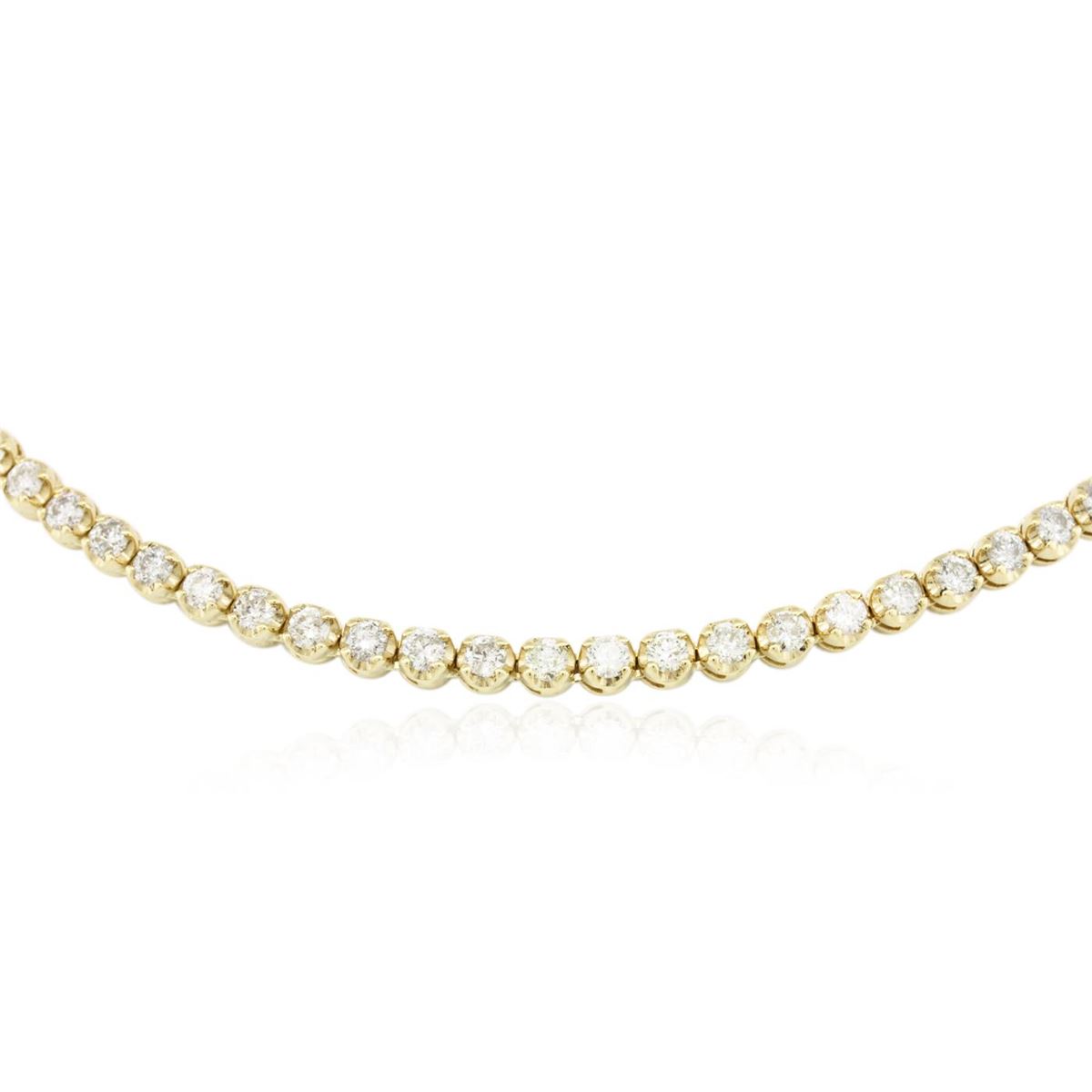 One electronically tested 14KT yellow gold ladies combination cast & assembled necklace with a hidden box clasp with a bright polish finish. Condition is new. Measurements: 16.50" in length. Identified with markings of "14K". Containing: One Hundred Four prong set round brilliant cut diamonds, measuring 2.80 - 2.80 x 1.68mm (depth est.) approximate total weight of 104 Stones = 8.35ct. Clarity: I-1 to I-2. Color: I - J, Cut is Good. All diamonds are graded in the mounting, unless otherwise stated. Total Weight of Diamonds 8.35ct. Total Weight of Necklace 26.10 grams. GGL Appraised at $25,315.00.