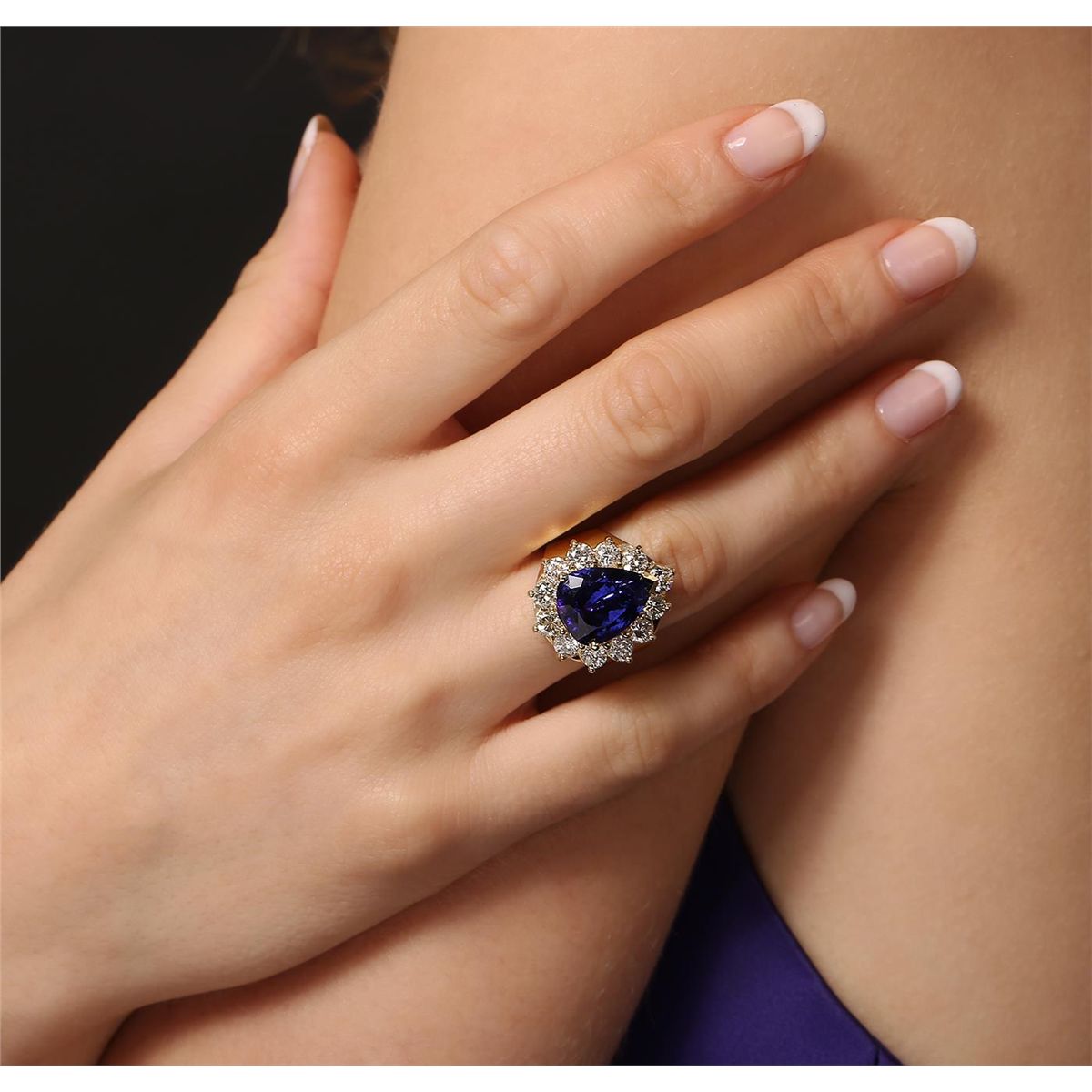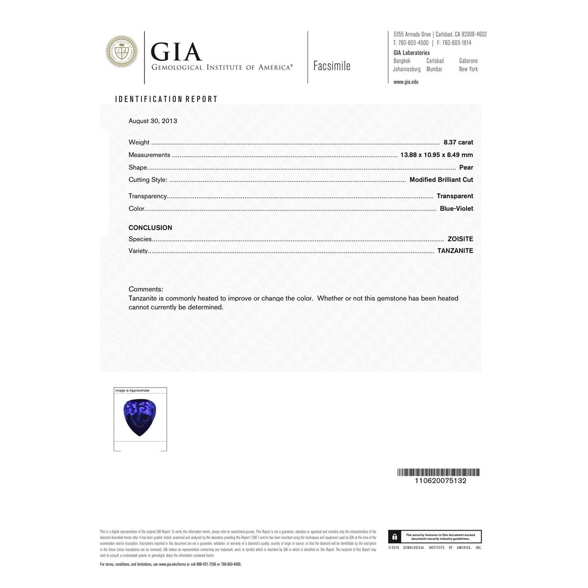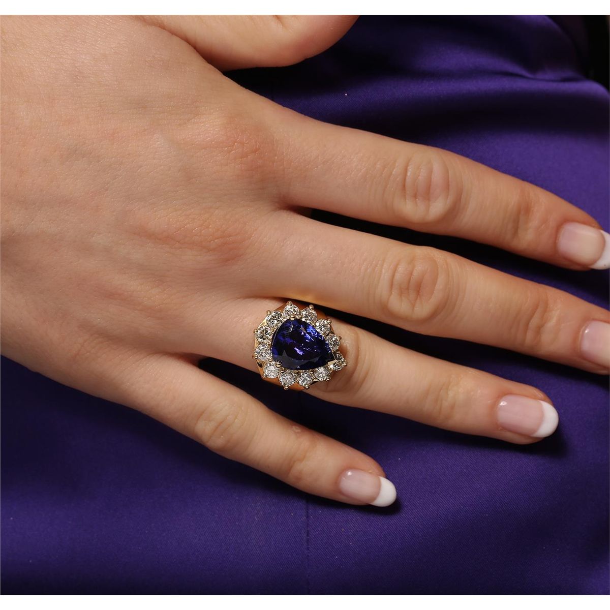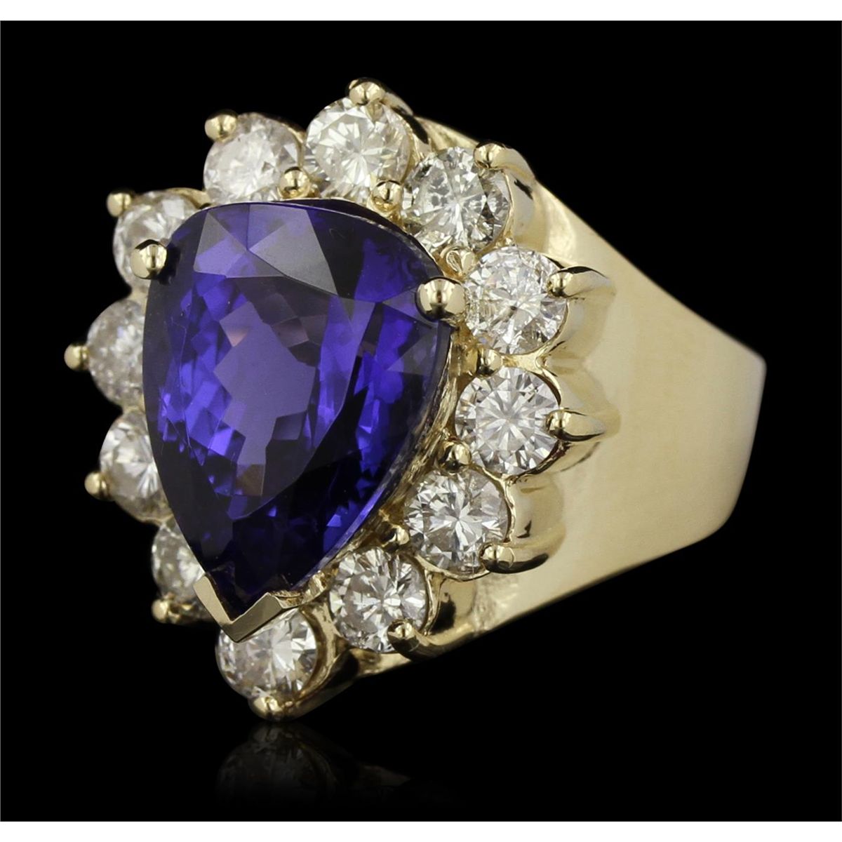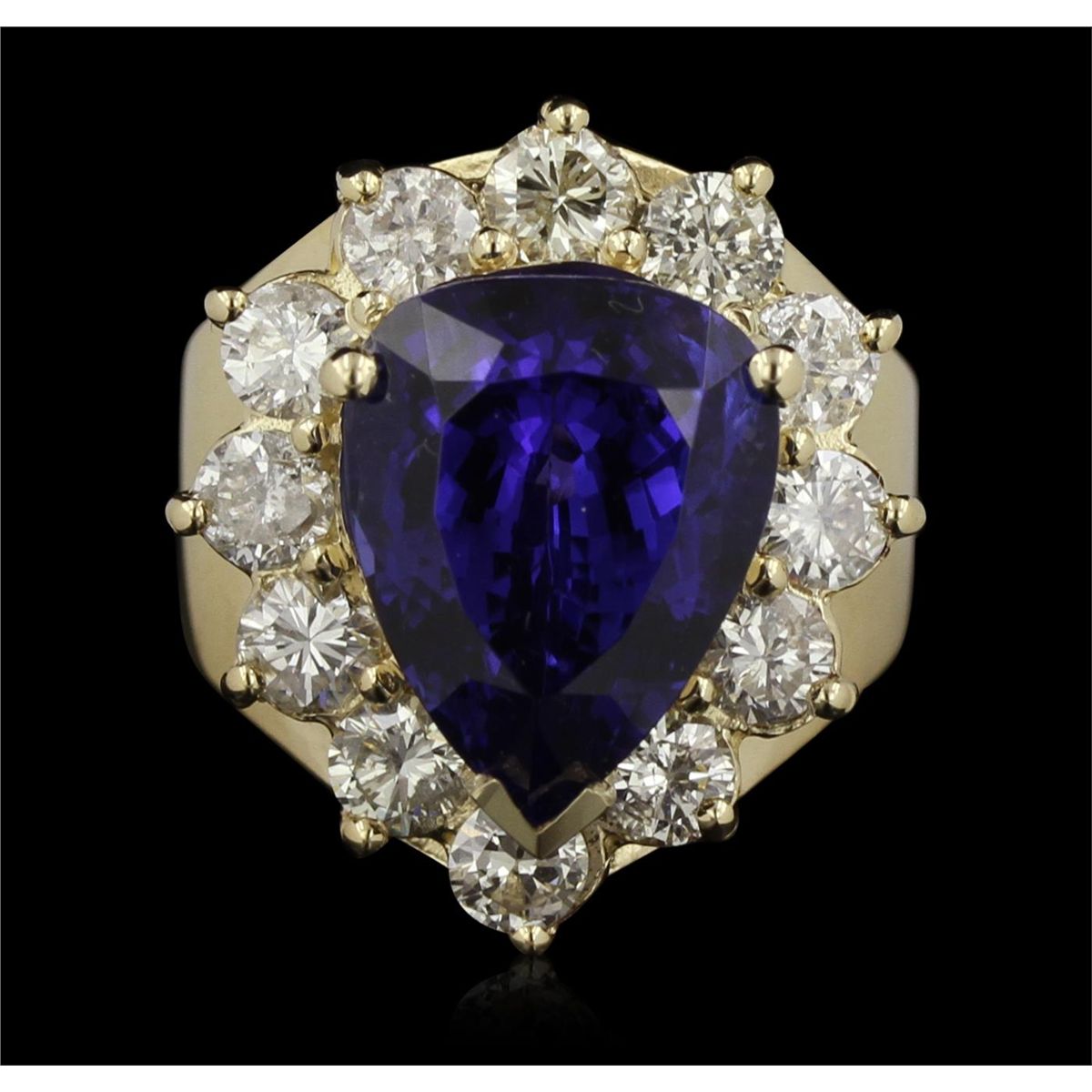One electronically tested 14KT yellow gold ladies cast tanzanite and diamond ring with a bright polish finish. The featured tanzanite is set within a diamond bezel supported by tapering shoulders, completed by a four and one-half millimeter wide band. Ring size 6.00.Identified with markings of "14K". Condition is new, good workmanship. Containing: One prong set pear modified brilliant cut natural tanzanite, measuring 13.88 x 10.95 x 8.49mm, exact weight 8.37ct., clarity is eye clean, type I, medium dark, moderately strong, blue-violet color, (GIA BV), cut is good. Transmitting light with no distortion, transparent. GIA Colored Stone Grading Report attached. Graded loose prior to setting in the GIA Laboratory, Report #6157633269. Tanzanite is a very rare gemstone that is only found in the country of Tanzania. Originally discovered in 1967. Tiffany & Company, named the stone Tanzanite. It is found in the Usumburu Mountains that border the Umba Valley of northern Tanzania. Tanzanite occurs in gray, brown, violet, blue, reddish-purple, & green. The gem is interesting because of its exceptional pleochroism. Rotated in different directions a tanzanite will exhibit multiple changes of color. Tanzanite has a low tolerance to ultrasonic cleaning, and should not be cleaned using this method. Twelve prong set round brilliant cut diamonds, measuring 3.60 - 3.50 x 2.13mm (depth est.) approximate total weight of 12 Stones = 2.22ct. Graded in the setting. Clarity I-I to I-2. Color I - K. Total Weight of Colored Stones 8.37ct. Total Weight of Diamonds 2.22ct. Total Weight of Ring 12.68gm. AIGAppraised at $27,985.00.