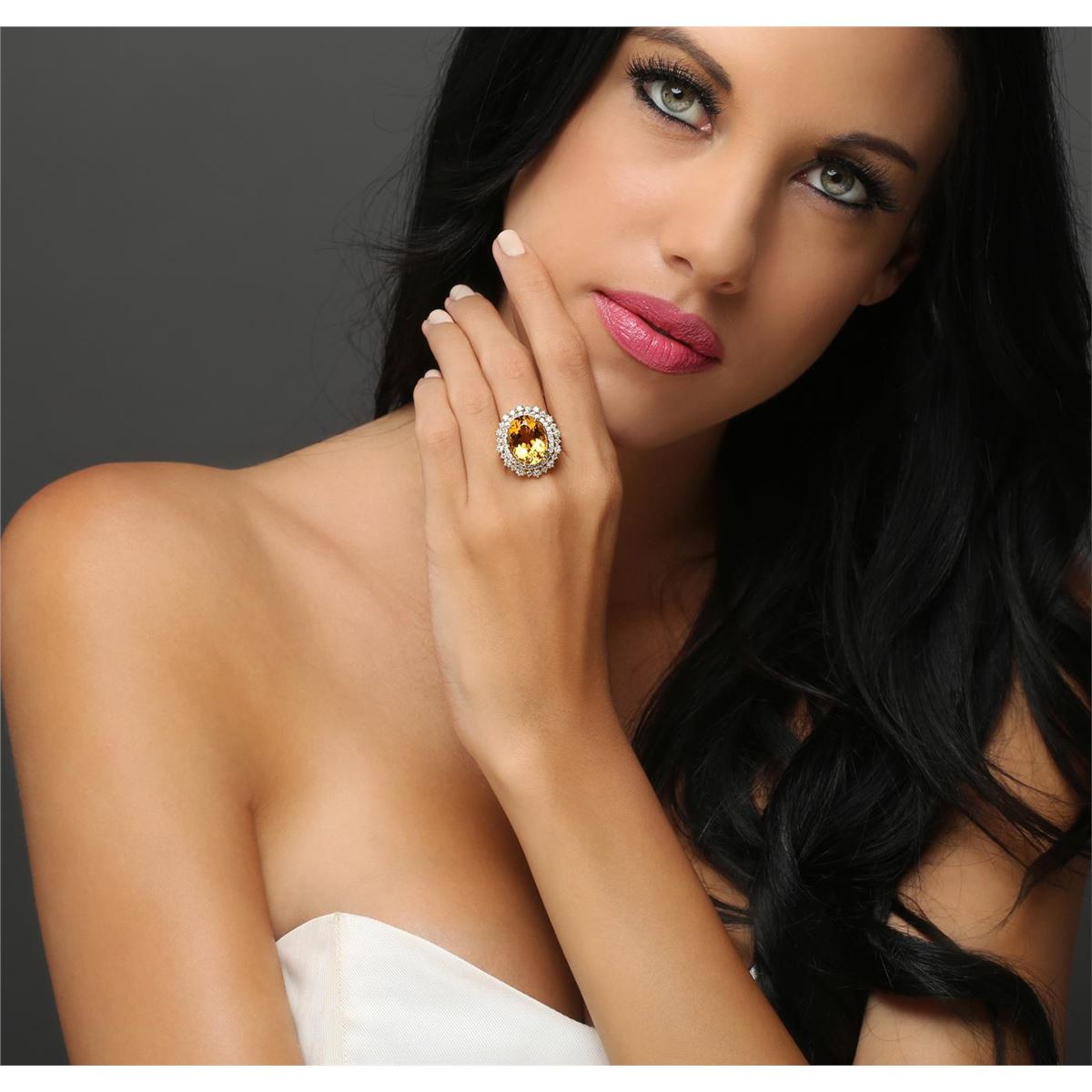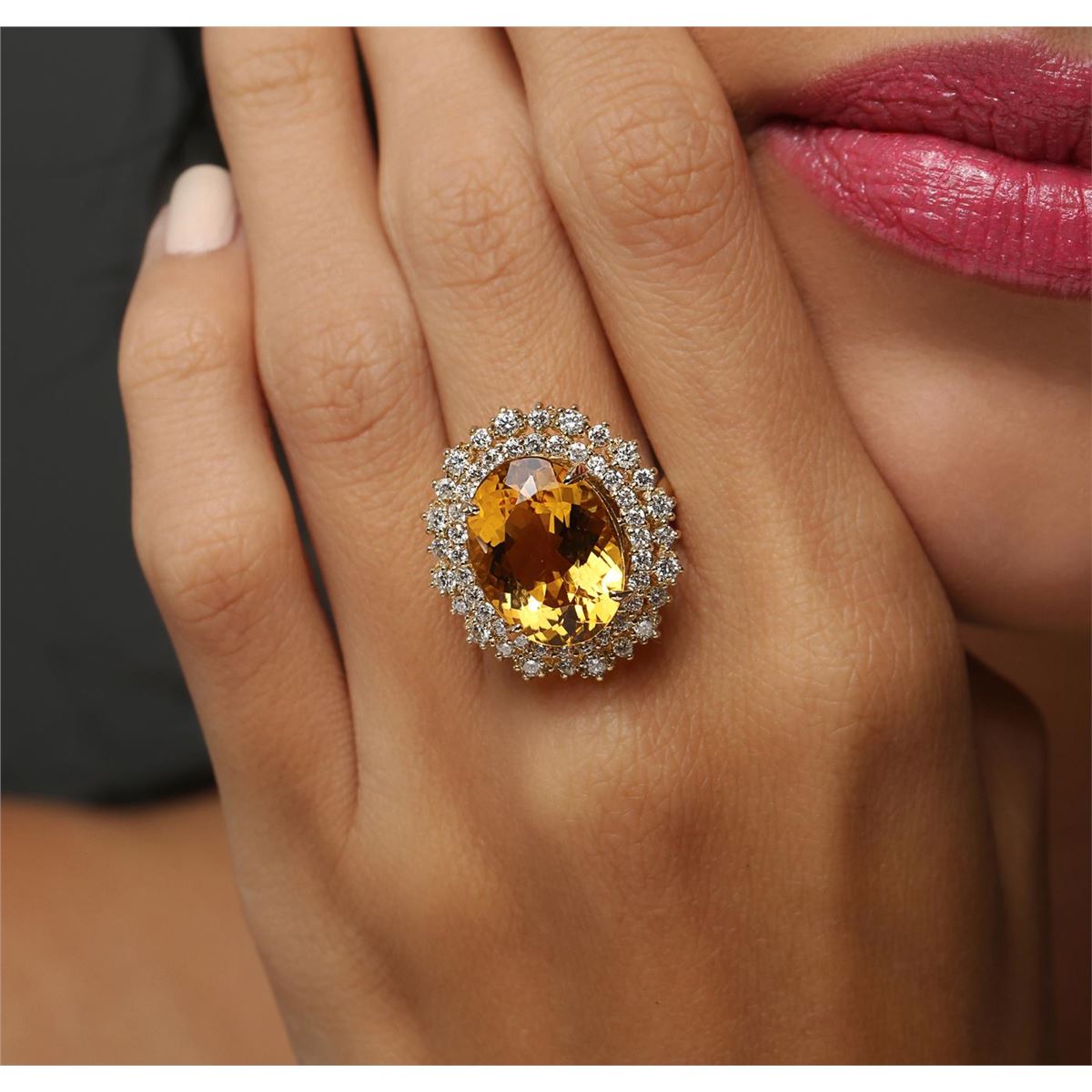 One electronically tested 14KT yellow gold ladies combination cast & assembled citrine and diamond ring with a flat shank with a bright polish finish. Identified with markings of "K14". Condition is new. Containing: One prong set oval modified brilliant cut natural citrine quartz, measuring 16.11 x 12.22 x 8.02mm, approximate weight of 8.56ct., clarity is eye clean, type I, medium light, brownish, orangy yellow color, (GIA oY 4/3), cut is good. Fifty-Two prong set round brilliant cut diamonds, measuring 1.90 - 1.40 x 0.99mm (depth est.) approximate total weight of 52 Stones = 0.85ct. Clarity: SI-1 to SI-2. Color: J - K, Cut is Good. Colored gemstones are presumed to have been subjected to commonly used enhancement processes. All diamonds and colored gemstones are graded in the mounting, unless otherwise stated. Total Weight of Colored Stones 8.56ct. Total Weight of Diamonds 0.85ct. Total Weight of Ring 9.60 grams. GGL Appraised at $4,560.00.