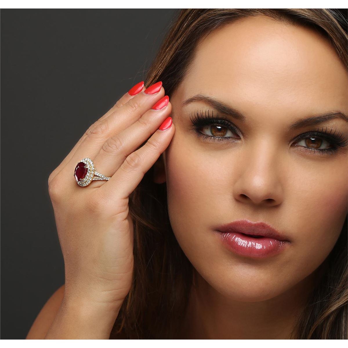 One electronically tested 14KT yellow gold Ladies combination cast & assembled ring with a bright polish finish. Condition is new. Identified with markings of "K14". Containing: One prong set oval modified brilliant cut natural ruby, measuring 13.50 x 10.50 x 7.43mm, approximate weight of 8.56ct., clarity is heavily included, type II, medium, moderately strong, strongly purplish red color, (GIA stpR 5/4), cut is good. Colored gemstones are presumed to have been subjected to commonly used color/clarity enhancement processes. Sixty-Nine prong set round brilliant cut diamonds, measuring 1.70 - 1.70 x 1.02mm (depth est.) approximate. Total Weight of 69 Stones = 1.24ct. Clarity: I-1 to I-2. Color: H - I, Cut is Good. Total Weight of Colored Stones 8.56ct. Total Weight of Diamonds 1.24ct. Total Weight of Ring 8.60 grams. GGL Appraised at $8,360.00.