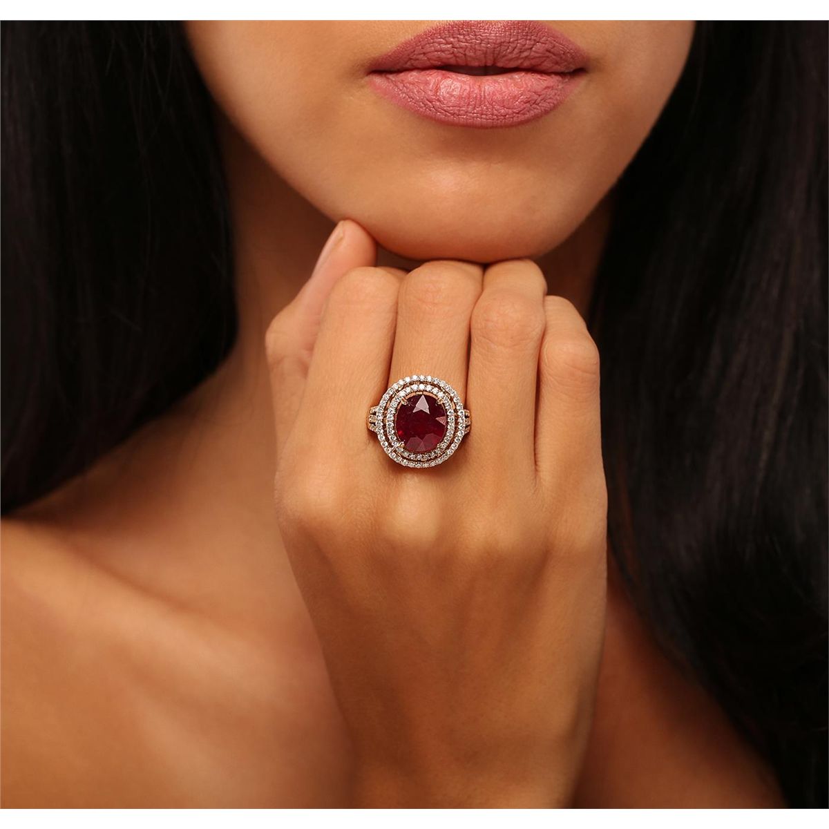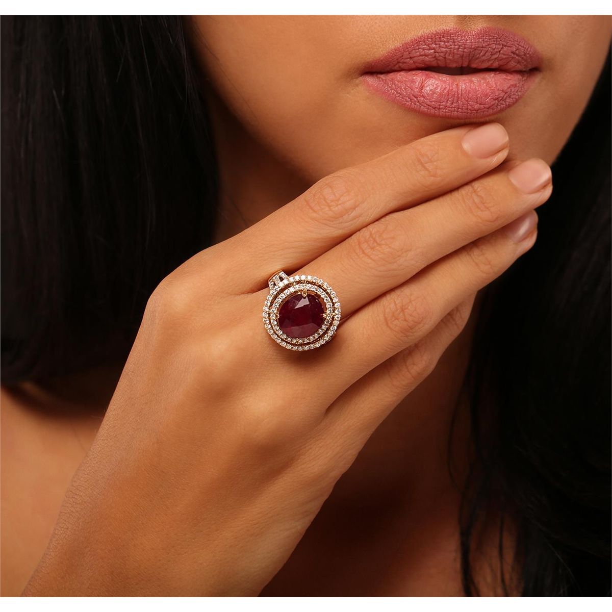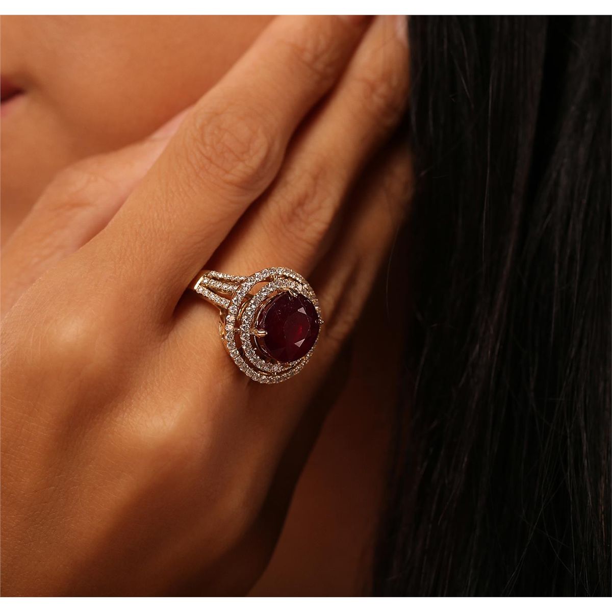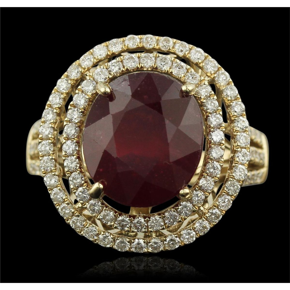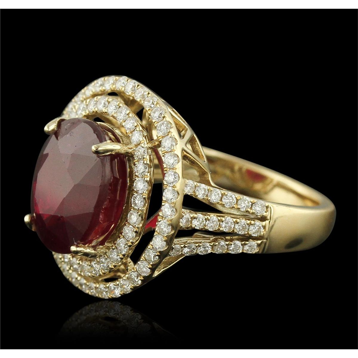 One electronically tested 14KT yellow gold Ladies combination cast & assembled fancy ring with a high polish finish. Condition is new. Identified with markings of "14K". Containing: One Hundred Four bead set round brilliant cut diamonds, measuring 1.30 - 1.30 x 0.78mm (depth est.) approximate. Total Weight of 104 Stones = 1.15ct. Clarity: SI-1 to SI-2. Color: G - H, Cut is Good. One prong set oval modified brilliant cut natural ruby, measuring 11.80 x 10.49 x 7.60mm, approximate weight of 8.78ct., clarity is heavily included, type II, medium dark, moderately strong, strongly purplish red color, (GIA stpR 6/4), cut is good. Colored gemstones are presumed to have been subjected to commonly used color/clarity enhancement processes. Total Weight of Colored Stones 8.78ct. Total Weight of Diamonds 1.15ct. Total Weight of Ring 8.30 grams. GGL Appraised at $9,000.00.
