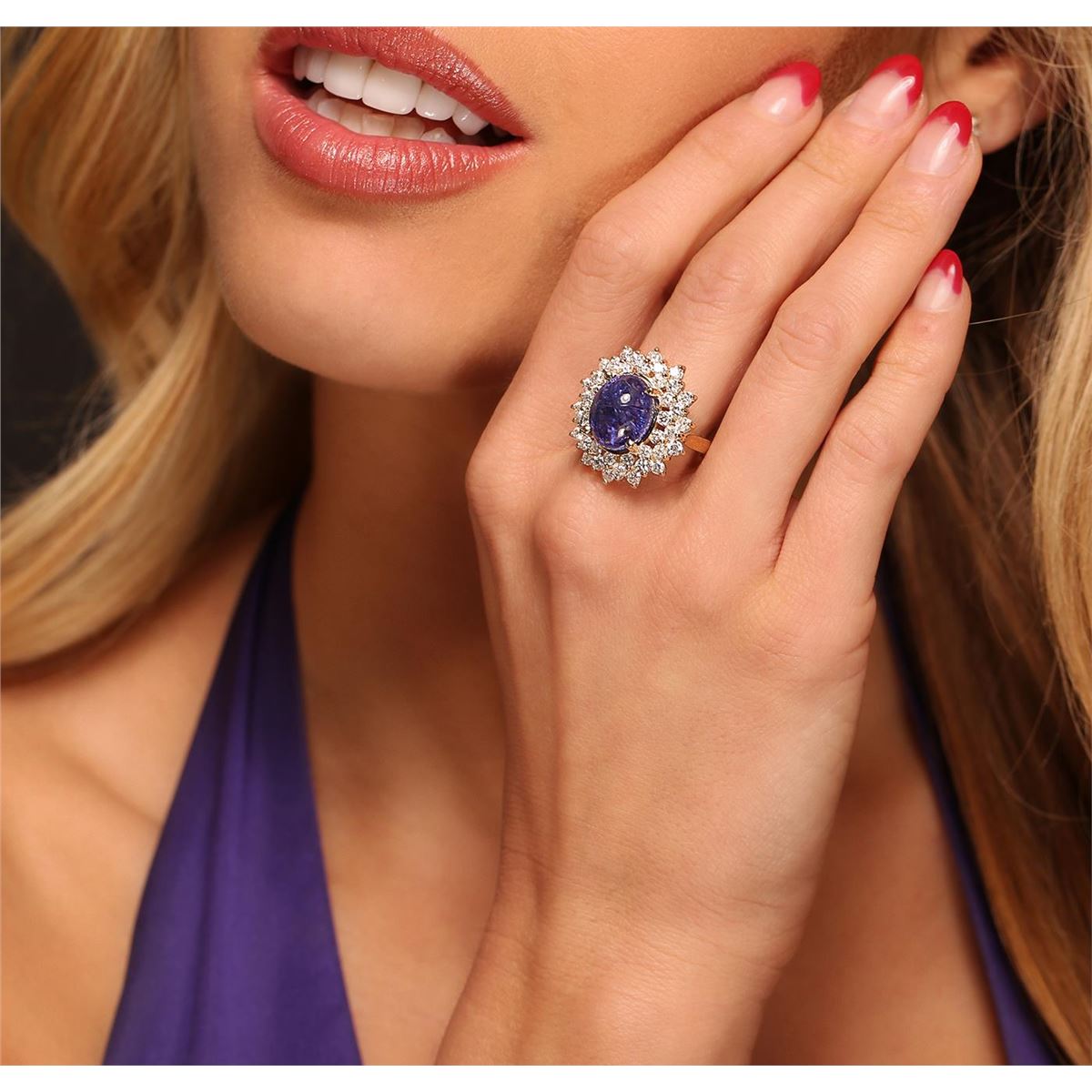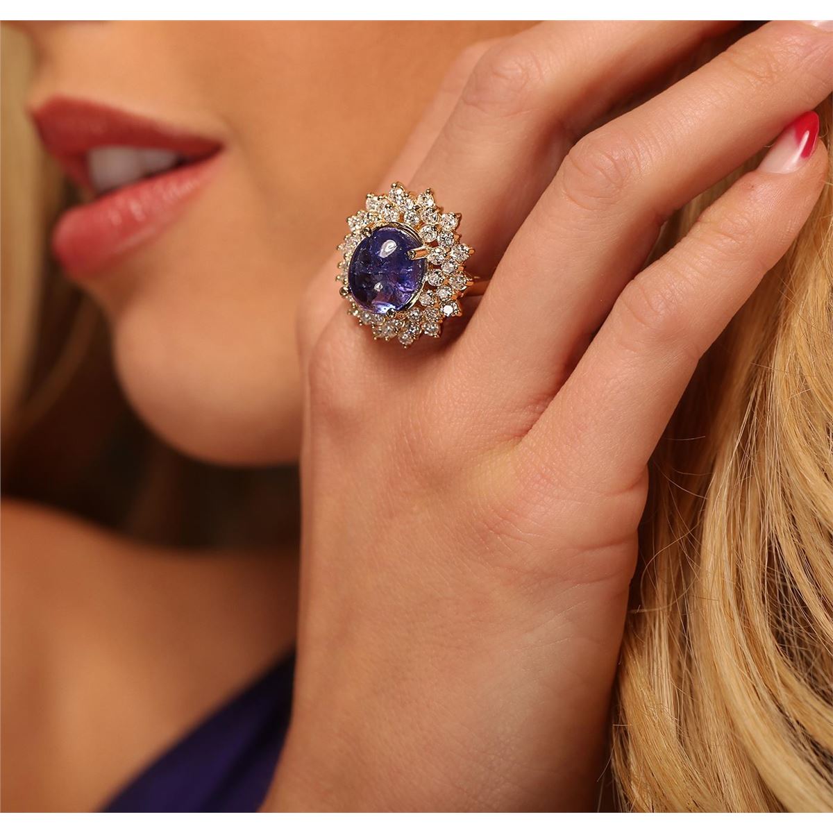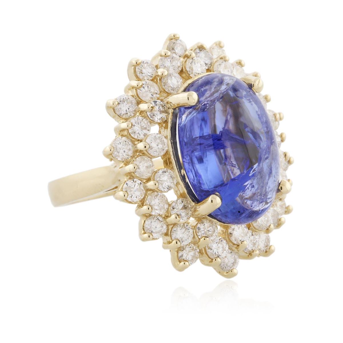 One electronically tested 14KT yellow ladies cast tanzanite and diamond ring with a bright polish finish. The featured tanzanite is set within tiered diamond bezels supported by tapering shoulders, completed by a two and one-half millimeter wide band. Identified with markings of "K14". Condition is new, good workmanship. Containing: One prong set oval cabochon cut natural tanzanite, measuring 15.50 x 10.05 x 5.50mm, 15%. bulge factor, approximate weight of 8.91ct., clarity is moderately included, type I, medium dark, moderately strong, bluish violet color, (GIA bV 6/4), cut is good. Transmitting light somewhat diffusely, transparent to translucent. Naturally occurring internal & external characteristics are present. Colored Stone Grading Report attached. Graded in the setting. Tanzanite is a very rare gemstone that is only found in the country of Tanzania. Originally discovered in 1967. Tiffany & Company, named the stone Tanzanite. It is found in the Usumburu Mountains that border the Umba Valley of northern Tanzania. Tanzanite occurs in gray, brown, violet, blue, reddish-purple, & green. The gem is interesting because of its exceptional pleochroism. Rotated in different directions a tanzanite will exhibit multiple changes of color. Tanzanite has a low tolerance to ultrasonic cleaning, and should not be cleaned using this method. Forty-Two prong set round brilliant cut diamonds, measuring 2.50 - 2.40 x 1.47mm (depth est.) approximate. Total Weight of 42 Stones = 2.36ct. Graded in the setting. Clarity: SI-1 to I-1. Color: H - J. Total Weight of Colored Stones 8.91ct. Total Weight of Diamonds 2.36ct. AIG Appraised at $14,730.00.