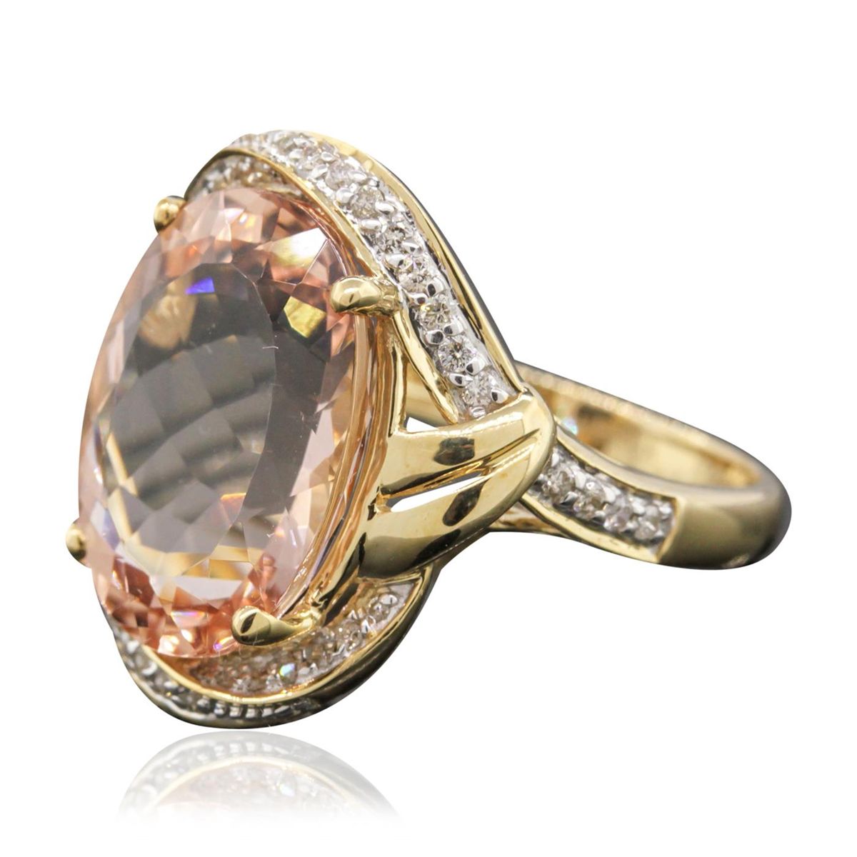 One ring featuring: 14KT yellow gold with a total weight of 4.56 grams, (1) morganite with a total weight of 8.95ct, and (40) diamonds with a total weight of 0.23ctw.