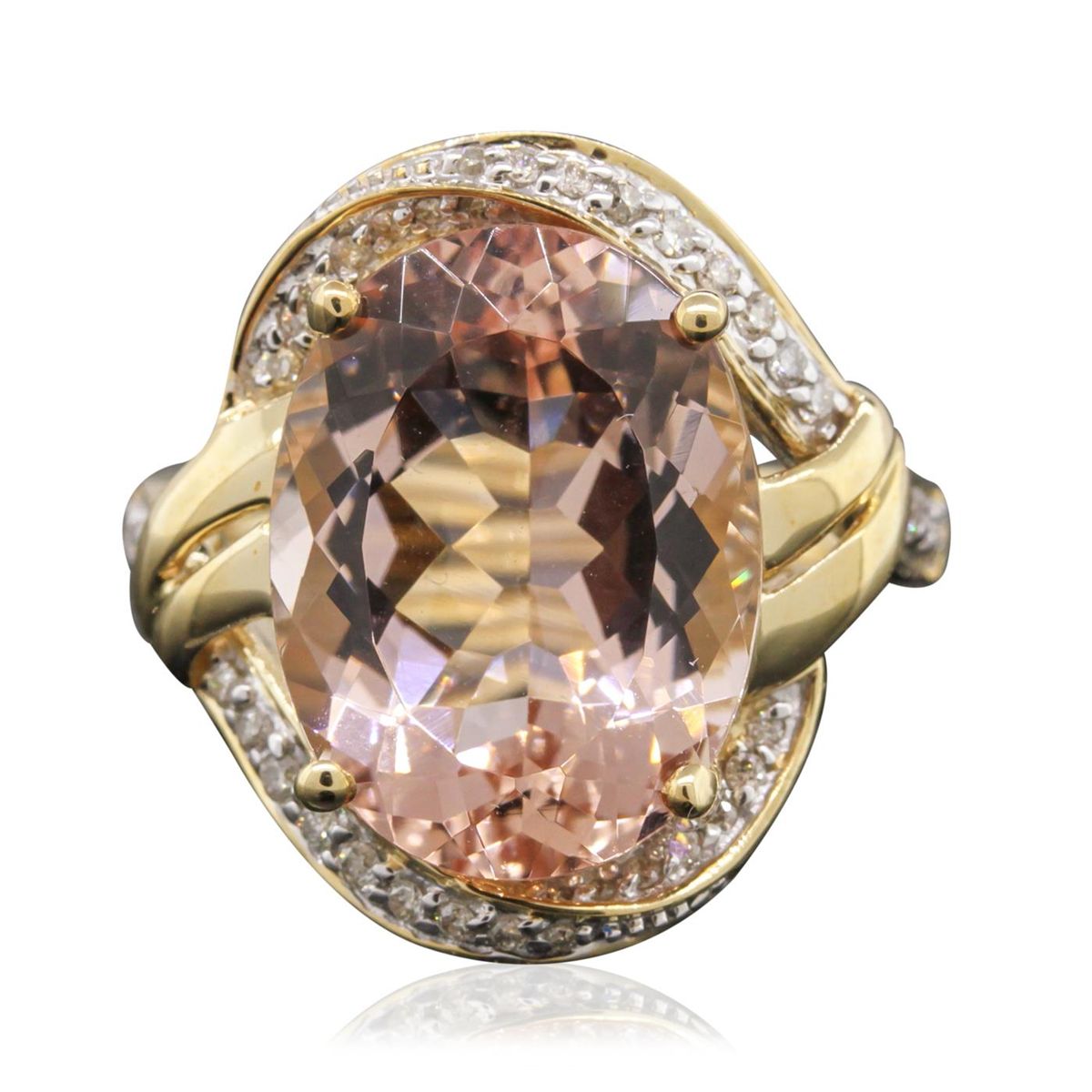 One ring featuring: 14KT yellow gold with a total weight of 4.56 grams, (1) morganite with a total weight of 8.95ct, and (40) diamonds with a total weight of 0.23ctw.