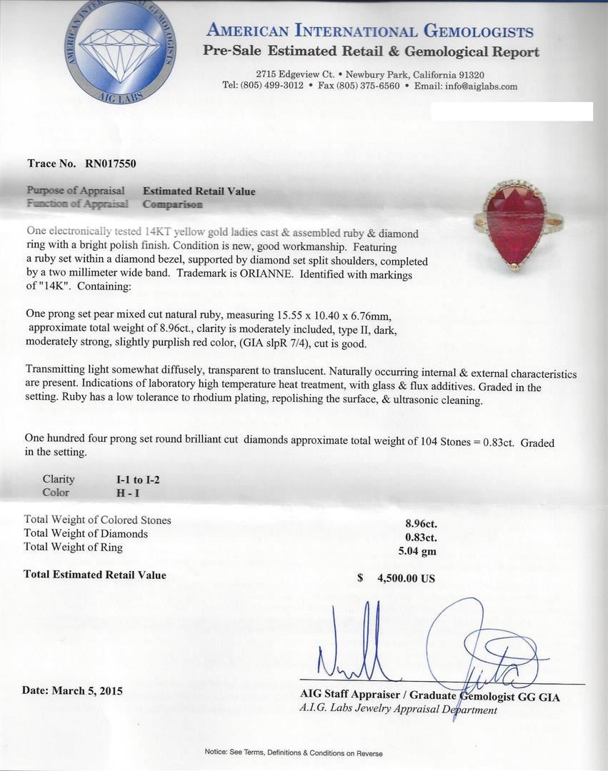One electronically tested 14KT yellow gold ladies cast & assembled ruby & diamond ring with a bright polish finish. Featuring a ruby set within a diamond bezel, supported by diamond set split shoulders, completed by a two millimeter wide band. Trademark is ORIANNE. Identified with markings of "14K". Condition is new, good workmanship. Containing: One prong set pear mixed cut natural ruby, measuring 15.55 x 10.40 x 6.76mm, approximate total weight of 8.96ct., clarity is moderately included, type II, dark, moderately strong, slightly purplish red color, (GIA slpR 7/4), cut is good. Transmitting light somewhat diffusely, transparent to translucent. Naturally occurring internal & external characteristics are present. Indications of laboratory high temperature heat treatment, with glass & flux additives. Graded in the setting. Ruby has a low tolerance to rhodium plating, repolishing the surface, & ultrasonic cleaning. One Hundred Four prong set round brilliant cut diamonds approximate total weight of 104 Stones = 0.83ct. Graded in the setting. Clarity: I-1 to I-2. Color: H - I. Total Weight of Colored Stones 8.96ct. Total Weight of Diamonds 0.83ct. Total Weight of Ring 5.04 grams. AIG Appraised at $4,500.00.
