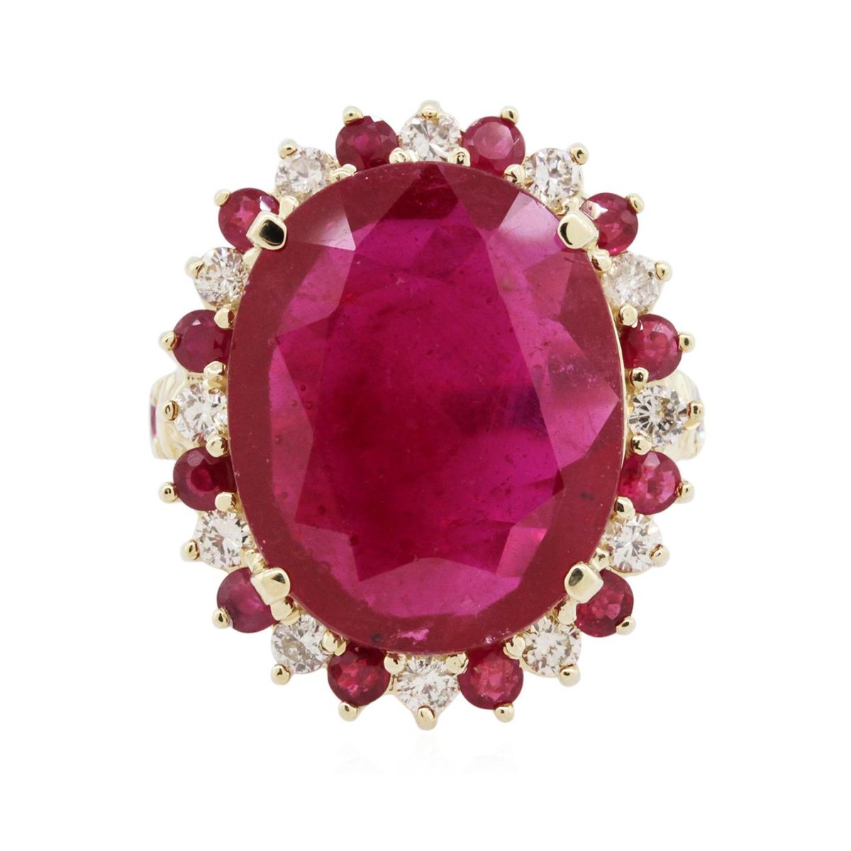 One electronically tested 14KT yellow gold ladies cast ruby & diamond ring with a bright finish. The featured ruby is set within a diamond and ruby bezel, supported by a ribbed under gallery and ruby & diamond set shoulders, completed by a two millimeter wide band. Identified with markings of "K14". Condition is new, good workmanship. Containing: One prong set oval mixed cut natural ruby, measuring 18.00 x 14.00 x 3.88mm, approximate weight of 7.95ct., clarity is heavily included, type II, dark, very slightly brownish, slightly purplish red color, (GIA slpR 7/3), cut is good. Transmitting light somewhat diffusely, transparent to translucent. Naturally occurring internal & external characteristics are present. Indications of laboratory high temperature heat treatment, with glass & flux additives. Graded in the setting. Ruby has a low tolerance to rhodium plating, repolishing the surface, & ultrasonic cleaning. Sixteen prong set round mixed cut natural rubies, measuring 2.40 - 2.30 x 1.53 mm, approximate total weight of 1.12ct., clarity is moderately included, type II, dark, slightly brownish, red color, (GIA R 7/2), cut is good. Transmitting light somewhat diffusely, transparent. Naturally occurring internal & external characteristics are present. Indications of laboratory high temperature heat treatment. Graded in the setting. Ruby has a low tolerance to rhodium plating, repolishing the surface, & ultrasonic cleaning. Sixteen prong set round brilliant cut diamonds, measuring 2.35 - 2.20 x 1.36mm (depth est.) approximate total weight of 16 Stones = 0.68ct. Graded in the setting. Clarity: SI-1 to I-1. Color: G - H. Total Weight of Colored Stones 9.07ct. Total Weight of Diamonds 0.68ct. Total Weight of Ring 9.26 grams. AIG Appraised at $4,750.00.