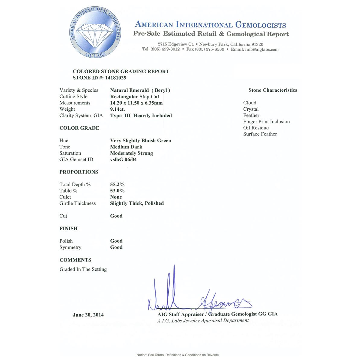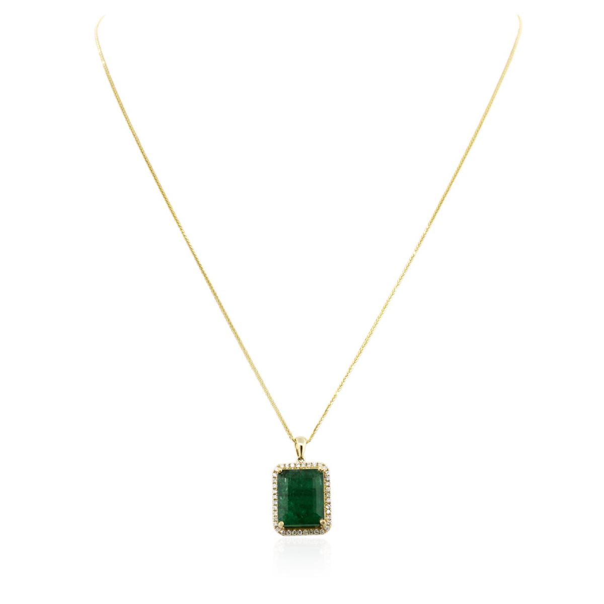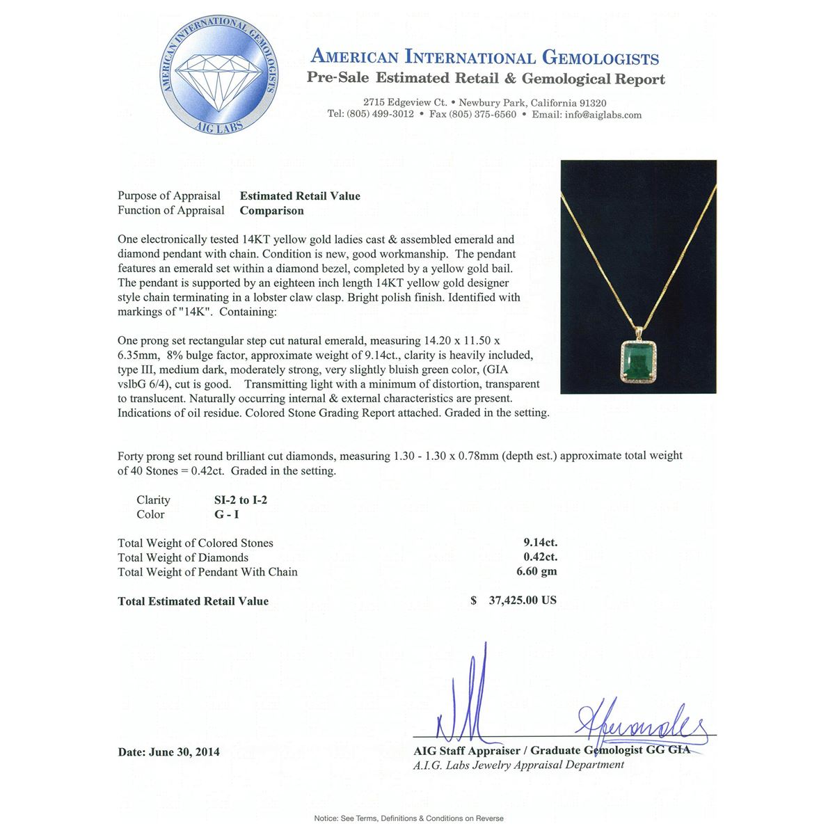 One electronically tested 14KT yellow gold ladies cast & assembled emerald and diamond pendant with chain. Condition is new, good workmanship. The pendant features an emerald set within a diamond bezel, completed by a yellow gold bail. The pendant is supported by an eighteen inch length 14KT yellow gold designer style chain terminating in a lobster claw clasp. Bright polish finish. Identified with markings of "14K". Containing: One prong set rectangular step cut natural emerald, measuring 14.20 x 11.50 x 6.35mm, 8%. bulge factor, approximate weight of 9.14ct., clarity is heavily included, type III, medium dark, moderately strong, very slightly bluish green color, (GIA vslbG 6/4), cut is good. Transmitting light with a minimum of distortion, transparent to translucent. Naturally occurring internal & external characteristics are present. Indications of oil residue. Colored Stone Grading Report attached. Graded in the setting. Forty prong set round brilliant cut diamonds, measuring 1.30 - 1.30 x 0.78mm (depth est.) approximate. Total Weight of 40 Stones = 0.42ct. Graded in the setting. Clarity: SI-2 to I-2. Color: G - I. Total Weight of Colored Stones 9.14ct. Total Weight of Diamonds 0.42ct. Total Weight of Pendant With Chain 6.60 grams. AIG Appraised at $37,425.00.