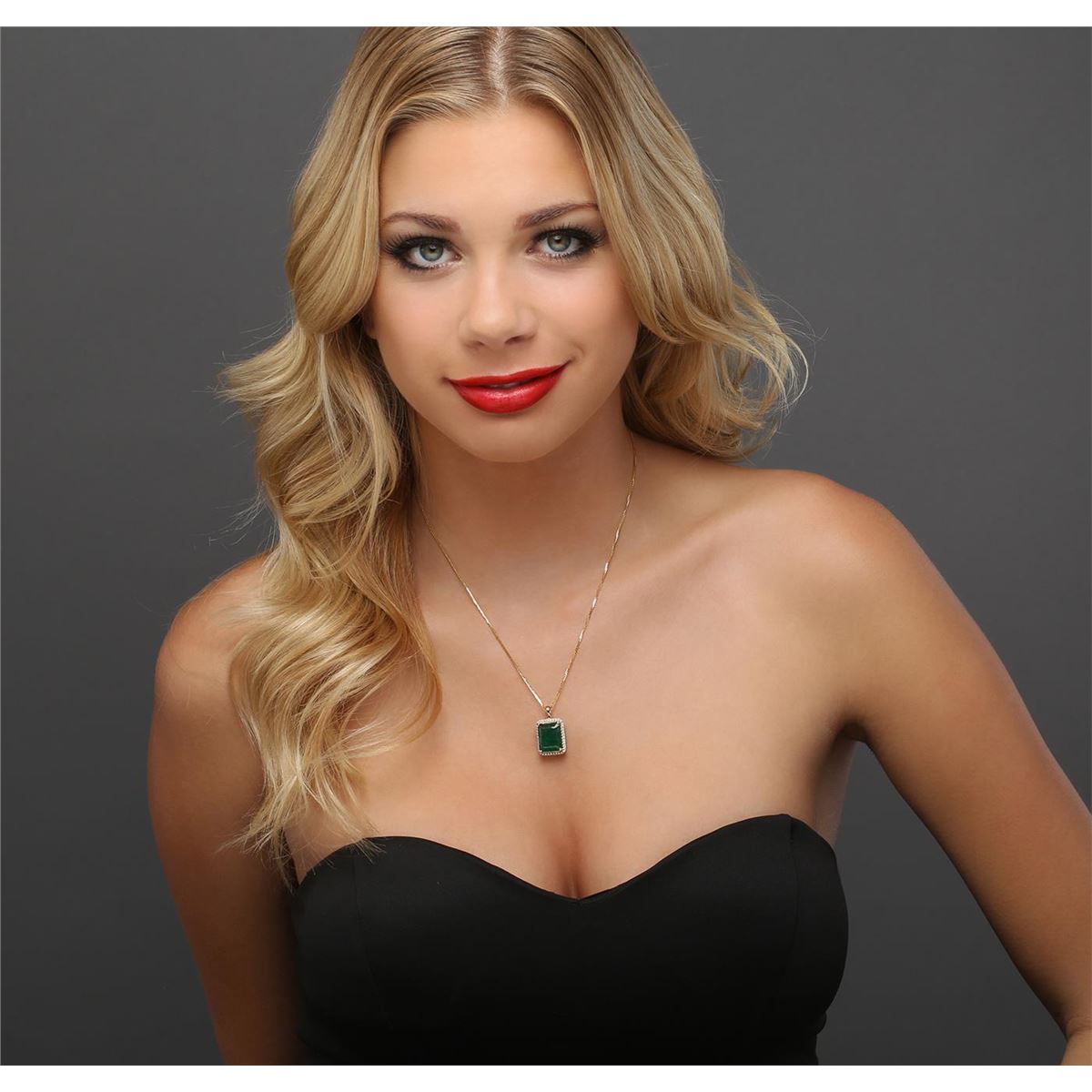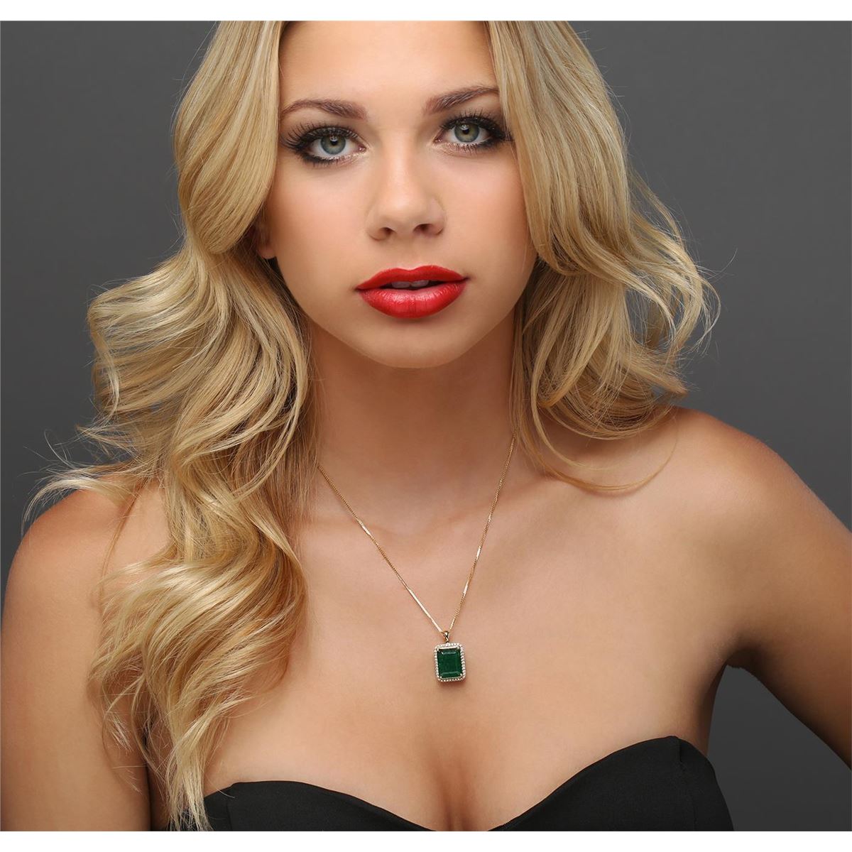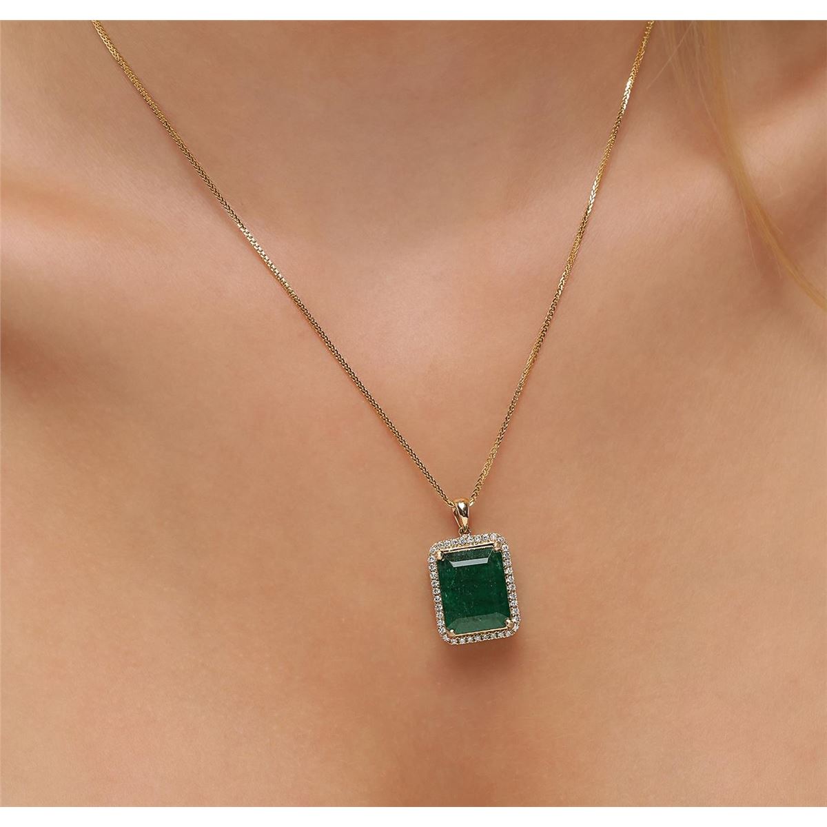 One electronically tested 14KT yellow gold ladies cast & assembled emerald and diamond pendant with chain. Condition is new, good workmanship. The pendant features an emerald set within a diamond bezel, completed by a yellow gold bail. The pendant is supported by an eighteen inch length 14KT yellow gold designer style chain terminating in a lobster claw clasp. Bright polish finish. Identified with markings of "14K". Containing: One prong set rectangular step cut natural emerald, measuring 14.20 x 11.50 x 6.35mm, 8%. bulge factor, approximate weight of 9.14ct., clarity is heavily included, type III, medium dark, moderately strong, very slightly bluish green color, (GIA vslbG 6/4), cut is good. Transmitting light with a minimum of distortion, transparent to translucent. Naturally occurring internal & external characteristics are present. Indications of oil residue. Colored Stone Grading Report attached. Graded in the setting. Forty prong set round brilliant cut diamonds, measuring 1.30 - 1.30 x 0.78mm (depth est.) approximate. Total Weight of 40 Stones = 0.42ct. Graded in the setting. Clarity: SI-2 to I-2. Color: G - I. Total Weight of Colored Stones 9.14ct. Total Weight of Diamonds 0.42ct. Total Weight of Pendant With Chain 6.60 grams. AIG Appraised at $37,425.00.
