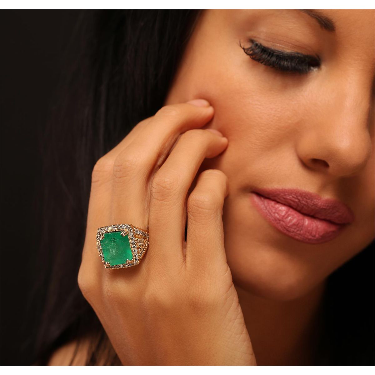 One electronically tested 14KT yellow gold Ladies combination cast & assembled ring with a bright polish finish. Condition is new. Containing: One prong set emerald standard step cut natural emerald, measuring 13.67 x 11.78 x 7.77mm, approximate weight of 9.19ct., clarity is heavily included, type III, medium, moderately strong, green color, (GIA G 5/4), cut is good. Colored gemstones are presumed to have been subjected to commonly used color/clarity enhancement processes. Fifty-Two prong set round brilliant cut diamonds, measuring 1.50 - 1.50 x 0.90mm (depth est.) approximate. Total Weight of 52 Stones = 0.64ct. Clarity: I-1 to I-2. Color: M - N, Cut is Good. Two prong set round brilliant cut diamonds, measuring 3.00 - 3.00 x 1.80mm (depth est.) approximate. Total Weight of 2 Stones = 0.20ct. Clarity: I-2 to I-3. Color: K - L, Cut is Good. Total Weight of Colored Stones 9.19ct. Total Weight of Diamonds 0.84ct. Total Weight of Ring 15.50 grams. GGL Appraised at $19,790.00.