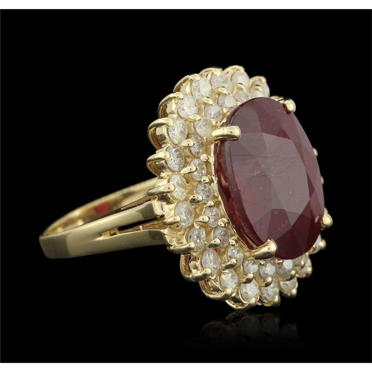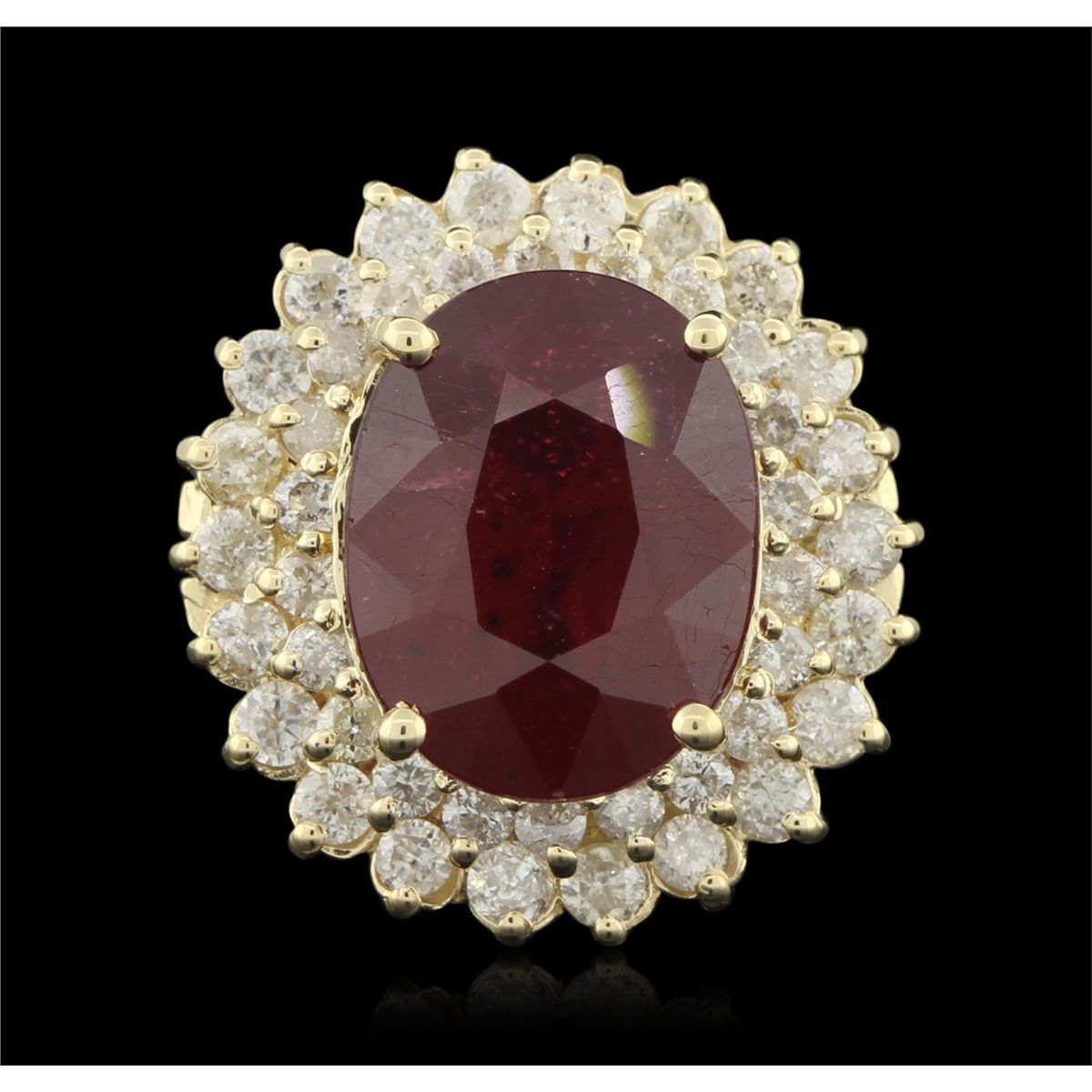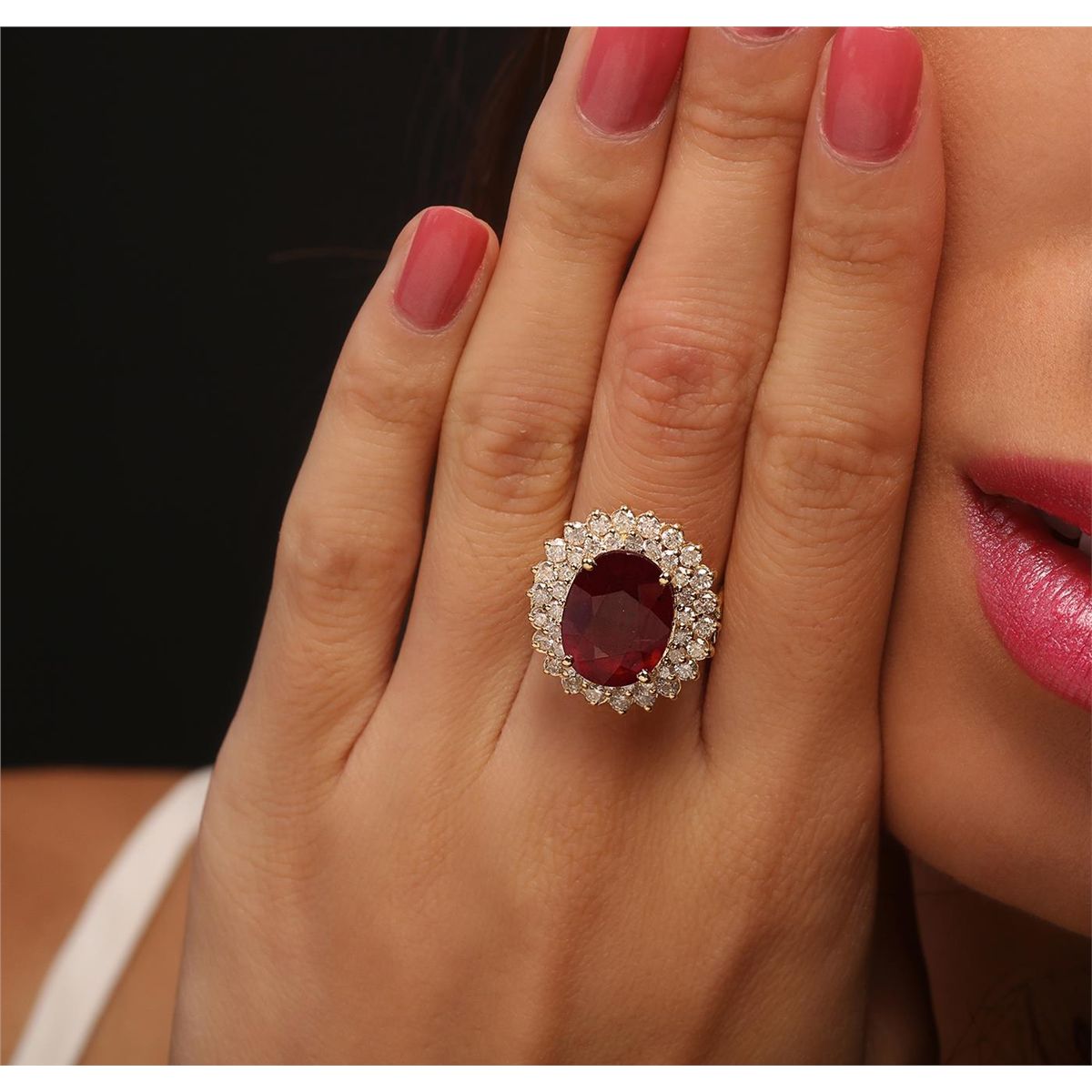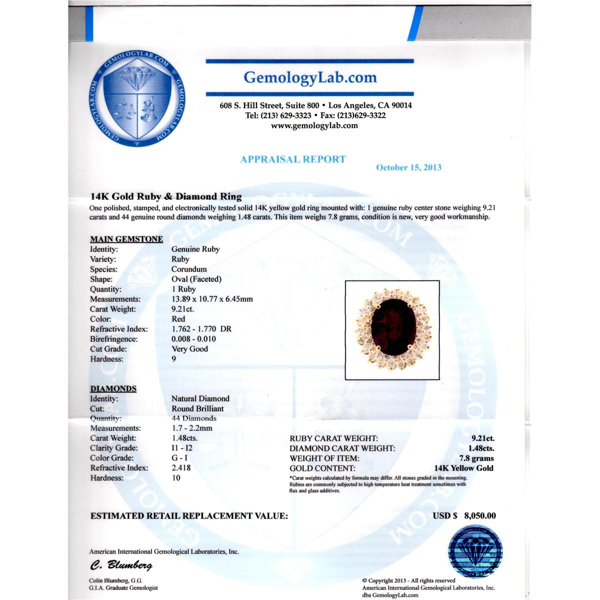 One polished, stamped, and electronically tested solid 14KT yellow gold ring mounted with: 1 genuine ruby center stone weighing 9.21 carats and 44 genuine round diamonds weighing 1.48 carats. This item weighs 7.8 grams, condition is new, very good workmanship. AIGL Appraised at $8,050.00.