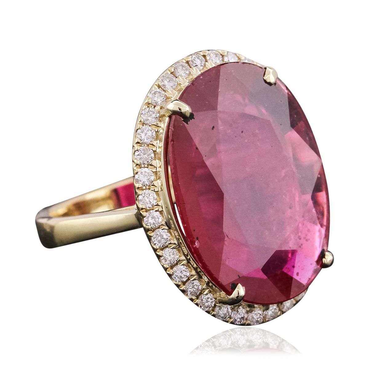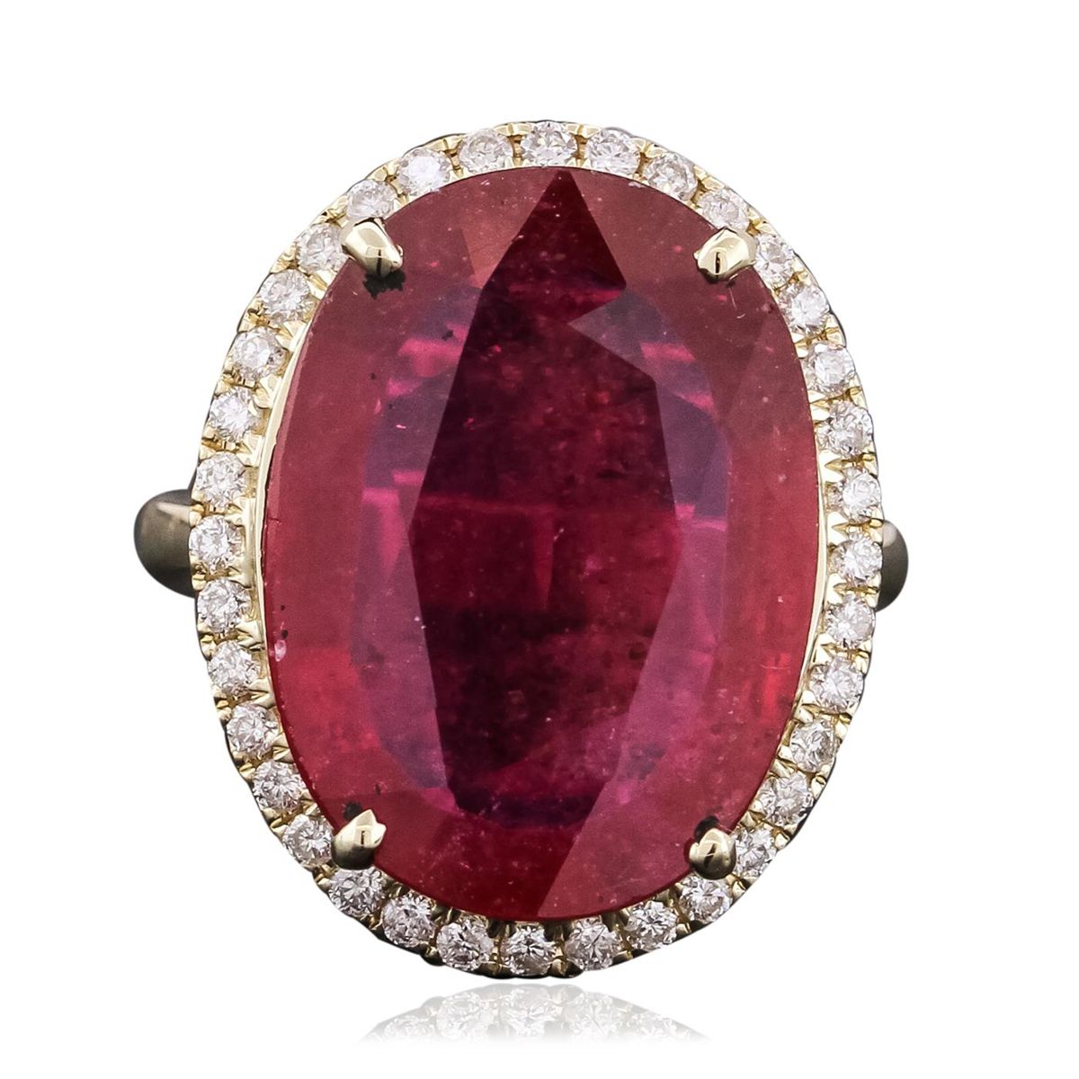One electronically tested 14KT yellow gold ladies combination cast & assembled ruby and diamond ring with a split shoulder shank with a bright polish finish. Identified with markings of "14K". Condition is new. Containing: One prong set oval modified brilliant cut natural ruby, measuring 20.07 x 14.89 x 3.81mm, approximate weight of 9.31ct., clarity is heavily included, type II, medium dark, moderately strong, strongly purplish red color, (GIA stpR 6/4), cut is good. Thirty-Six prong set round brilliant cut diamonds, measuring 1.30 - 1.30 x 0.78mm (depth est.) approximate total weight of 36 Stones = 0.29ct. . Clarity: I-1 to I-2. Color: J - K, Cut is Good. Colored gemstones are presumed to have been subjected to commonly used enhancement processes. All diamonds and colored gemstones are graded in the mounting, unless otherwise stated.. Total Weight of Colored Stones 9.31ct.. Total Weight of Diamonds 0.29ct.. Total Weight of Ring 7.70 grams. GGL Appraised at $6,695.00.