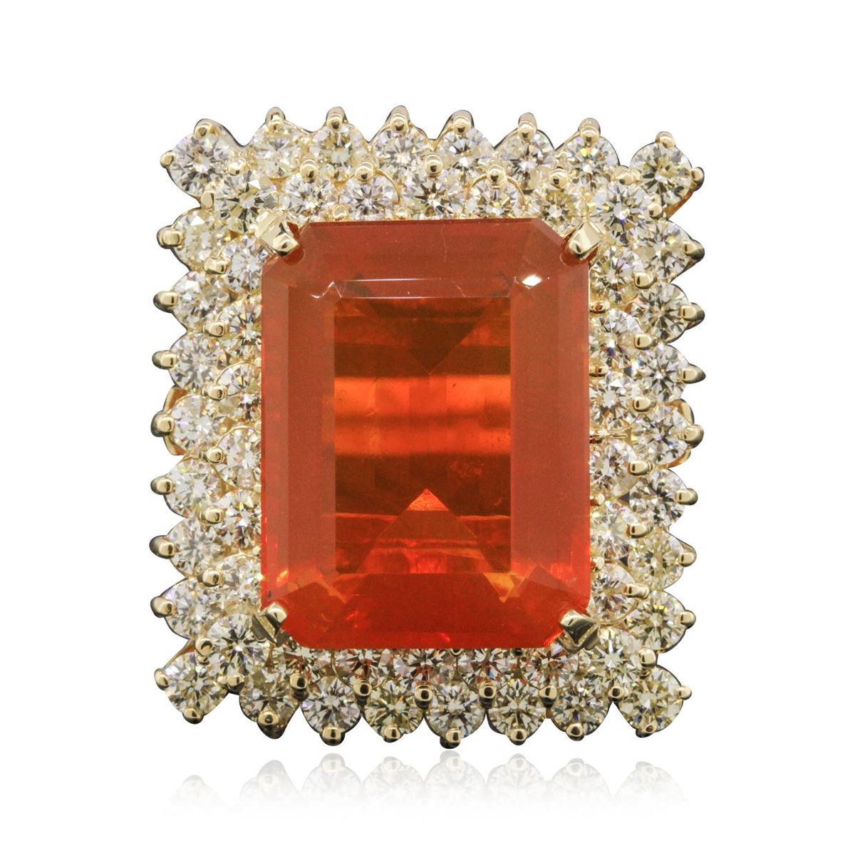 One electronically tested 14KT yellow gold ladies combination cast & assembled ring with a bright polish finish. Identified with markings of "K14". Condition is new. Containing: One fire opal that is cut in a rectangular shape and is prong set, measuring 17.20 mm long x 13.00 mm wide, and 7.80 mm thick and the approximate weight is 9.37 carats. The opal has a bright orange color; good cut; no inclusions; consistent in its brightness and pattern; and is not directional. Fifty-Six prong set round brilliant cut diamonds, measuring 2.50 - 2.30 x 1.44mm (depth est.) approximate total weight of 56 Stones = 2.83ct. Clarity: SI-1 to SI-2. Color: M - N, Cut is Good. Colored gemstones are presumed to have been subjected to commonly used enhancement processes. All diamonds and colored gemstones are graded in the mounting, unless otherwise stated. Total Weight of Diamonds 2.83ct. Total Weight of Opals 9.37ct. Total Weight of Ring 14.30 grams. GGL Appraised at $14,300.00.