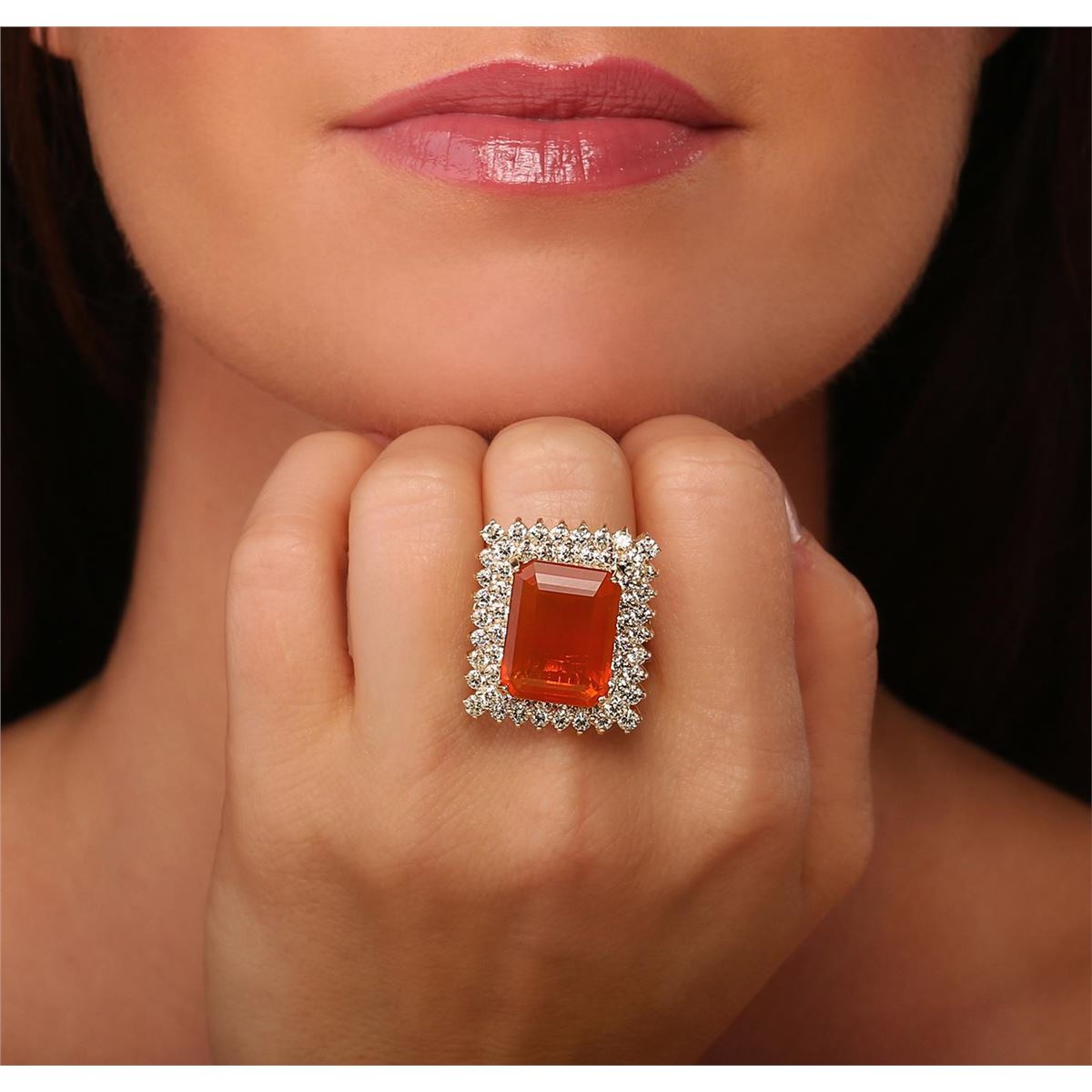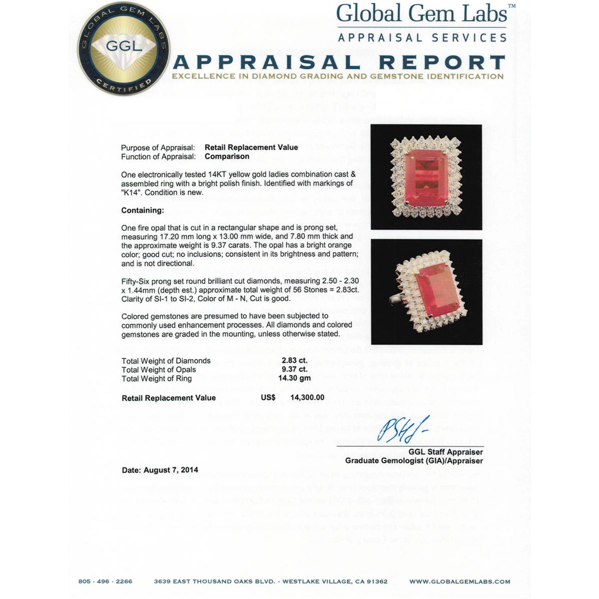 One electronically tested 14KT yellow gold ladies combination cast & assembled ring with a bright polish finish. Identified with markings of "K14". Condition is new. Containing: One fire opal that is cut in a rectangular shape and is prong set, measuring 17.20 mm long x 13.00 mm wide, and 7.80 mm thick and the approximate weight is 9.37 carats. The opal has a bright orange color; good cut; no inclusions; consistent in its brightness and pattern; and is not directional. Fifty-Six prong set round brilliant cut diamonds, measuring 2.50 - 2.30 x 1.44mm (depth est.) approximate total weight of 56 Stones = 2.83ct. Clarity: SI-1 to SI-2. Color: M - N, Cut is Good. Colored gemstones are presumed to have been subjected to commonly used enhancement processes. All diamonds and colored gemstones are graded in the mounting, unless otherwise stated. Total Weight of Diamonds 2.83ct. Total Weight of Opals 9.37ct. Total Weight of Ring 14.30 grams. GGL Appraised at $14,300.00.