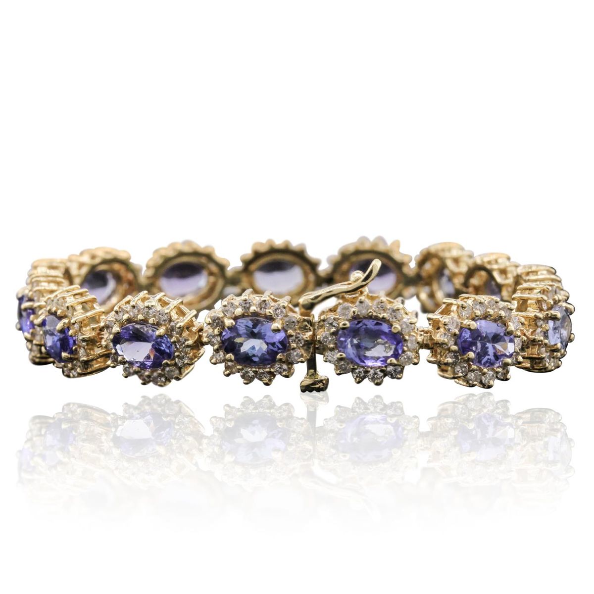 One electronically tested 14KT yellow gold Ladies combination cast & assembled bracelet with a hidden box clasp with a bright polish finish. Measurements: 6.75" in length. Identified with markings of "14K". Condition is new. Containing: Fifteen prong set oval modified brilliant cut natural tanzanites, measuring 7.00 x 5.00 x 2.60mm, approximate. Total Weight of 9.45ct., clarity is eye clean, type I, medium light, very slightly grayish, violet color, (GIA V 4/3), cut is good. Colored gemstones are presumed to have been subjected to commonly used color/clarity enhancement processes. Two Hundred Ten prong set round brilliant cut diamonds, measuring 1.50 - 1.50 x 0.90mm (depth est.) approximate. Total Weight of 210 Stones = 2.58ct. Clarity: I-1 to I-2. Color: J - K, Cut is Good. Total Weight of Colored Stones 9.45ct. Total Weight of Diamonds 2.58ct. Total Weight of Bracelet 22.40 grams. GGL Appraised at $20,650.00.