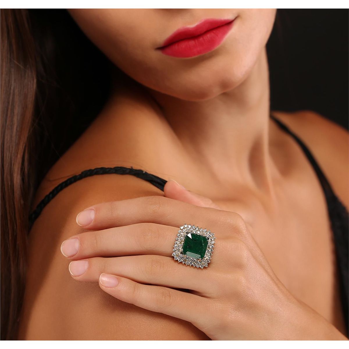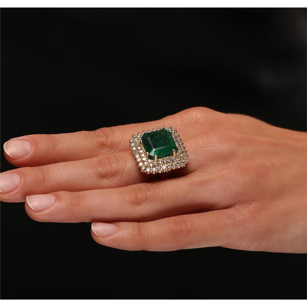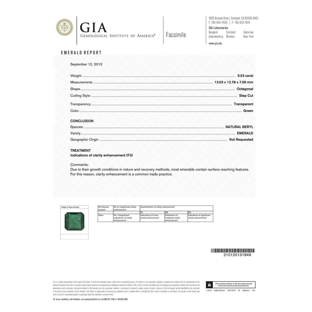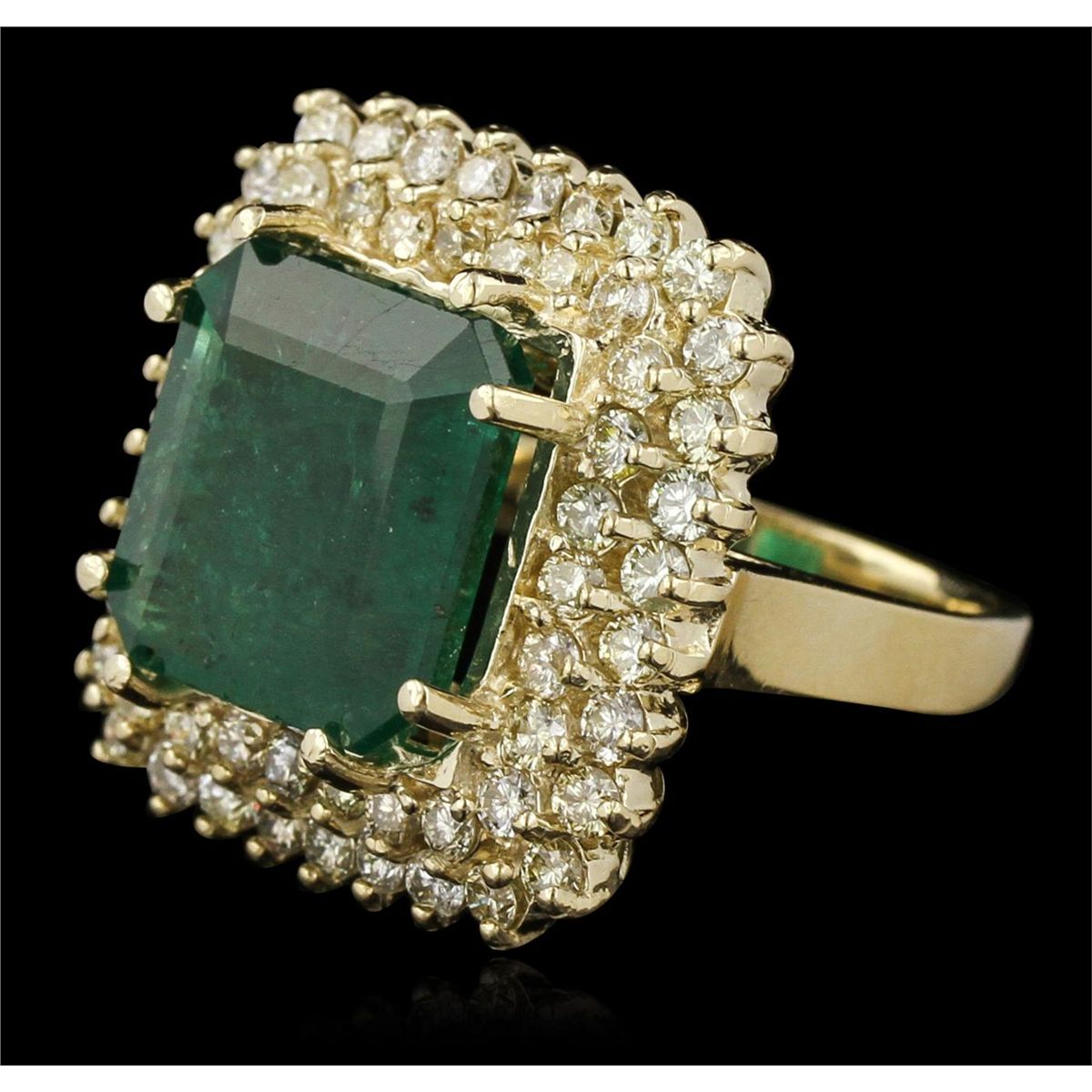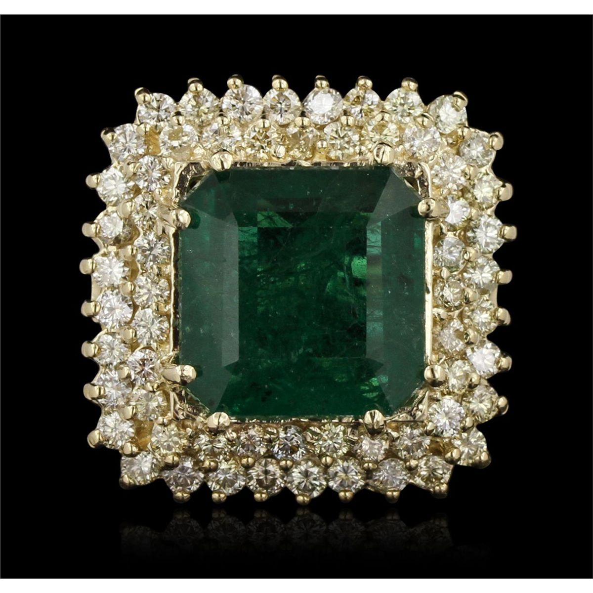 One electronically tested 14KT yellow gold ladies cast emerald and diamond ring with a bright polish finish. Condition is new, good workmanship. The featured emerald is set within a two tiered diamond lattice gallery, completed by a two and one-half millimeter wide band. Identified with markings of "K14". Containing: One prong set rectangular step cut natural emerald, measuring 13.03 x 12.78 x 7.09mm, approximate weight of 9.53ct., clarity is heavily included, type III, medium dark, moderately strong, very slightly bluish green color, (GIA vslbG 6/4), cut is good. Transmitting light with a minimum of distortion, transparent. Naturally occurring internal & external characteristics are present. Indications of oil, & opticon residue. GIA Colored Stone Grading Report attached. Graded loose prior to setting in the GIA Laboratory, Report # 1156648223. Sixty-one prong set round brilliant cut diamonds, measuring 2.00 - 2.00 x 1.20mm (depth est.) approximate total weight of 61 Stones = 2.10ct. Graded in the setting. Clarity SI-1 to I-1. Color K - M. Total Weight of Colored Stones 9.53ct. Total Weight of Diamonds 2.10ct. Total Weight of Ring 13.60gm. AIGAppraised at $32,865.00.