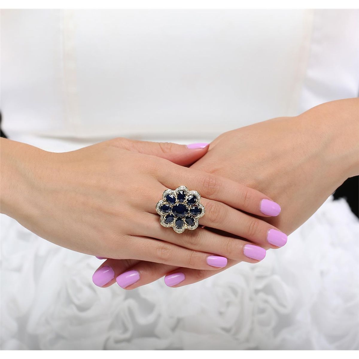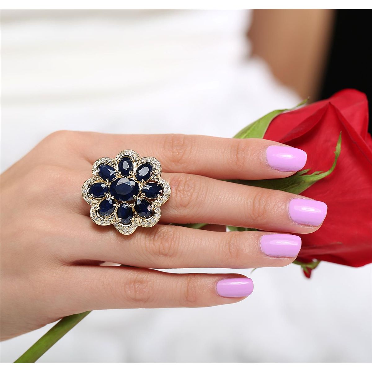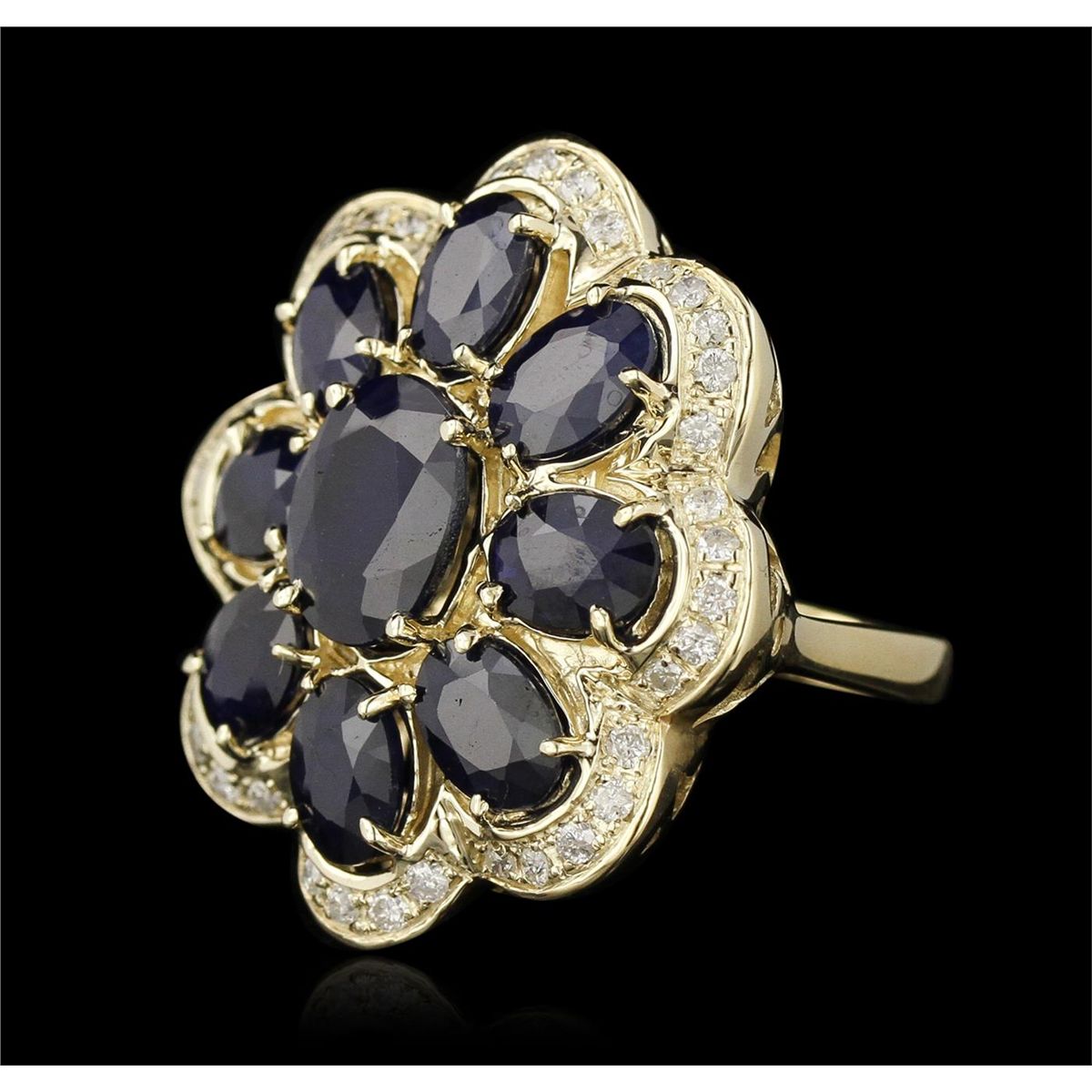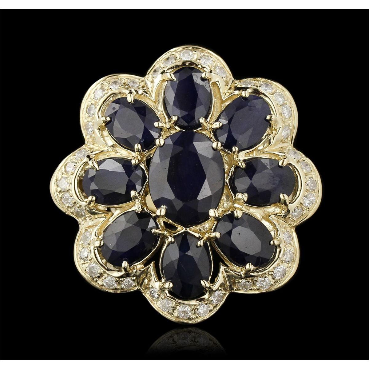 One electronically tested 14KT yellow gold Ladies combination cast & assembled fashion ring with a bright polish finish. Identified with markings of "14K". Condition is excellent. Containing: One prong set oval modified brilliant cut natural blue sapphire, measuring 10.10 x 8.30 x 4.40mm, approximate weight of 2.98ct., clarity is severely included, type II, dark, moderately strong, blue color, (GIA B 7/4), cut is good. Eight prong set oval modified brilliant cut natural blue sapphires, measuring 6.50 x 5.20 x 3.00mm, approximate total weight of 6.56ct., clarity is severely included, type II, dark, moderately strong, blue color, (GIA B 7/4), cut is good. Colored gemstones are presumed to have been subjected to commonly used and possible undetectable color/clarity enhancement processes. Forty prong set round brilliant cut diamonds, measuring 1.50 - 1.50 x 0.90mm (depth est.) approximate total weight of 40 Stones = 0.49ct. Clarity of I-1 to I-2, Color of I - K, Cut is Good. Total Weight of Colored Stones 9.54ct. Total Weight of Diamonds 0.49ct. Total Weight of Ring 14.90gm. GGL Appraised at $9,695.00.