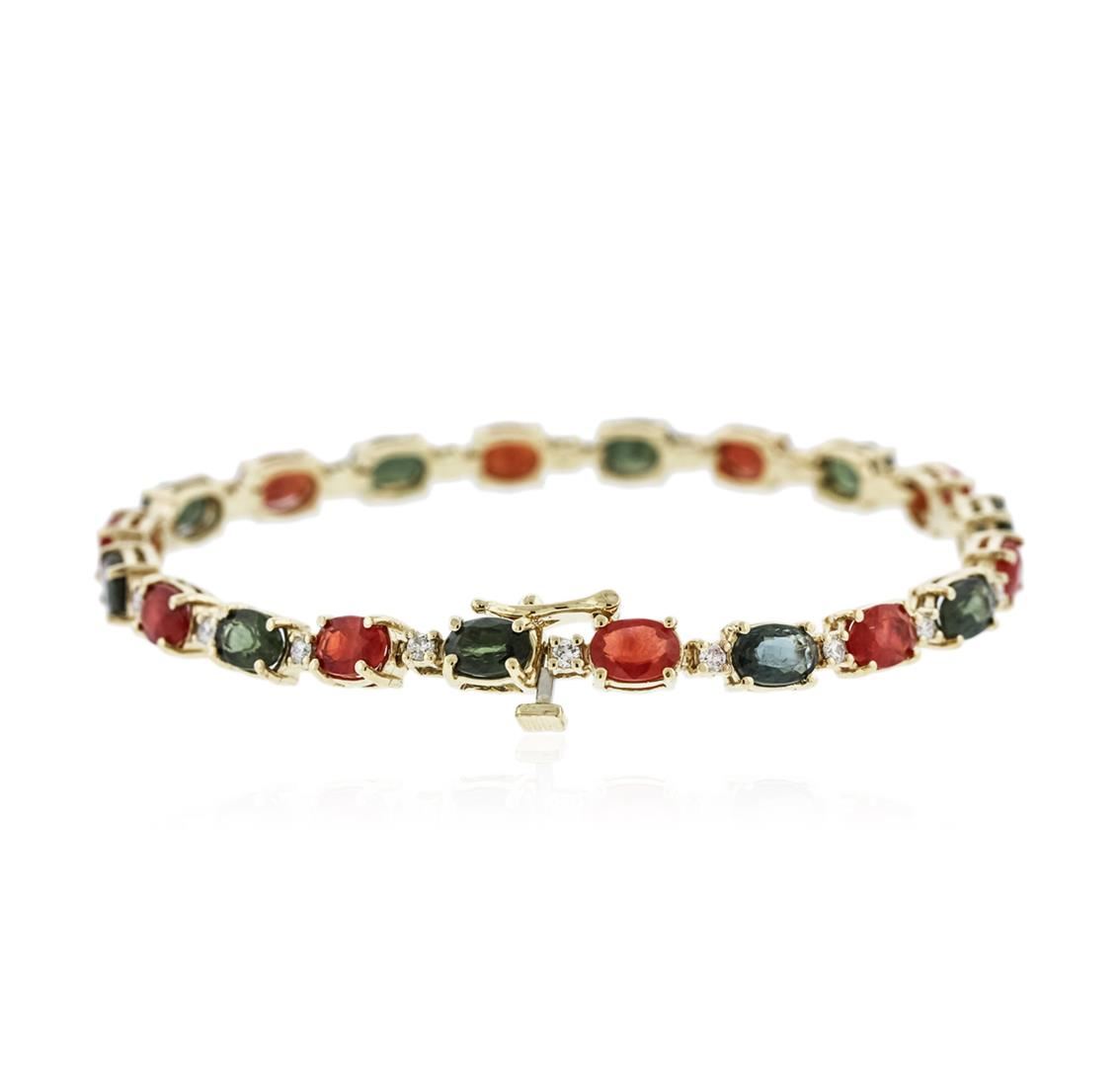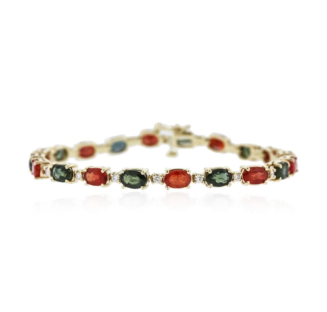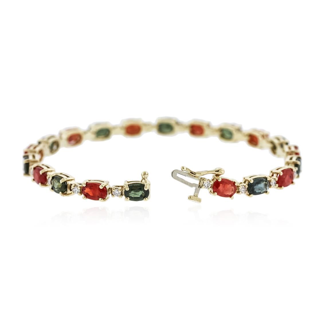 One electronically tested 14KT yellow gold ladies cast sapphire and diamond bracelet with a hidden box clasp with a bright polish finish. Measurements: 7" in length Identified with markings of "14K". Condition is new. Containing: Ten prong set oval modified brilliant cut natural green sapphires, measuring 5.50 x 4.00 x 2.60mm, approximate total weight of 4.90ct., clarity is moderately included, medium, moderately strong, green color, (GIA G 5/4), cut is good. Ten prong set oval modified brilliant cut natural orange sapphires, measuring 5.50 x 4.00 x 2.60mm, approximate total weight of 4.90ct., clarity is heavily included, medium, brownish, orange color, (GIA O 5/3), cut is good. Twenty prong set round brilliant cut diamonds, measuring 1.80 - 1.80 x 1.08mm (depth est.) approximate total weight of 20 Stones = 0.43ct. Clarity: SI-2 to I-1. Color: J - K, Cut is Good. Colored gemstones are presumed to have been subjected to commonly used enhancement processes. All diamonds and colored gemstones are graded in the mounting, unless otherwise stated. Total Weight of Colored Stones 9.80ct. Total Weight of Diamonds 0.43ct. Total Weight of Bracelet 12.20 grams. GGL Appraised at $3,700.00.