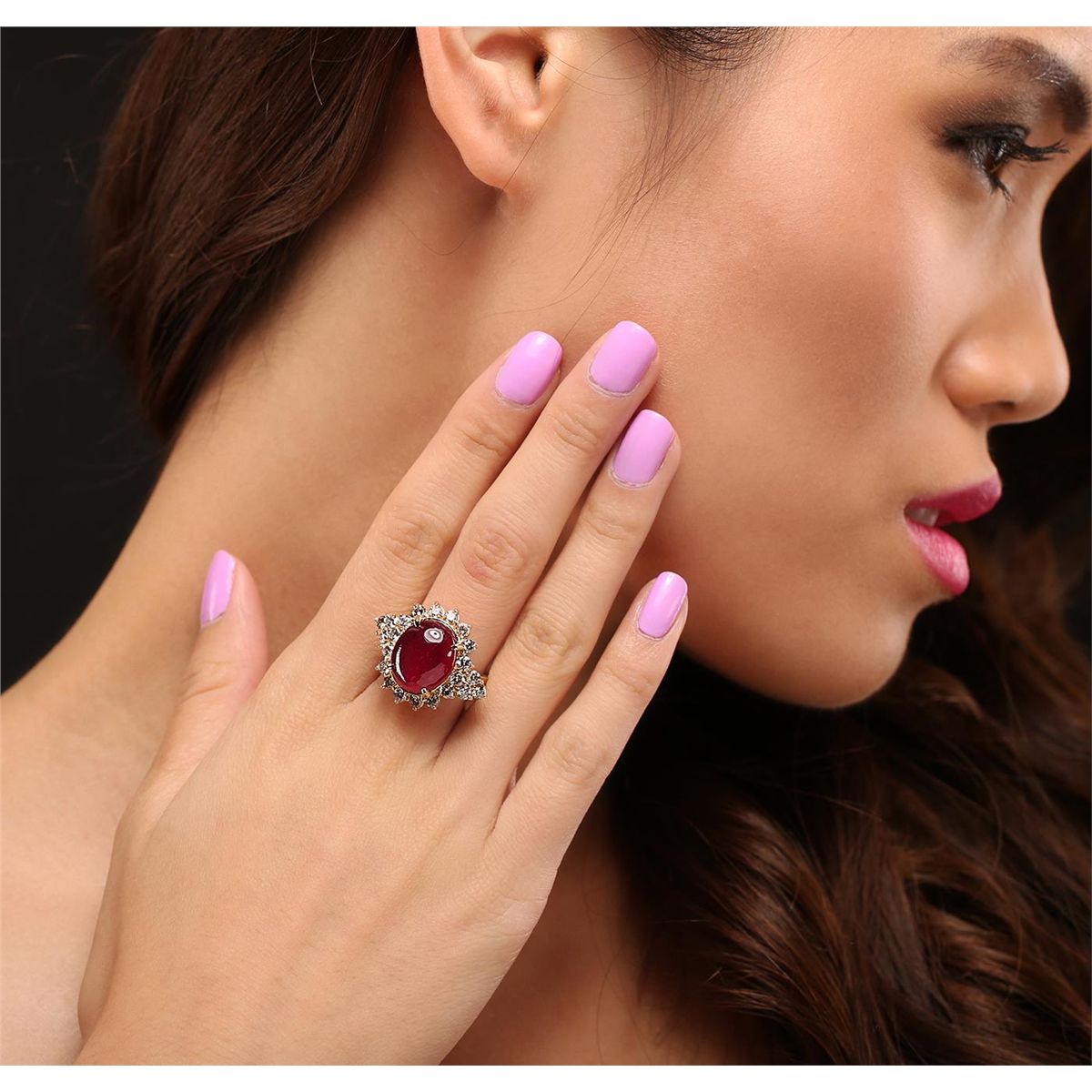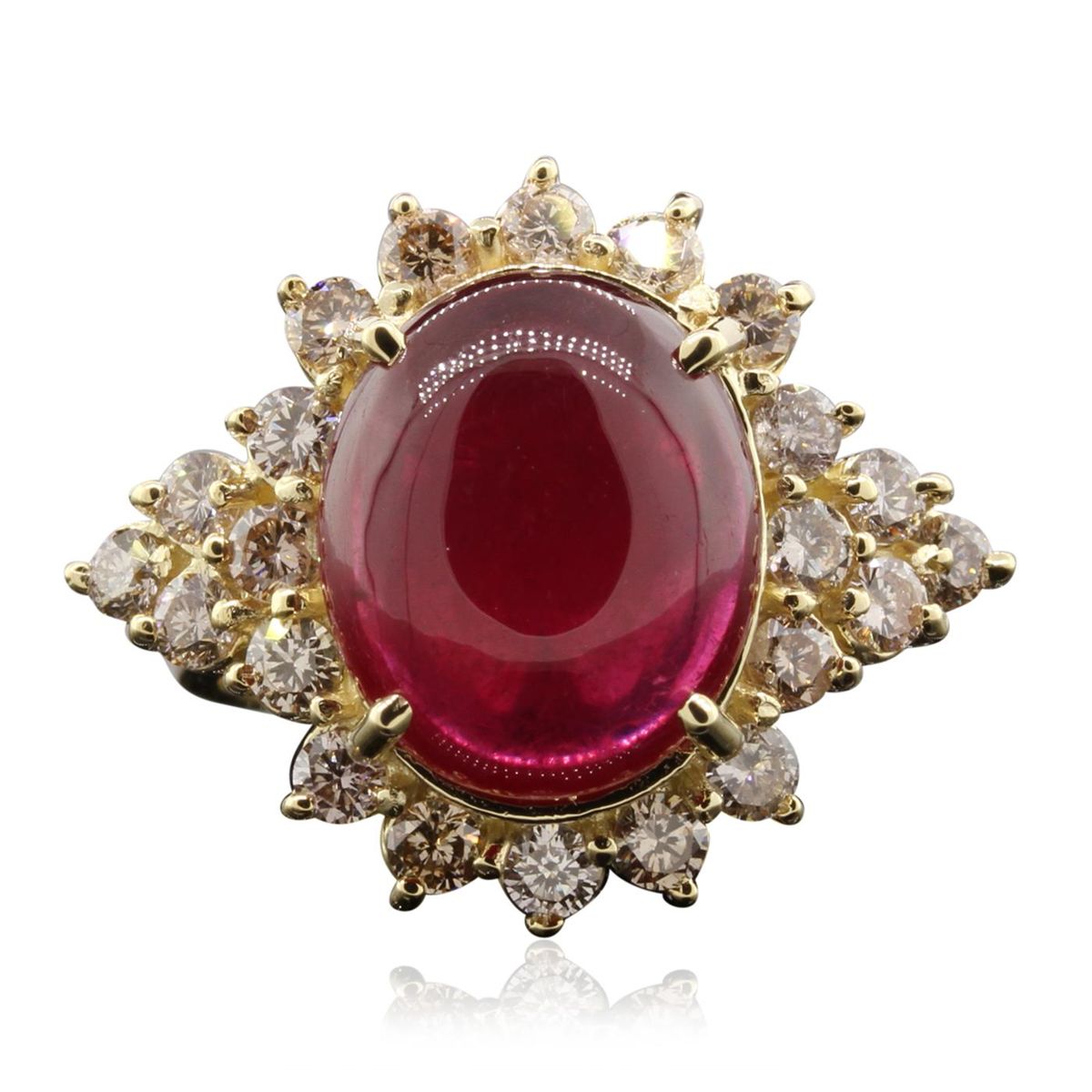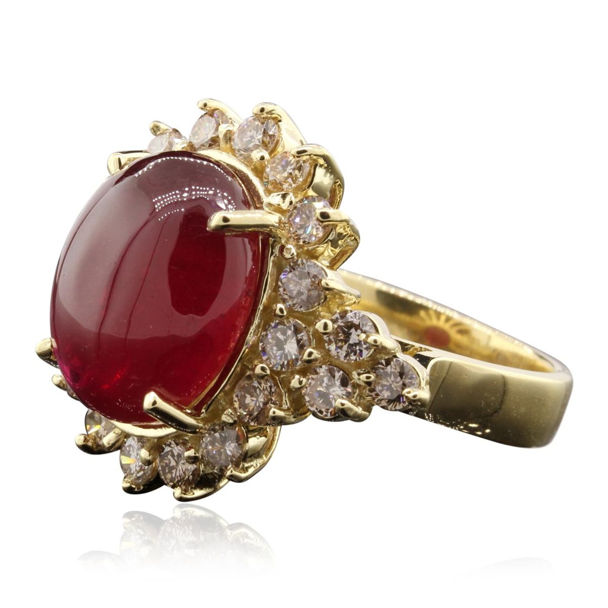 One electronically tested 14KT yellow gold ladies cast ruby and diamond ring with a bright polish finish. The featured ruby is set within a diamond set bezel supported by diamond set shoulders, completed by a four millimeter wide band. Identified with markings of "K14". Condition is new, good workmanship. Containing: One prong set oval cabochon cut natural ruby, measuring 13.95 x 11.85 x 5.00mm, 10%. bulge factor, approximate weight of 9.85ct., clarity is heavily included, type II, medium dark, very slightly brownish, slightly purplish red color, (GIA slpR 6/3), cut is good. Transmitting light somewhat diffusely, transparent to translucent. Naturally occurring internal & external characteristics are present. Indications of laboratory high temperature heat treatment, with glass & flux additives. Colored Stone Grading Report attached. Graded in the setting. Ruby has a low tolerance to rhodium plating, repolishing the surface, & ultrasonic cleaning. Twenty-Two prong set round brilliant cut diamonds, measuring 2.60 - 2.50 x 1.53mm (depth est.) approximate. Total Weight of 22 Stones = 1.43ct. Graded in the setting. Clarity: SI-1 to SI-2 . Total Weight of Colored Stones 9.85ct. Total Weight of Diamonds 1.43ct. AIG Appraised at $6,955.00.