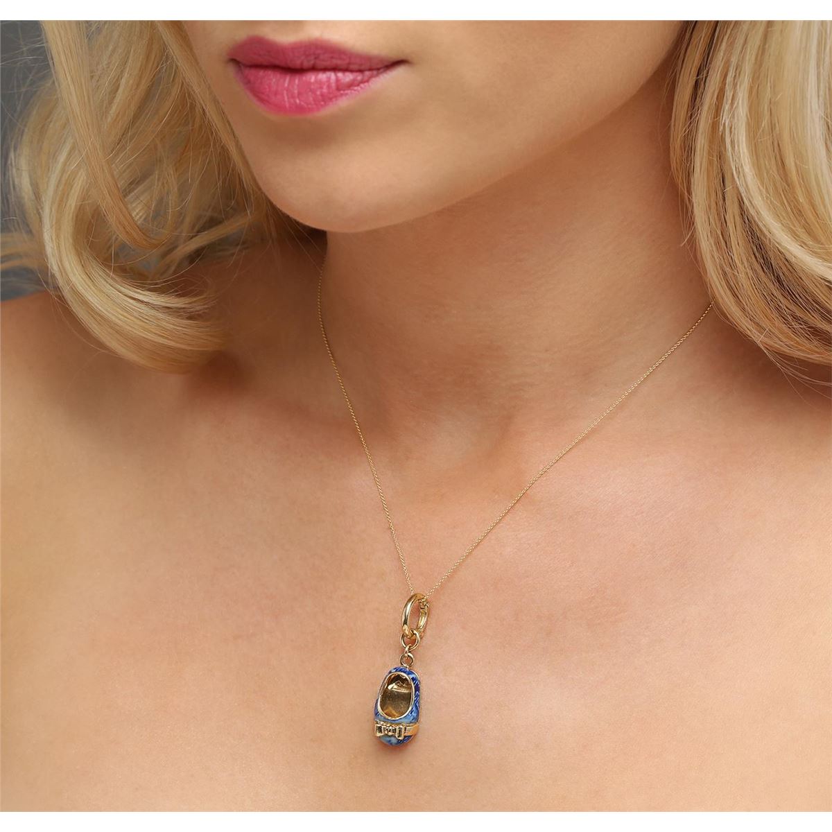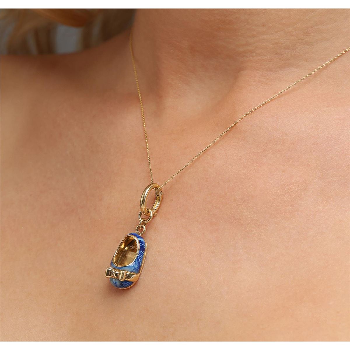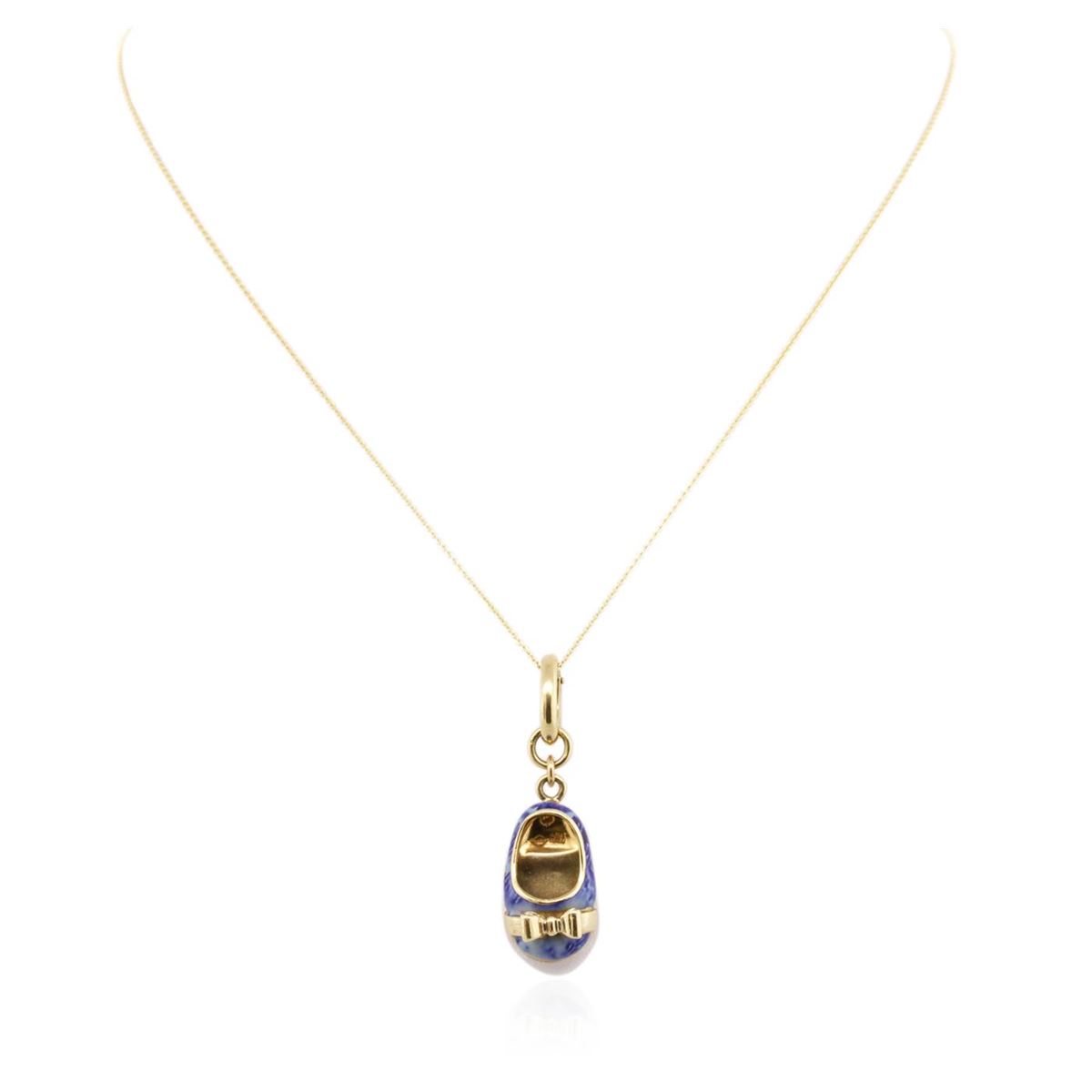 One baby shoe pendant with chain featuring: 14KT yellow gold weighing 5.30 grams.