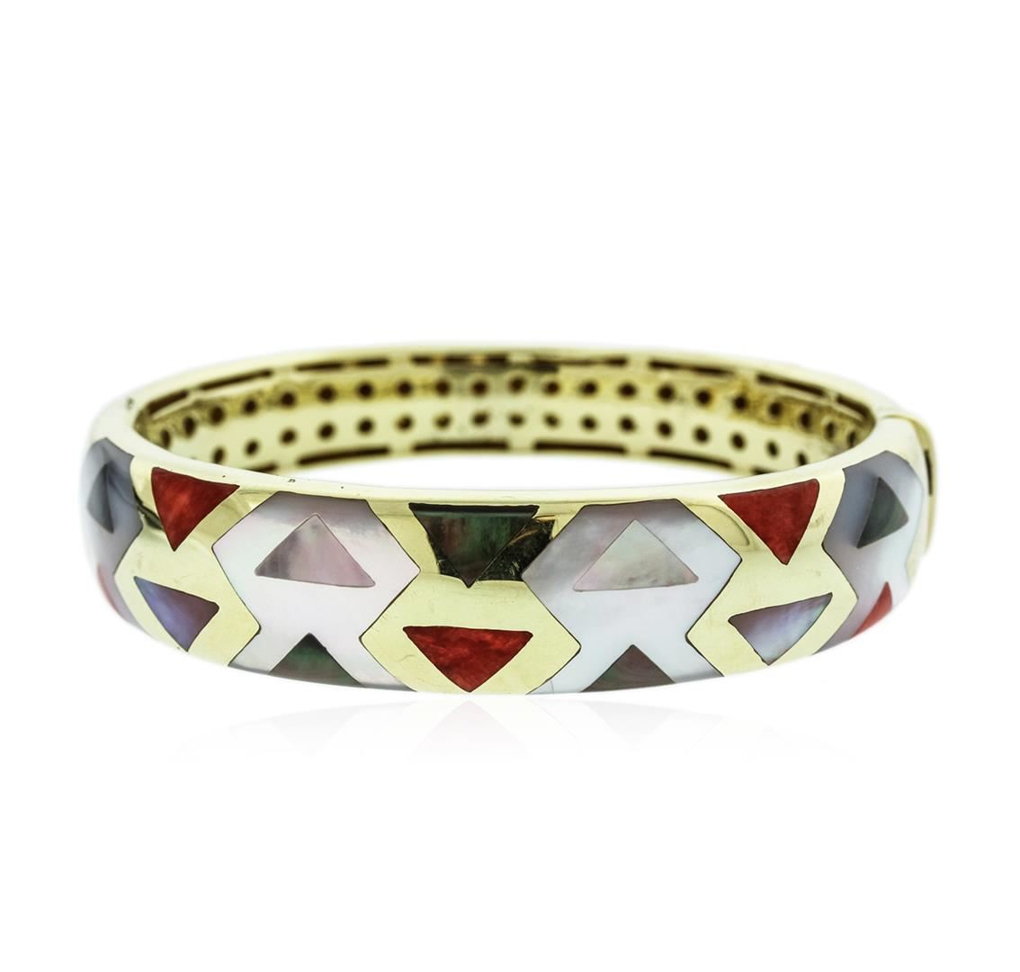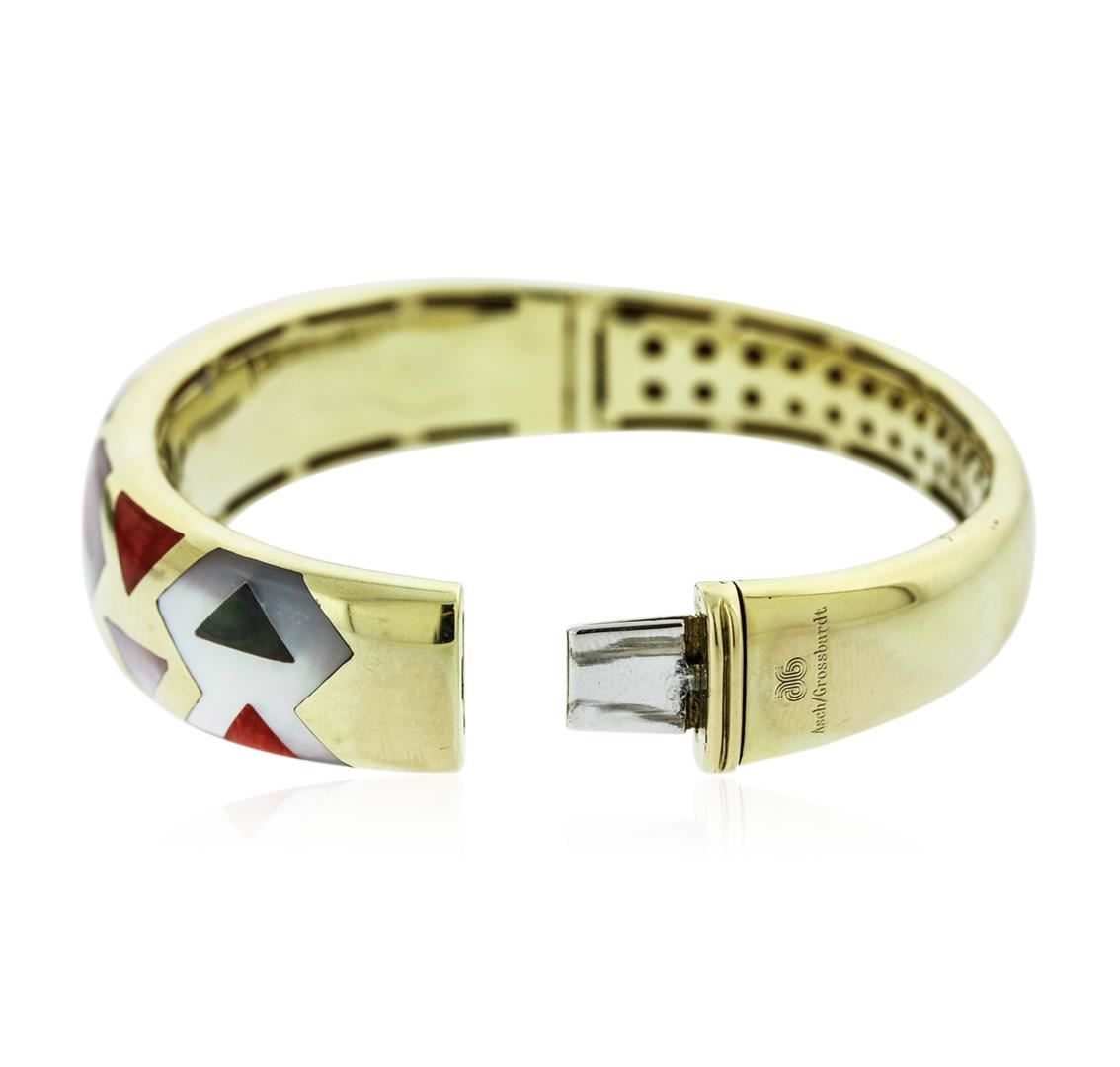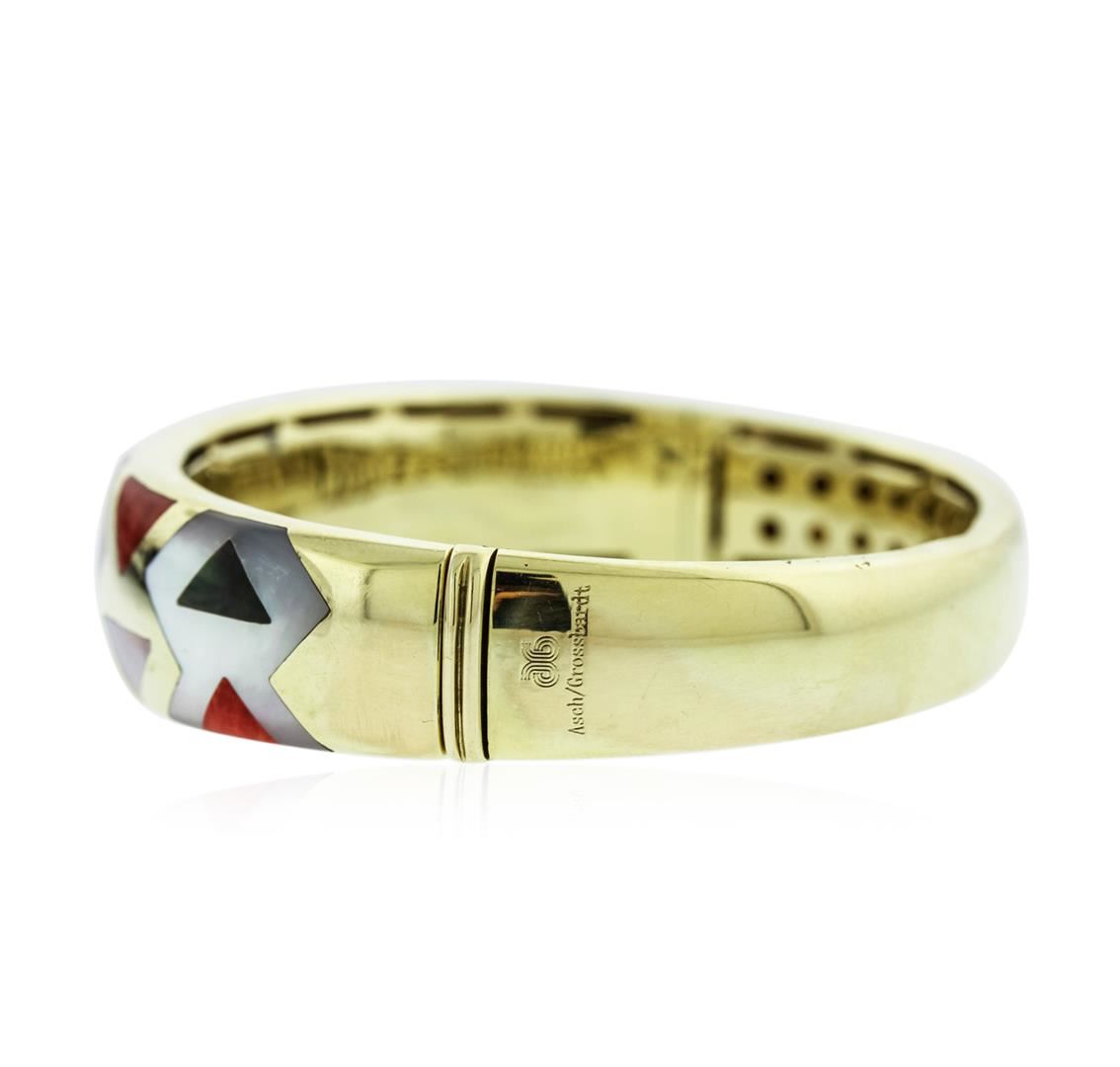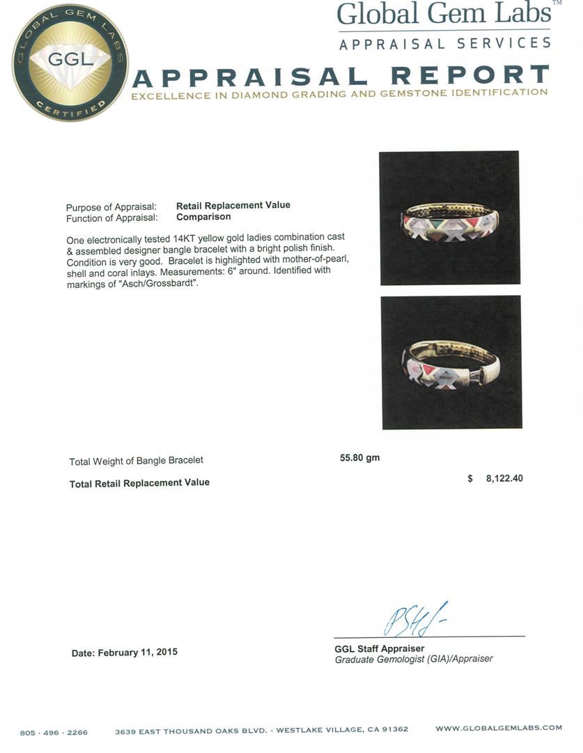 One electronically tested 14KT yellow gold ladies combination cast & assembled designer bangle bracelet with a bright polish finish. Bracelet is highlighted with mother-of-pearl, shell and coral inlays. Measurements: 6" around. Identified with markings of "Asch/Grossbardt". Condition is very good. Total Weight of Bangle Bracelet 55.80 grams. GGL Appraised at $8,122.00.