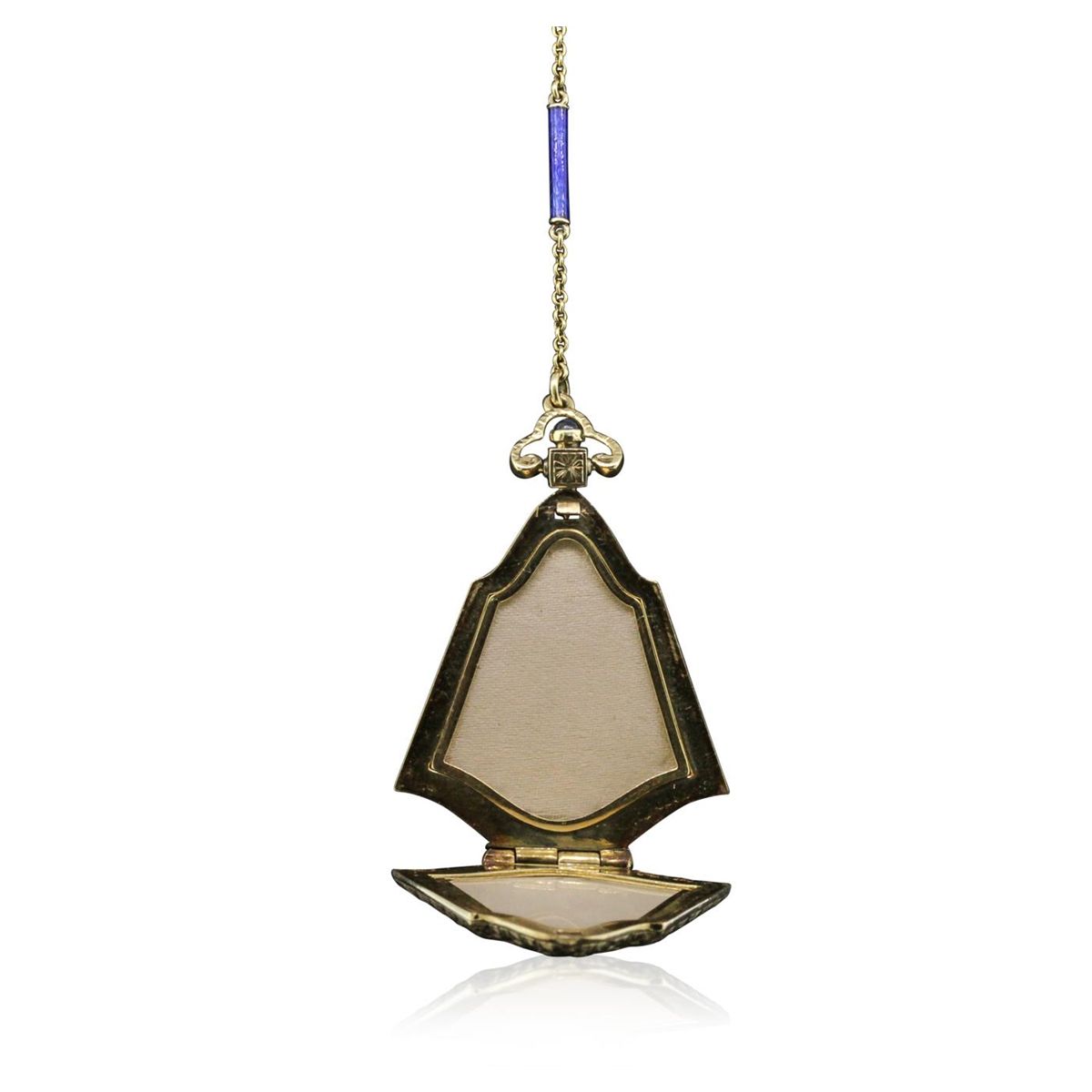 One electronically tested 14KT yellow gold ladies custom cast & assembled blue guilloche‚ enamel necklace. Twenty-seven inch length lariat style necklace consists of a four and one-quarter inch length drop with locket. The locket features on the obverse side: a painted dancing maiden with a painted floral surround set within a blue guilloche, enameled background and the reverse side: a single painted flower with single painted flowers in the three corners also set within a blue guilloche, enamel background. The locket opens by pressing a blue crystal adorned stem. The necklace is completed by a blue guilloche, enamel station chain, terminating in a spring ring clasp. Bright polish finish. The necklace is reminiscent of the jewelry designs from the Victorian Period. The Victorian period gets its name from England's Queen Victoria, who at eighteen was crowned in 1837. The queen was the leading influence on jewelry styles for the next sixty years. It became fashionable to wear several necklaces at once and tower chokers high on the neck. The jewelry of the period is characterized by light, open work using several techniques of filigree, piercing, cannetille and repouss. Many pieces were fabricated from thin sheets of gold that were chased and engraved. Condition is good. Total Weight of Necklace 26.28 grams. AIG Appraised at $6,270.00.