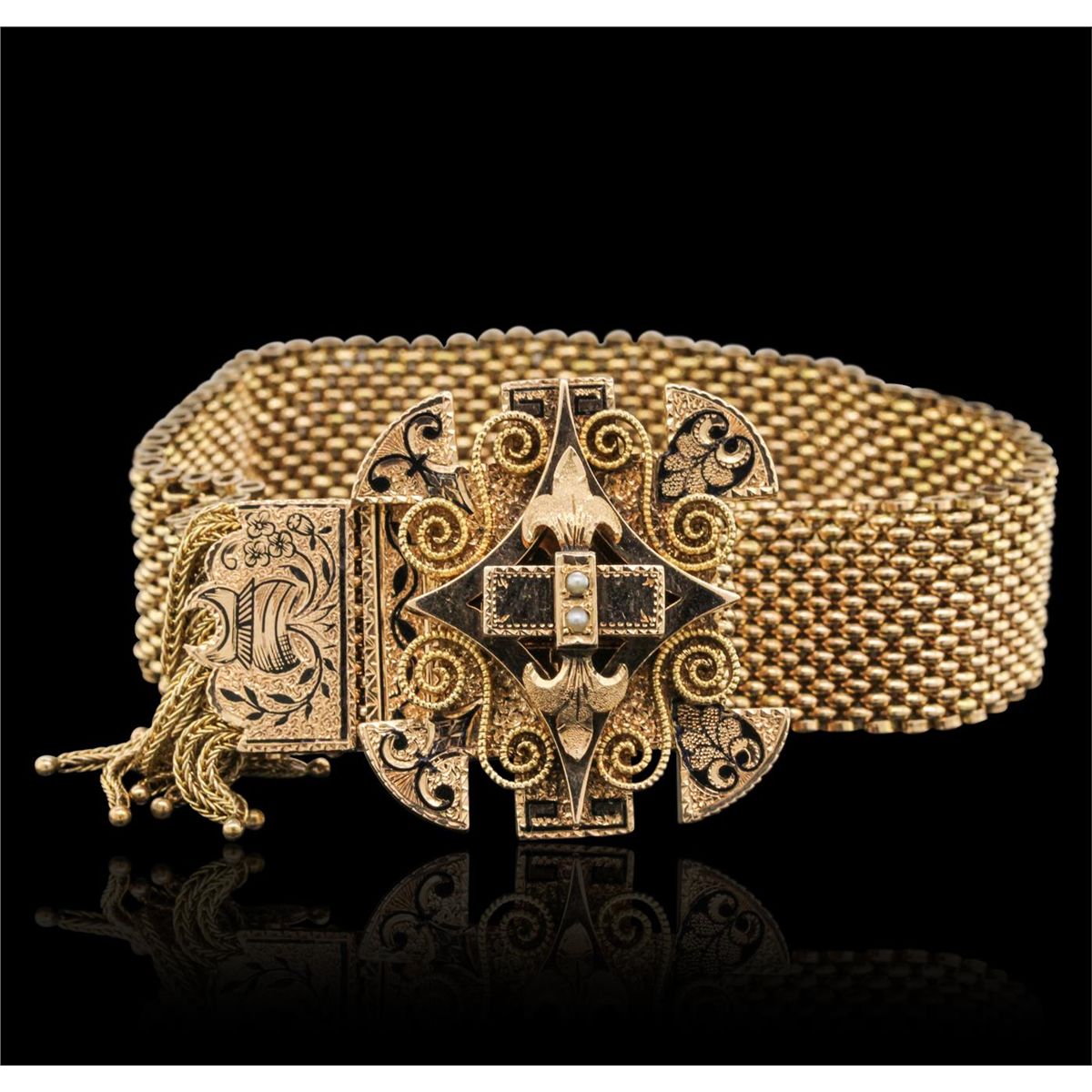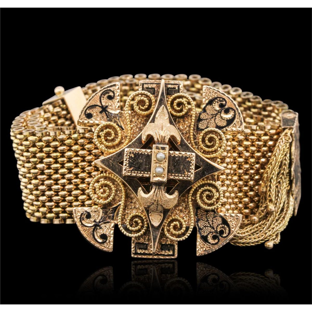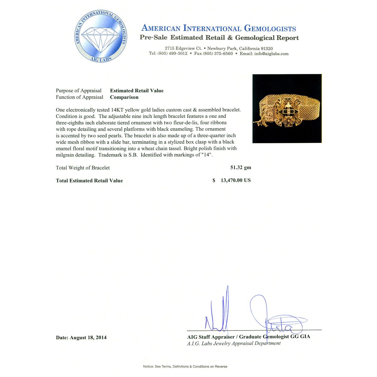 One electronically tested 14KT yellow gold ladies custom cast & assembled bracelet. The adjustable nine inch length bracelet features a one and three-eighths inch elaborate tiered ornament with two fleur-de-lis, four ribbons with rope detailing and several platforms with black enameling. The ornament is accented by two seed pearls. The bracelet is also made up of a three-quarter inch wide mesh ribbon with a slide bar, terminating in a stylized box clasp with a black enamel floral motif transitioning into a wheat chain tassel. Bright polish finish with milgrain detailing. Trademark is S.B. Identified with markings of "14". Condition is good. Total Weight of Bracelet 51.32 grams. AIG Appraised at $13,470.00.