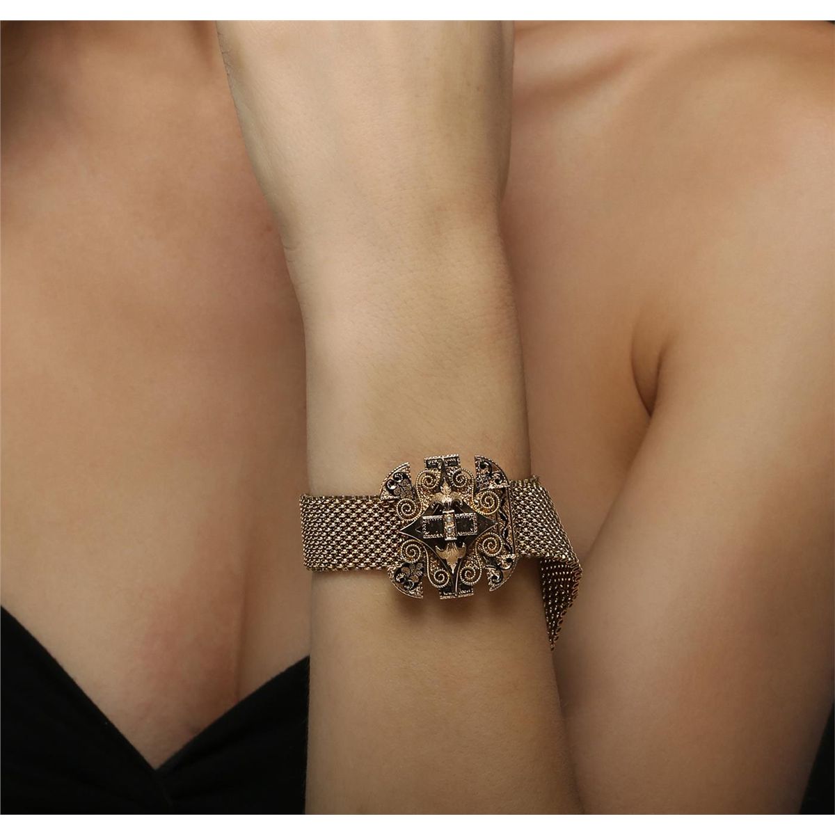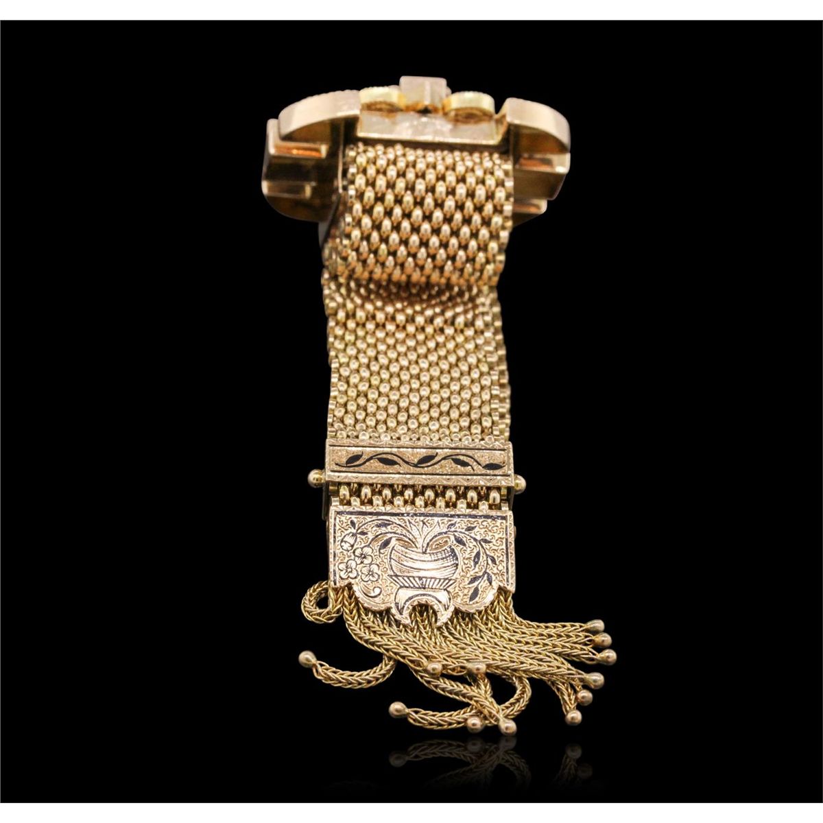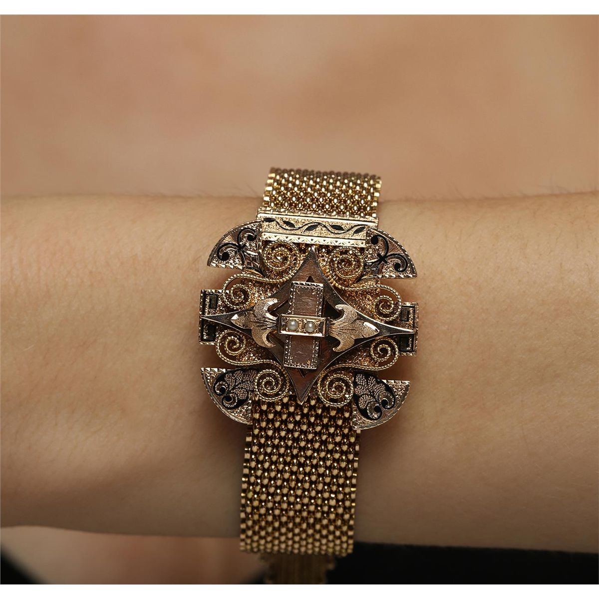 One electronically tested 14KT yellow gold ladies custom cast & assembled bracelet. The adjustable nine inch length bracelet features a one and three-eighths inch elaborate tiered ornament with two fleur-de-lis, four ribbons with rope detailing and several platforms with black enameling. The ornament is accented by two seed pearls. The bracelet is also made up of a three-quarter inch wide mesh ribbon with a slide bar, terminating in a stylized box clasp with a black enamel floral motif transitioning into a wheat chain tassel. Bright polish finish with milgrain detailing. Trademark is S.B. Identified with markings of "14". Condition is good. Total Weight of Bracelet 51.32 grams. AIG Appraised at $13,470.00.