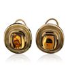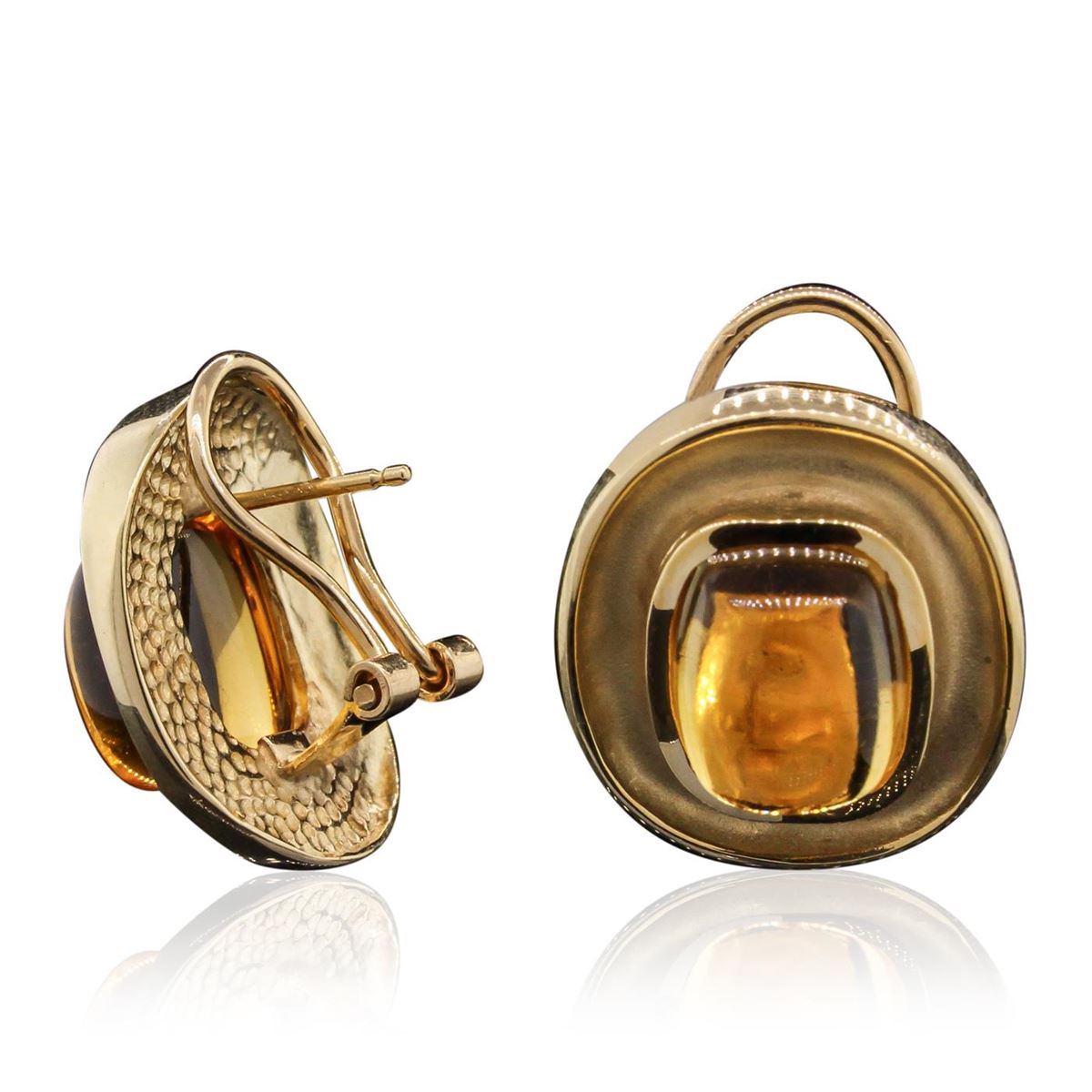 One pair of earrings featuring: 14KT Yellow Gold and Bezel Set Cabachon Citrine. Item weighs 12.10 grams.