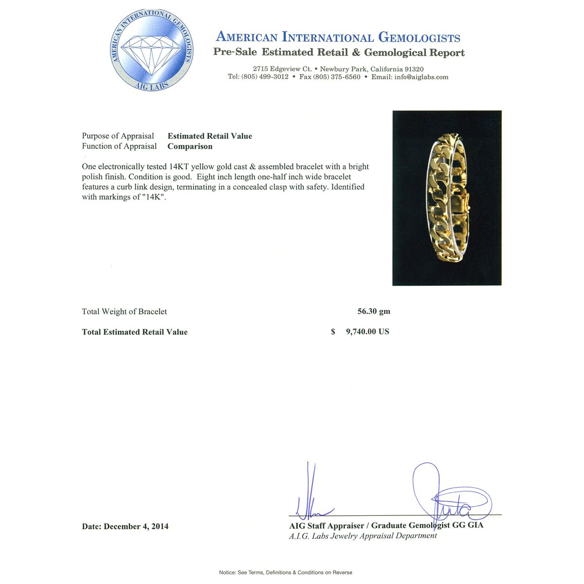 One electronically tested 14KT yellow gold cast & assembled bracelet with a bright polish finish. Eight inch length one-half inch wide bracelet features a curb link design, terminating in a concealed clasp with safety. Identified with markings of "14K". Condition is good. Total Weight of Bracelet 56.30 grams. AIG Appraised at $9,740.00.