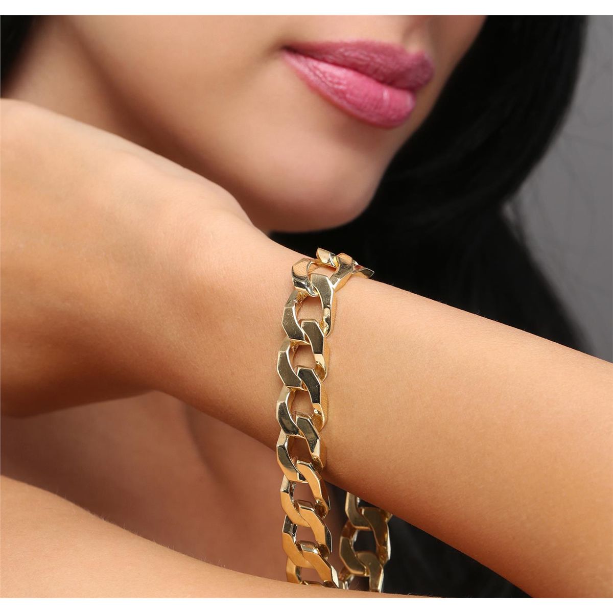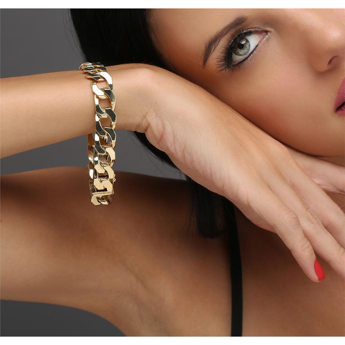 One electronically tested 14KT yellow gold cast & assembled bracelet with a bright polish finish. Eight inch length one-half inch wide bracelet features a curb link design, terminating in a concealed clasp with safety. Identified with markings of "14K". Condition is good. Total Weight of Bracelet 56.30 grams. AIG Appraised at $9,740.00.