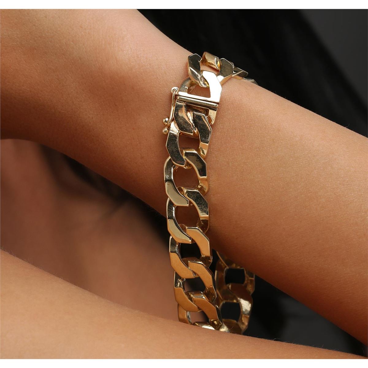 One electronically tested 14KT yellow gold cast & assembled bracelet with a bright polish finish. Eight inch length one-half inch wide bracelet features a curb link design, terminating in a concealed clasp with safety. Identified with markings of "14K". Condition is good. Total Weight of Bracelet 56.30 grams. AIG Appraised at $9,740.00.