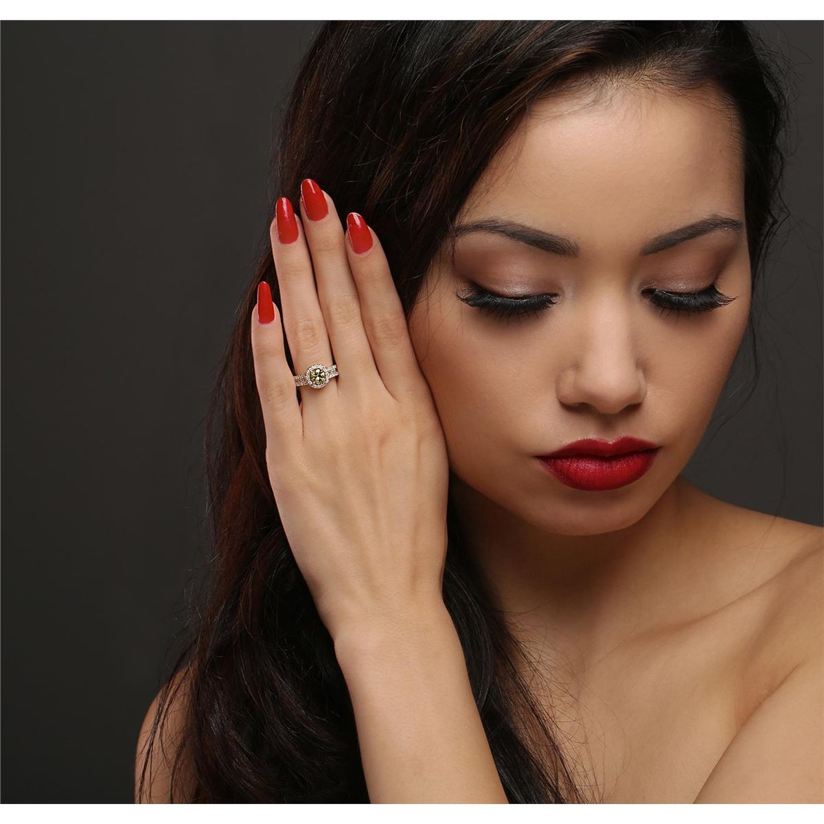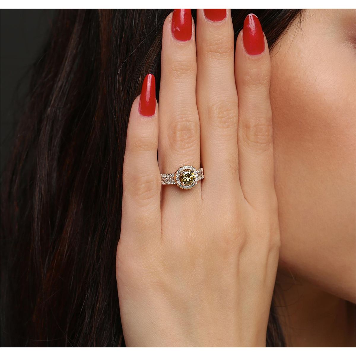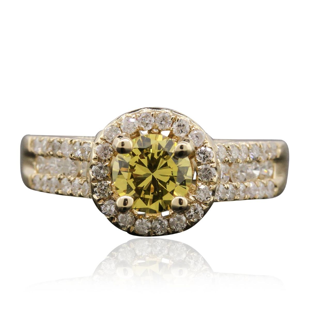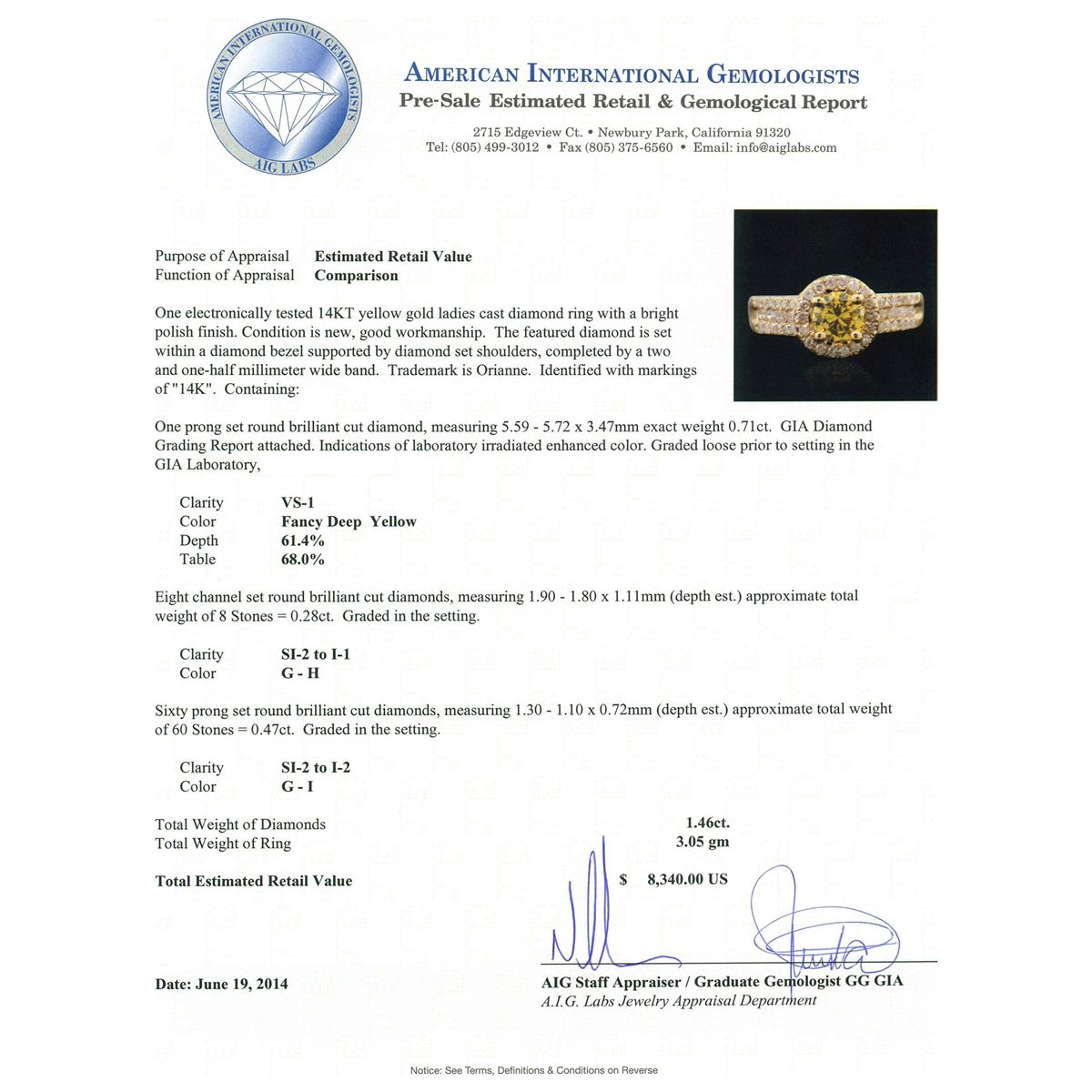 One electronically tested 14KT yellow gold ladies cast diamond ring with a bright polish finish. Condition is new, good workmanship. The featured diamond is set within a diamond bezel supported by diamond set shoulders, completed by a two and one-half millimeter wide band. Trademark is Orianne. Identified with markings of "14K". Containing: One prong set round brilliant cut diamond, measuring 5.59 - 5.72 x 3.47mm exact weight 0.71ct. GIA Diamond Grading Report attached. Indications of laboratory irradiated enhanced color. Graded loose prior to setting in the GIA Laboratory, Report #11105529. Clarity: VS-1. Depth: 61.4%. Table 68.0%. Eight channel set round brilliant cut diamonds, measuring 1.90 - 1.80 x 1.11mm (depth est.) approximate total weight of 8 Stones = 0.28ct. Graded in the setting. Clarity: SI-2 to I-1. Color: G - H Sixty prong set round brilliant cut diamonds, measuring 1.30 - 1.10 x 0.72mm (depth est.) approximate total weight of 60 Stones = 0.47ct. Graded in the setting. Clarity: SI-2 to I-2. Color: G - I. Total Weight of Diamonds 1.46ct. Total Weight of Ring 3.05 grams. AIG Appraised at $8,340.00.