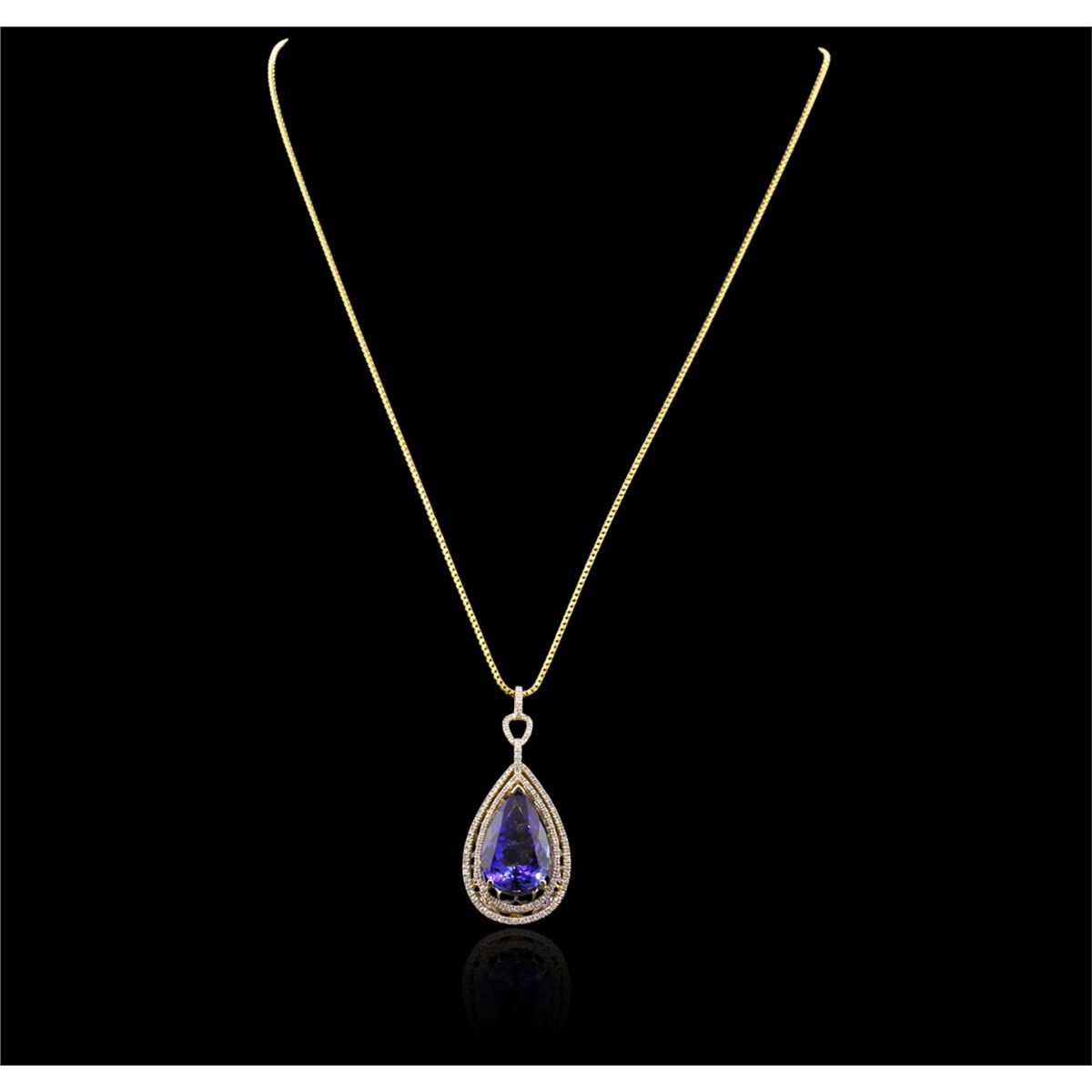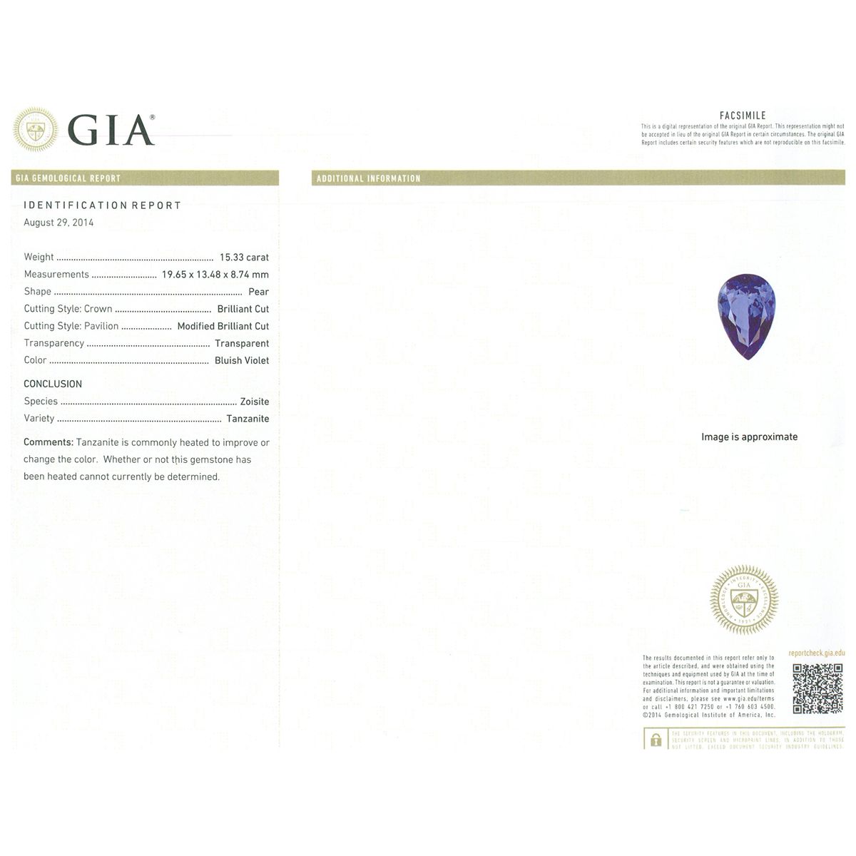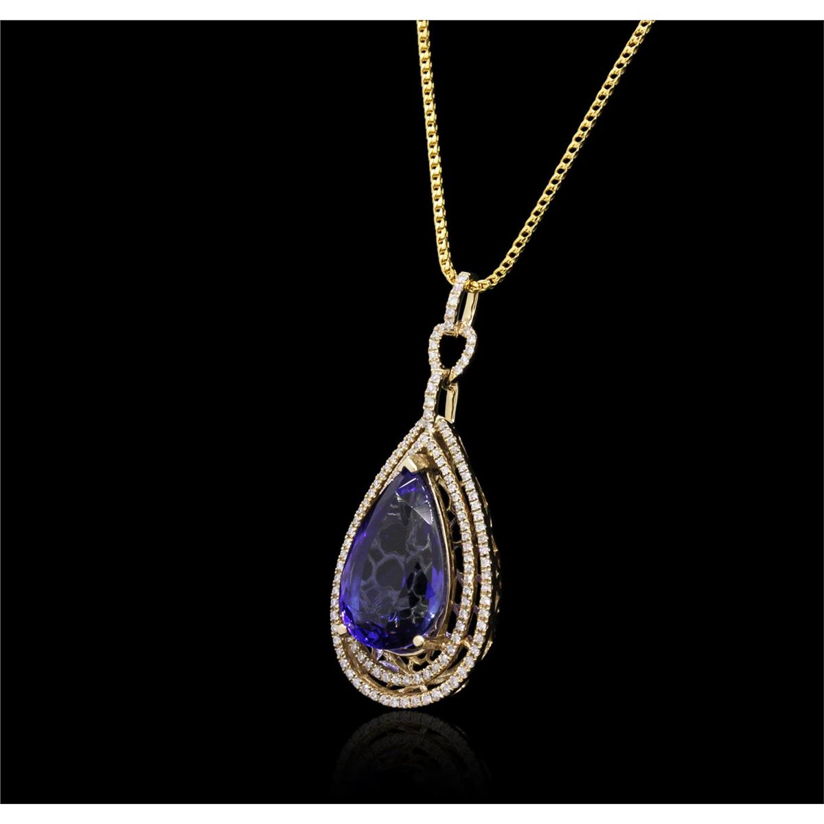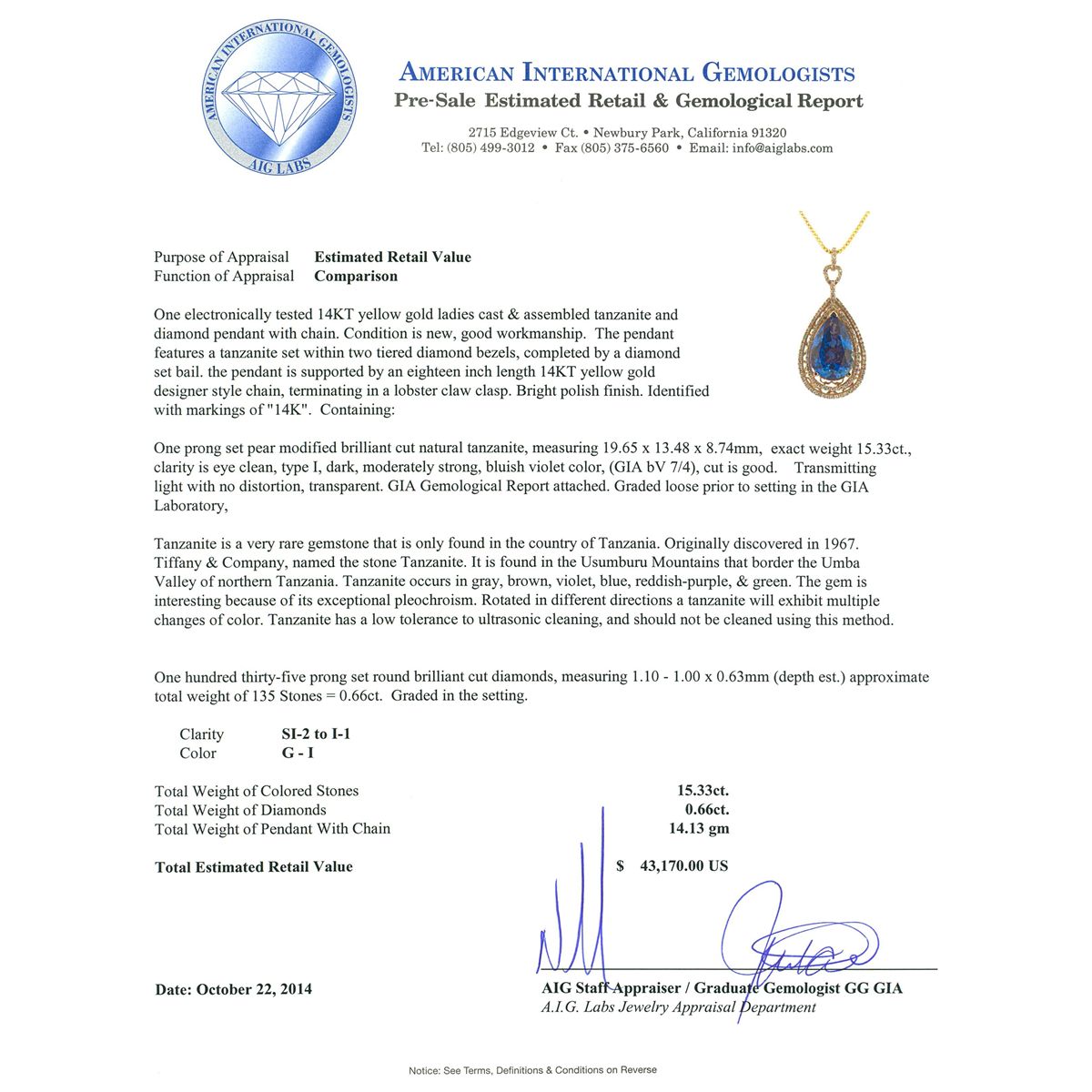One electronically tested 14KT yellow gold ladies cast & assembled tanzanite and diamond pendant with chain. The pendant features a tanzanite set within two tiered diamond bezels, completed by a diamond set bail. the pendant is supported by an eighteen inch length 14KT yellow gold designer style chain, terminating in a lobster claw clasp. Bright polish finish. Identified with markings of 14K. Condition is new, good workmanship. Containing: One prong set pear modified brilliant cut natural tanzanite, measuring 19.65 x 13.48 x 8.74mm, exact weight 15.33ct., clarity is eye clean, type I, dark, moderately strong, bluish violet color, (GIA bV 7/4), cut is good. Transmitting light with no distortion, transparent. GIA Gemological Report attached. Graded loose prior to setting in the GIA Laboratory, Report #6167542854.Tanzanite is a very rare gemstone that is only found in the country of Tanzania. Originally discovered in 1967. Tiffany & Company, named the stone Tanzanite. It is found in the Usumburu Mountains that border the Umba Valley of northern Tanzania. Tanzanite occurs in gray, brown, violet, blue, reddish-purple, & green. The gem is interesting because of its exceptional pleochroism. Rotated in different directions a tanzanite will exhibit multiple changes of color. Tanzanite has a low tolerance to ultrasonic cleaning, and should not be cleaned using this method. One Hundred Thirty-Five prong set round brilliant cut diamonds, measuring 1.10 - 1.00 x 0.63mm (depth est.) approximate total weight of 135 Stones = 0.66ct. Graded in the setting. Clarity: SI-2 to I-1. Color: G - I. Total Weight of Colored Stones 15.33ct. Total Weight of Diamonds 0.66ct. Total Weight of Pendant With Chain 14.13 grams. AIG Appraised at $43,170.00.