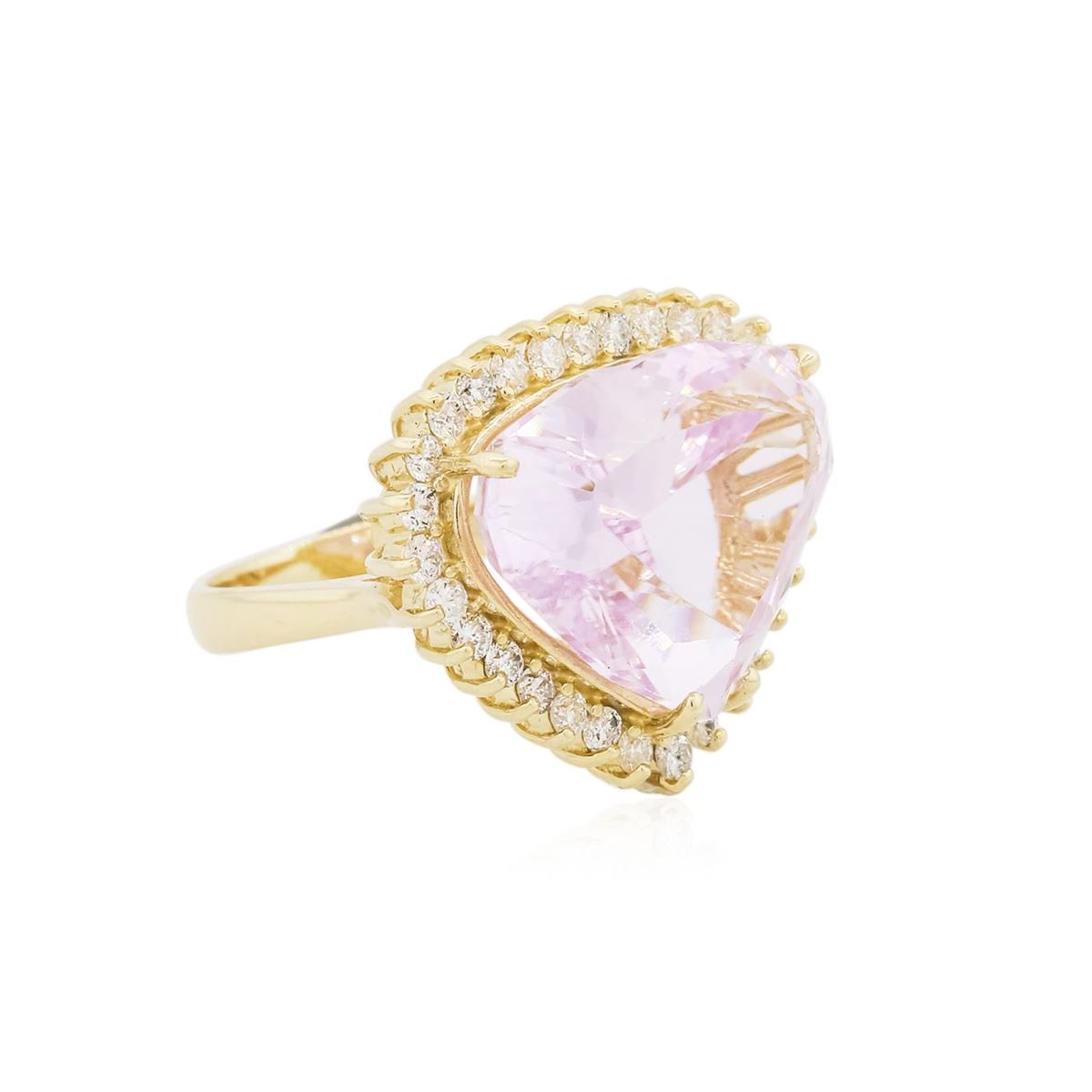 One electronically tested 14KT yellow gold Ladies combination cast & assembled ring with a bright polish finish. Condition is new. Identified with markings of "K14". Containing: One prong set shield cut natural kunzite, measuring 15.78 x 19.90 x 9.69mm, exact weight 18.42ct., clarity is eye clean, type I, light, very slightly grayish, purple color, (GIA P 3/3), cut is good. GIA Report: 6157961722.Thirty prong set round brilliant cut diamonds, measuring 2.00 - 2.00 x 1.20mm (depth est.) approximate. Total Weight of 30 Stones = 0.88ct. Clarity: SI-2 to I-1. Color: J - K, Cut is Good. Diamonds graded in the mounting. Total Weight of Colored Stones 18.42ct. Total Weight of Diamonds 0.88ct. Total Weight of Ring 12.20 grams. GGL Appraised at $15,415.00.