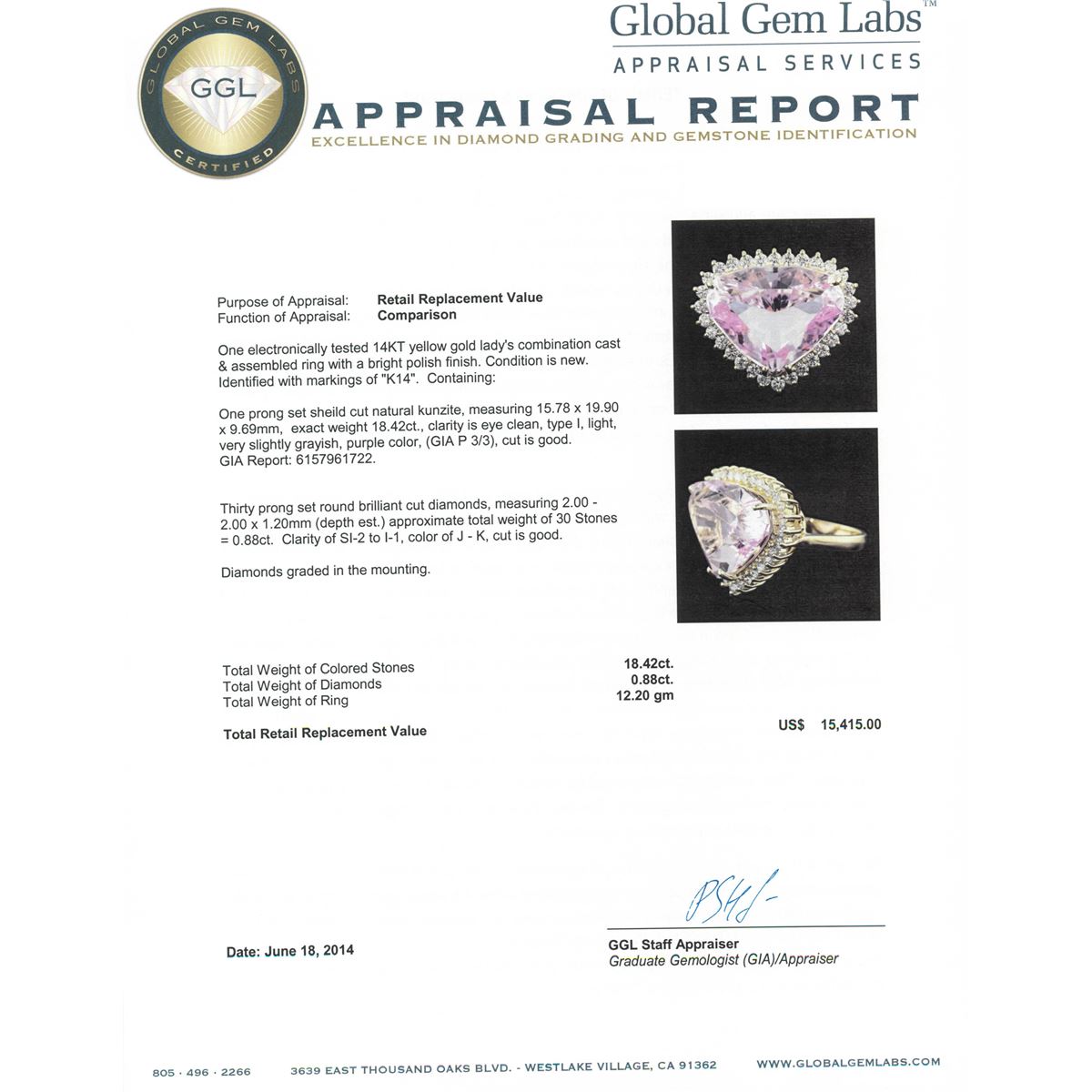 One electronically tested 14KT yellow gold Ladies combination cast & assembled ring with a bright polish finish. Condition is new. Identified with markings of "K14". Containing: One prong set shield cut natural kunzite, measuring 15.78 x 19.90 x 9.69mm, exact weight 18.42ct., clarity is eye clean, type I, light, very slightly grayish, purple color, (GIA P 3/3), cut is good. GIA Report: 6157961722.Thirty prong set round brilliant cut diamonds, measuring 2.00 - 2.00 x 1.20mm (depth est.) approximate. Total Weight of 30 Stones = 0.88ct. Clarity: SI-2 to I-1. Color: J - K, Cut is Good. Diamonds graded in the mounting. Total Weight of Colored Stones 18.42ct. Total Weight of Diamonds 0.88ct. Total Weight of Ring 12.20 grams. GGL Appraised at $15,415.00.