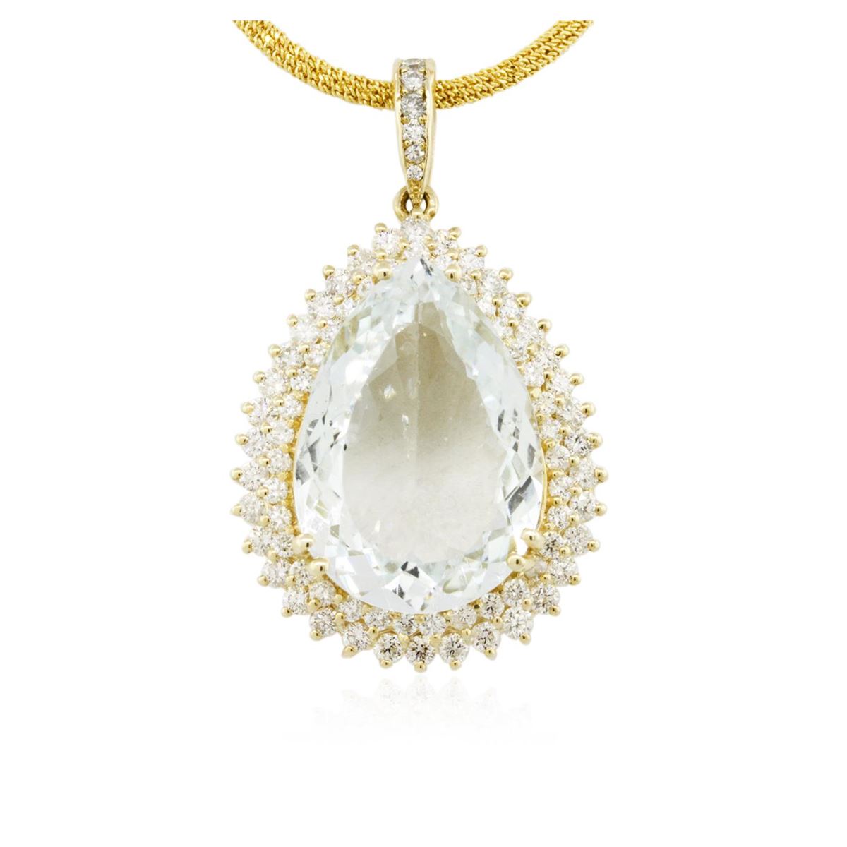 One electronically tested 14KT yellow gold ladies cast & assembled aquamarine and diamond pendant with chain. Condition is new, good workmanship. The pendant features an aquamarine set within a two tiered diamond bezel, completed by a diamond set bail. The pendant is supported by an eighteen inch length 14KT yellow gold woven chain, terminating in a lobster claw clasp. Bright polish finish with milgrain detailing. Identified with markings of "14K". Containing: One prong set pear modified brilliant cut natural aquamarine, measuring 24.69 x 17.18 x 8.67mm, exact weight 20.50ct., clarity is slightly included, type I, very light, very slightly grayish, greenish blue color, (GIA gB 2/3), cut is good. Transmitting light with a minimum of distortion, transparent. Naturally occurring internal & external characteristics are present. GIA Gemological Report attached. Graded loose prior to setting in the GIA Laboratory, Report #2151952801.Seventy-Eight prong set round brilliant cut diamonds, measuring 2.20 - 2.00 x 1.26mm (depth est.) approximate. Total Weight of 78 Stones = 2.74ct. Graded in the setting. Clarity: SI-1 to I-1. Color: G - I. Total Weight of Colored Stones 20.50ct. Total Weight of Diamonds 2.74ct. Total Weight of Pendant With Chain 25.17 grams. AIG Appraised at $19,550.00.