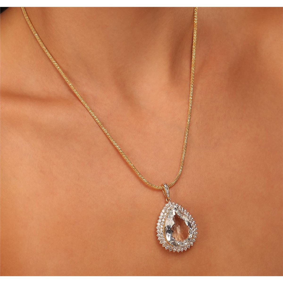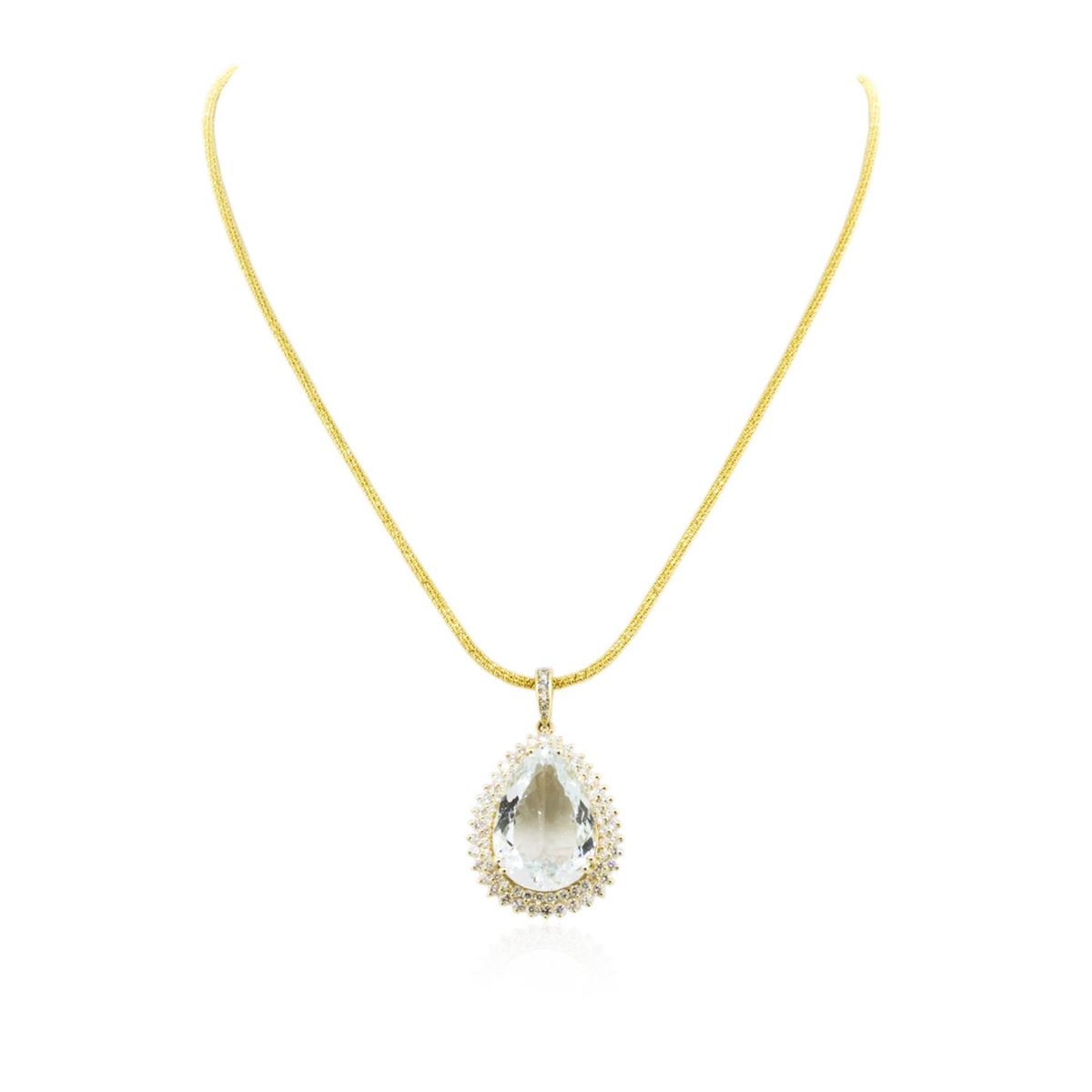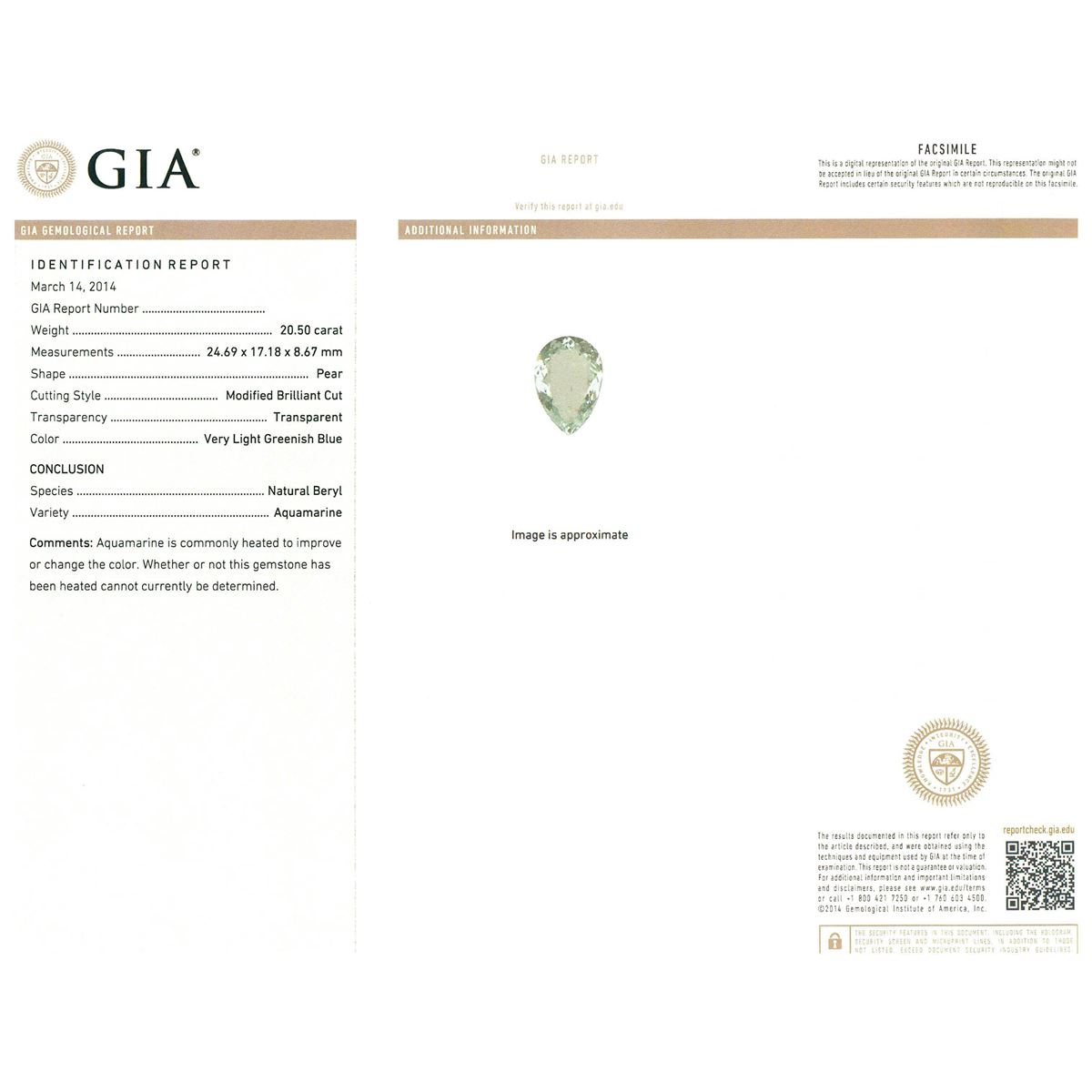 One electronically tested 14KT yellow gold ladies cast & assembled aquamarine and diamond pendant with chain. Condition is new, good workmanship. The pendant features an aquamarine set within a two tiered diamond bezel, completed by a diamond set bail. The pendant is supported by an eighteen inch length 14KT yellow gold woven chain, terminating in a lobster claw clasp. Bright polish finish with milgrain detailing. Identified with markings of "14K". Containing: One prong set pear modified brilliant cut natural aquamarine, measuring 24.69 x 17.18 x 8.67mm, exact weight 20.50ct., clarity is slightly included, type I, very light, very slightly grayish, greenish blue color, (GIA gB 2/3), cut is good. Transmitting light with a minimum of distortion, transparent. Naturally occurring internal & external characteristics are present. GIA Gemological Report attached. Graded loose prior to setting in the GIA Laboratory, Report #2151952801.Seventy-Eight prong set round brilliant cut diamonds, measuring 2.20 - 2.00 x 1.26mm (depth est.) approximate. Total Weight of 78 Stones = 2.74ct. Graded in the setting. Clarity: SI-1 to I-1. Color: G - I. Total Weight of Colored Stones 20.50ct. Total Weight of Diamonds 2.74ct. Total Weight of Pendant With Chain 25.17 grams. AIG Appraised at $19,550.00.
