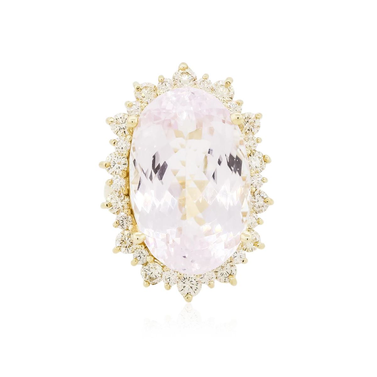 One electronically tested 14KT yellow gold Ladies combination cast & assembled ring with a bright polish finish. Condition is new. Identified with markings of "K14". Containing: One prong set oval modified brilliant cut natural kunzite, measuring 24.27 x 15.67 x 12.17mm, exact weight 37.12ct., clarity is eye clean, light, very slightly grayish, purple color, (GIA P 3/3), cut is good. GIA Report: 615953481.Fourteen prong set round brilliant cut diamonds, measuring 3.00 - 3.00 x 1.80mm (depth est.) approximate. Total Weight of 14 Stones = 1.38ct. Clarity: VS-1 to VS-2. Color: L - M, Cut is Very Good. Fourteen prong set round brilliant cut diamonds, measuring 1.80 - 1.80 x 1.08mm (depth est.) approximate. Total Weight of 14 Stones = 0.30ct. Clarity: VS-2 to SI-1. Color: L - M, Cut is Good. Diamonds graded in the mounting. Total Weight of Colored Stones 37.12ct. Total Weight of Diamonds 1.68ct. Total Weight of Ring 17.40 grams. GGL Appraised at $22,330.00.