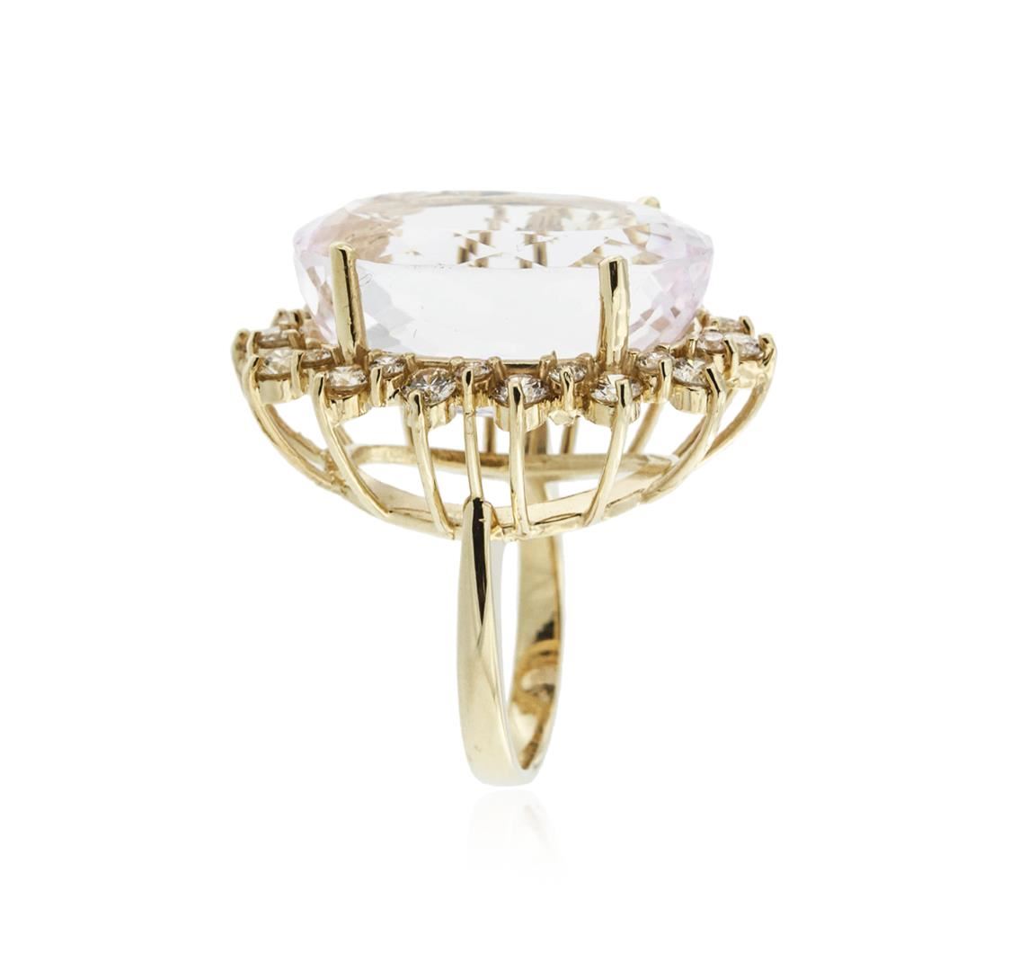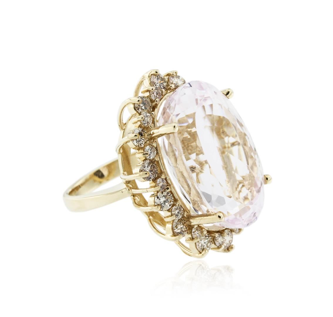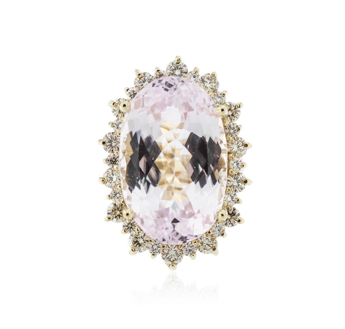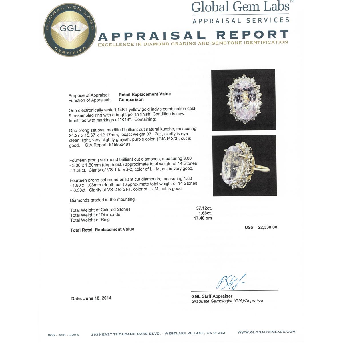 One electronically tested 14KT yellow gold Ladies combination cast & assembled ring with a bright polish finish. Condition is new. Identified with markings of "K14". Containing: One prong set oval modified brilliant cut natural kunzite, measuring 24.27 x 15.67 x 12.17mm, exact weight 37.12ct., clarity is eye clean, light, very slightly grayish, purple color, (GIA P 3/3), cut is good. GIA Report: 615953481.Fourteen prong set round brilliant cut diamonds, measuring 3.00 - 3.00 x 1.80mm (depth est.) approximate. Total Weight of 14 Stones = 1.38ct. Clarity: VS-1 to VS-2. Color: L - M, Cut is Very Good. Fourteen prong set round brilliant cut diamonds, measuring 1.80 - 1.80 x 1.08mm (depth est.) approximate. Total Weight of 14 Stones = 0.30ct. Clarity: VS-2 to SI-1. Color: L - M, Cut is Good. Diamonds graded in the mounting. Total Weight of Colored Stones 37.12ct. Total Weight of Diamonds 1.68ct. Total Weight of Ring 17.40 grams. GGL Appraised at $22,330.00.