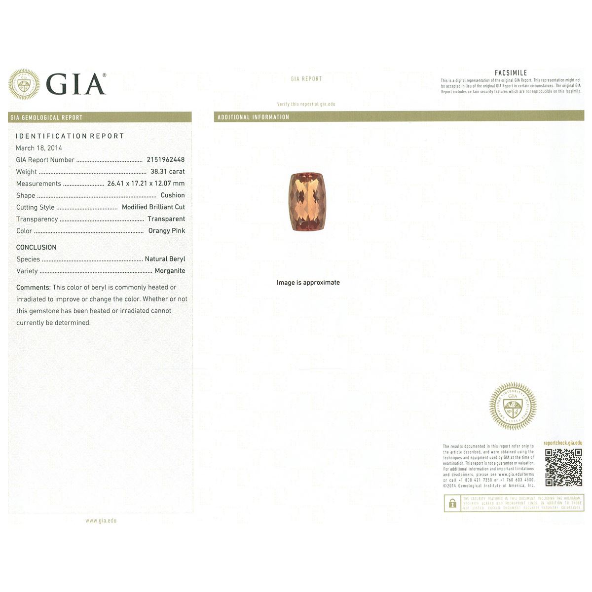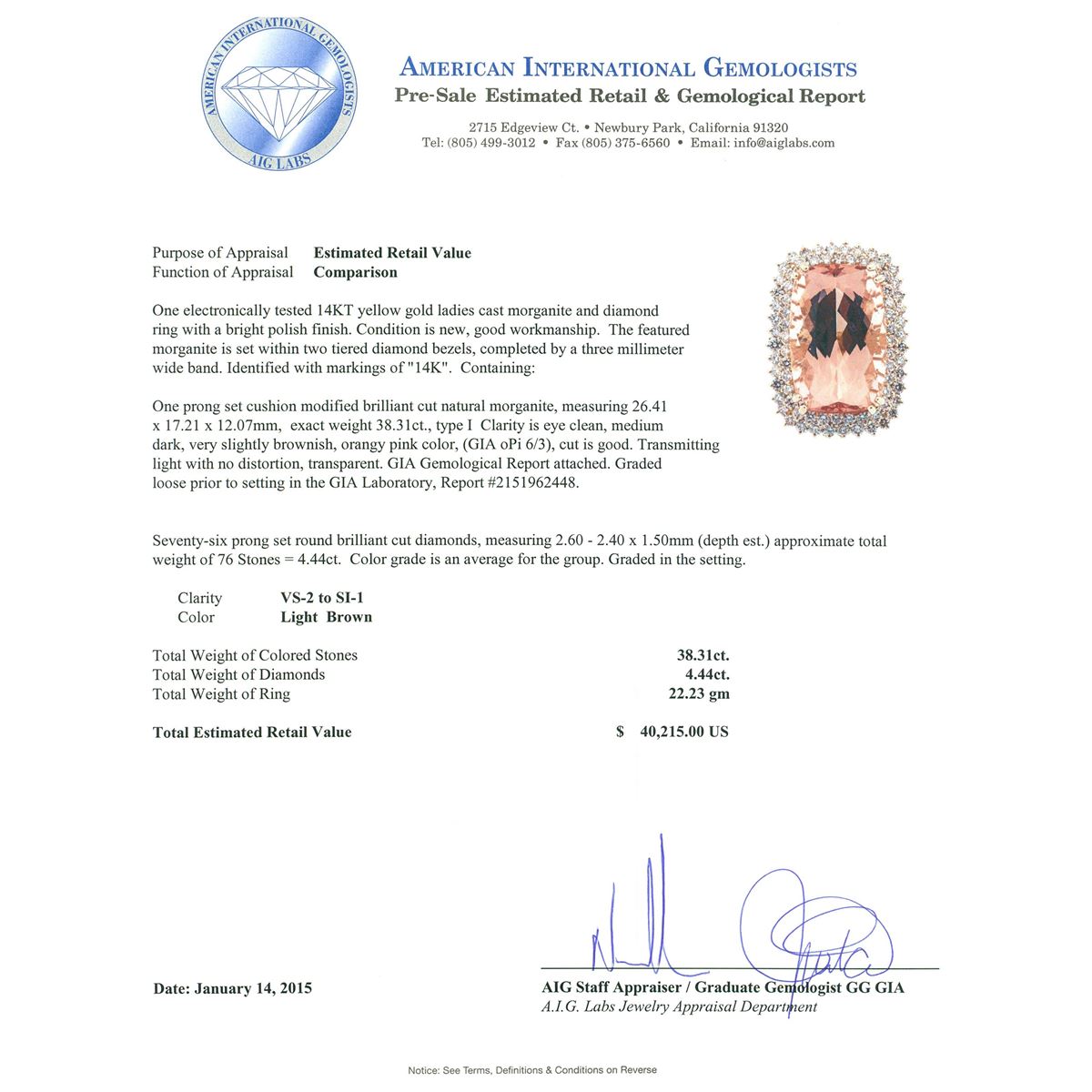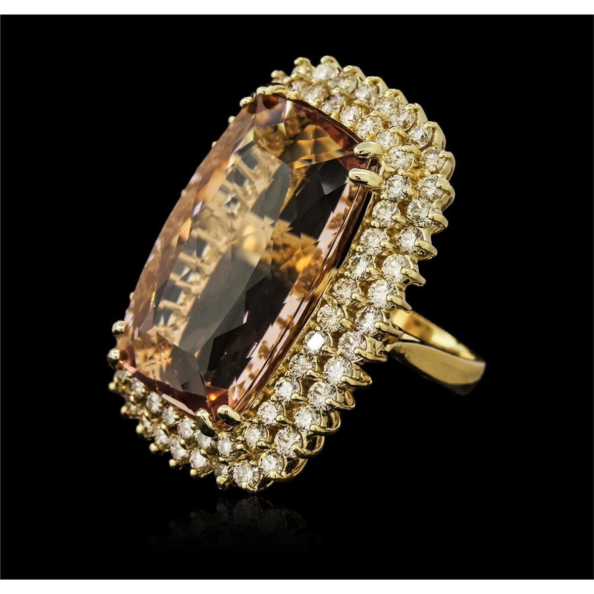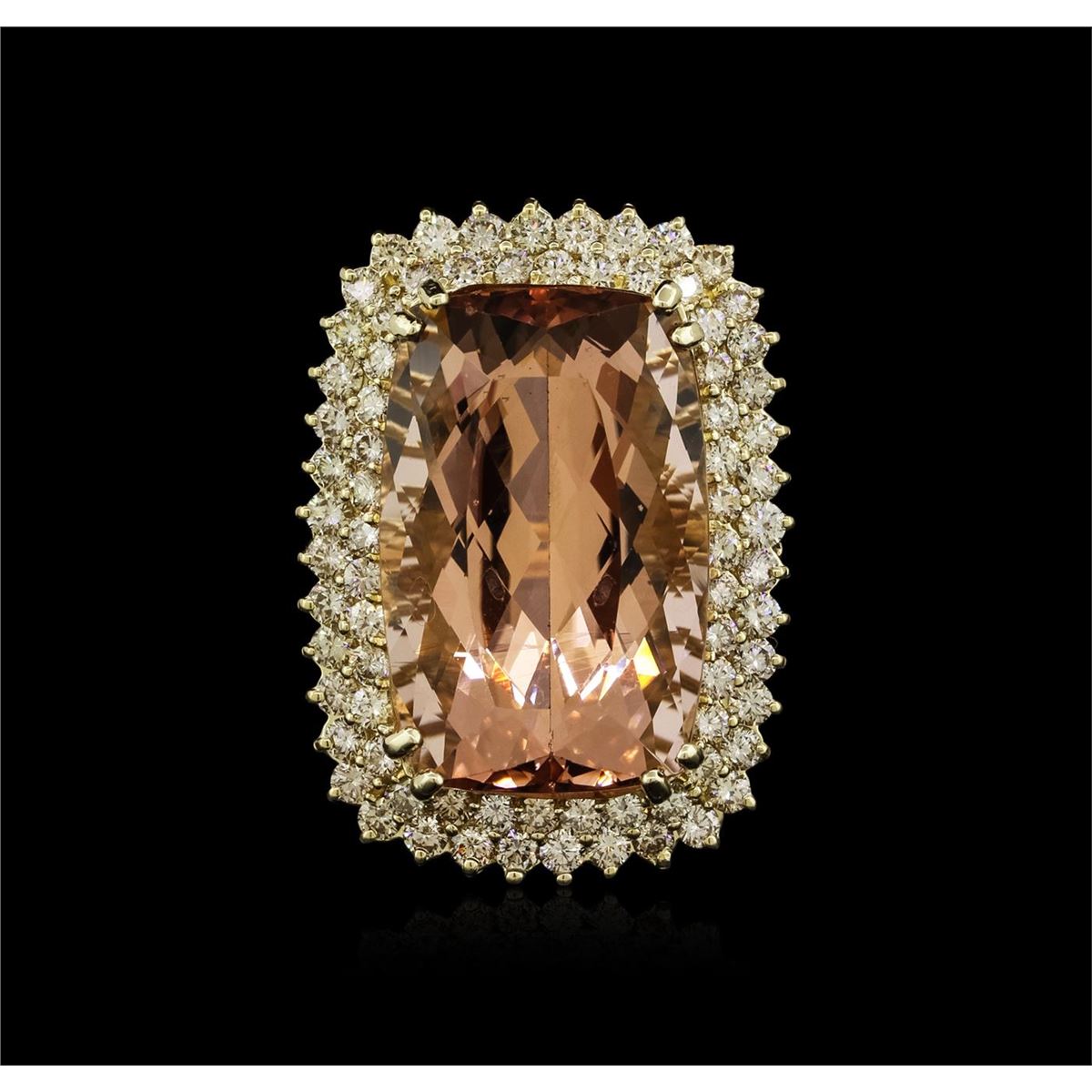 One electronically tested 14KT yellow gold ladies cast morganite and diamond ring with a bright polish finish. The featured morganite is set within two tiered diamond bezels, completed by a three millimeter wide band. Identified with markings of "14K". Condition is new, good workmanship. Containing: One prong set cushion modified brilliant cut natural morganite, measuring 26.41 x 17.21 x 12.07mm, exact weight 38.31ct., type I Clarity is eye clean, medium dark, very slightly brownish, orangy pink color, (GIA oPi 6/3), cut is good. Transmitting light with no distortion, transparent. GIA Gemological Report attached. Graded loose prior to setting in the GIA Laboratory, Report #2151962448.Seventy-Six prong set round brilliant cut diamonds, measuring 2.60 - 2.40 x 1.50mm (depth est.) approximate total weight of 76 Stones = 4.44ct. Color grade is an average for the group. Graded in the setting. Clarity: VS-2 to SI-1. Total Weight of Colored Stones 38.31ct. Total Weight of Diamonds 4.44ct. Total Weight of Ring 22.23 grams. AIG Appraised at $40,215.00.