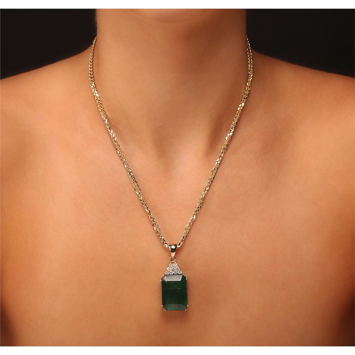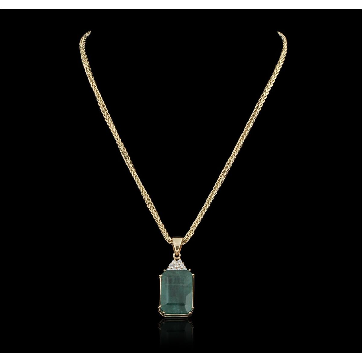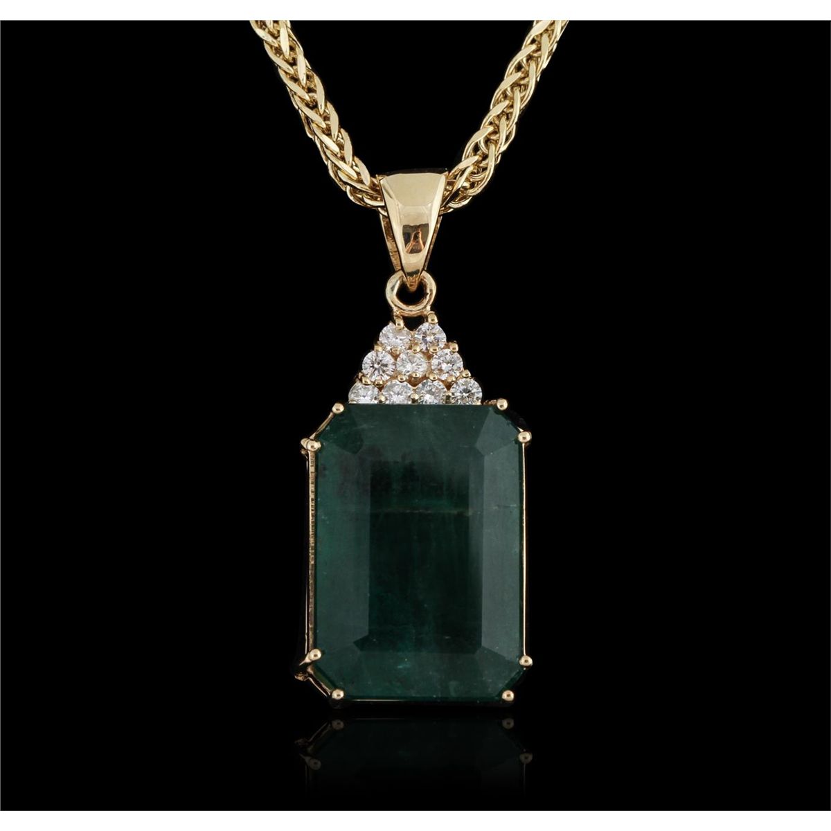 One electronically tested 14KT yellow gold ladies cast & assembled emerald and diamond pendant with chain. Condition is new, good workmanship. The pendant features an emerald accented with a diamond set crown, completed by a 14KT yellow gold bail. The pendant is supported by an eighteen inch length 14KT yellow gold designer style chain terminating in a lobster claw clasp. Bright polish finish. Condition is new, good workmanship. Identified with markings of "K14". Containing: One prong set rectangular step cut natural emerald, measuring 23.59 x 16.60 x 12.98mm, exact weight 38.72ct., clarity is heavily included, type III, medium dark, very slightly grayish, very slightly bluish green color, (GIA vslbG 6/3), cut is good. Transmitting light somewhat diffusely, translucent. Naturally occurring internal & external characteristics are present. Indications of oil residue. GIA Gemological Report attached. Graded loose prior to setting in the GIA Laboratory, Report #6157952106.Nine prong set round brilliant cut diamonds, measuring 2.60 - 2.60 x 1.56mm (depth est.) approximate. Total Weight of 9 Stones = 0.68ct. Graded in the setting. Clarity: SI-2 to I-1. Color: G - I. Total Weight of Colored Stones 38.72ct. Total Weight of Diamonds 0.68ct. Total Weight of Pendant With Chain 21.90gm. AIGAppraised at $45,850.00.