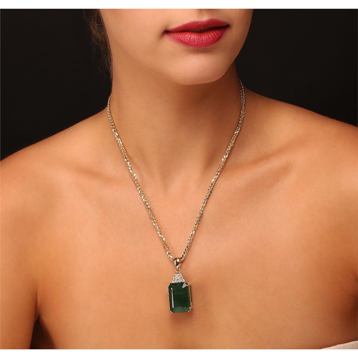 One electronically tested 14KT yellow gold ladies cast & assembled emerald and diamond pendant with chain. Condition is new, good workmanship. The pendant features an emerald accented with a diamond set crown, completed by a 14KT yellow gold bail. The pendant is supported by an eighteen inch length 14KT yellow gold designer style chain terminating in a lobster claw clasp. Bright polish finish. Condition is new, good workmanship. Identified with markings of "K14". Containing: One prong set rectangular step cut natural emerald, measuring 23.59 x 16.60 x 12.98mm, exact weight 38.72ct., clarity is heavily included, type III, medium dark, very slightly grayish, very slightly bluish green color, (GIA vslbG 6/3), cut is good. Transmitting light somewhat diffusely, translucent. Naturally occurring internal & external characteristics are present. Indications of oil residue. GIA Gemological Report attached. Graded loose prior to setting in the GIA Laboratory, Report #6157952106.Nine prong set round brilliant cut diamonds, measuring 2.60 - 2.60 x 1.56mm (depth est.) approximate. Total Weight of 9 Stones = 0.68ct. Graded in the setting. Clarity: SI-2 to I-1. Color: G - I. Total Weight of Colored Stones 38.72ct. Total Weight of Diamonds 0.68ct. Total Weight of Pendant With Chain 21.90gm. AIG Appraised at $45,850.00.