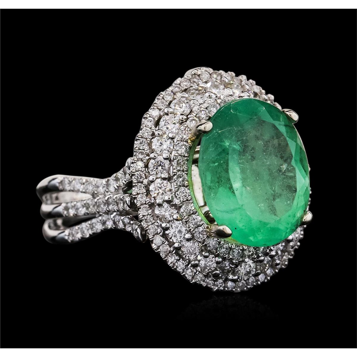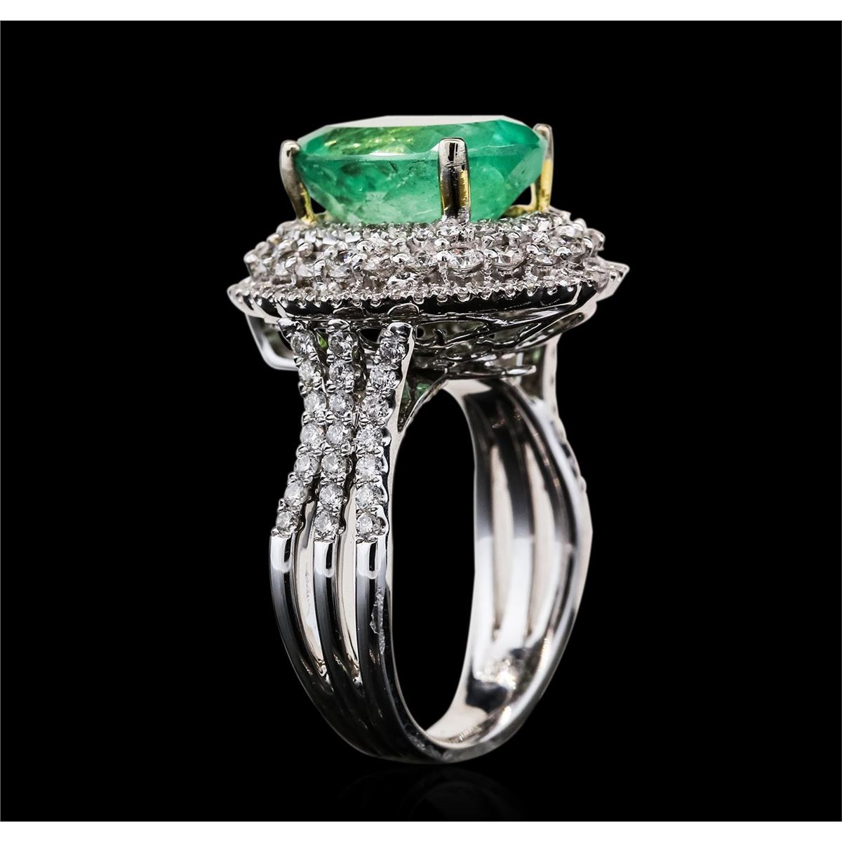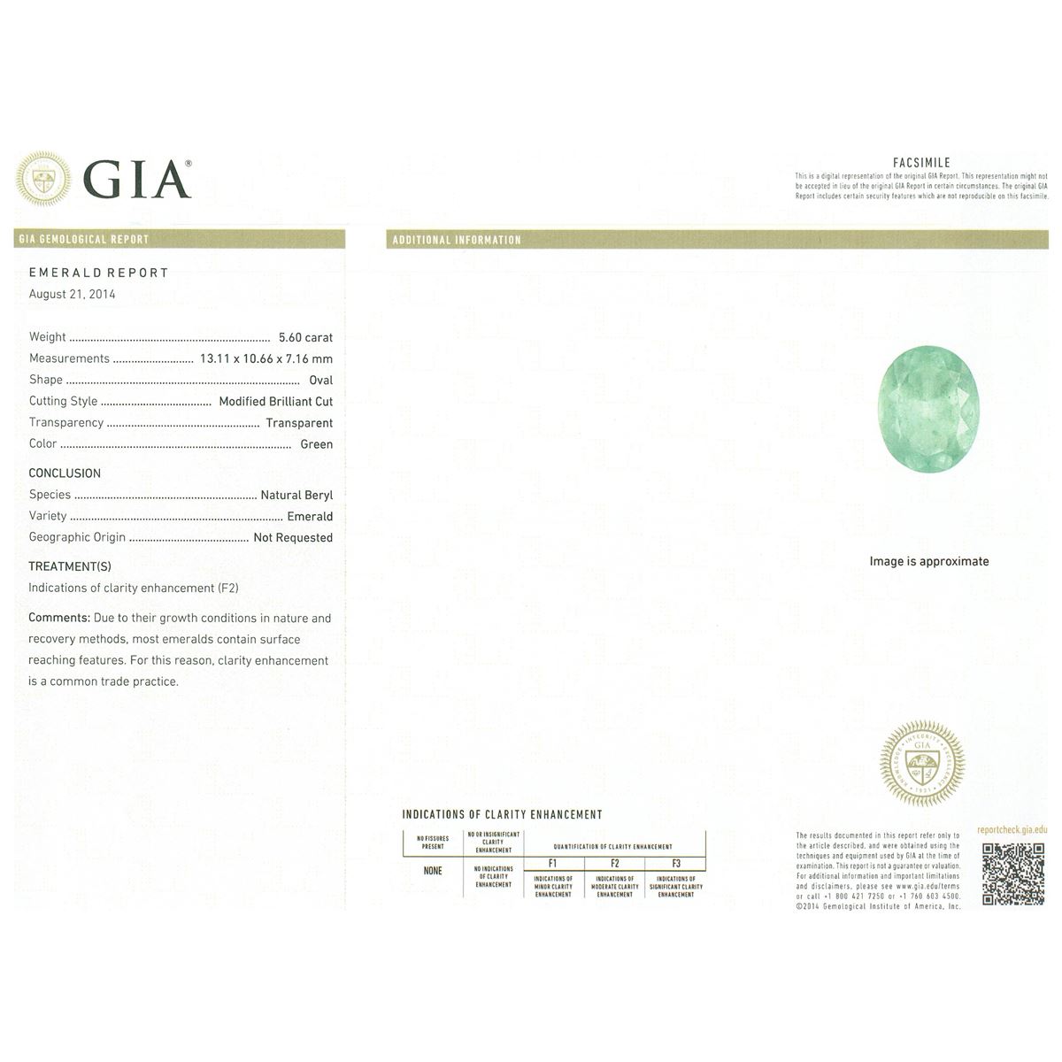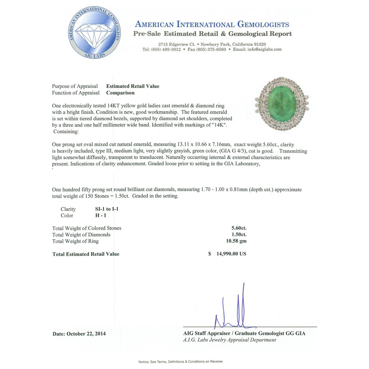 One electronically tested 14KT yellow gold ladies cast emerald & diamond ring with a bright finish. The featured emerald is set within tiered diamond bezels, supported by diamond set shoulders, completed by a three and one half millimeter wide band. Identified with markings of 14K. Condition is new, good workmanship. Containing: One prong set oval mixed cut natural emerald, measuring 13.11 x 10.66 x 7.16mm, exact weight 5.60ct., clarity is heavily included, type III, medium light, very slightly grayish, green color, (GIA G 4/3), cut is good. Transmitting light somewhat diffusely, transparent to translucent. Naturally occurring internal & external characteristics are present. Indications of clarity enhancement. Graded loose prior to setting in the GIA Laboratory, Report # 6167542613. The GIA Report is attached. One Hundred Fifty prong set round brilliant cut diamonds, measuring 1.70 - 1.00 x 0.81mm (depth est.) approximate total weight of 150 Stones = 1.50ct. Graded in the setting. Clarity: SI-1 to I-1. Color: H - I. Total Weight of Colored Stones 5.60ct. Total Weight of Diamonds 1.50ct. Total Weight of Ring 10.58 grams. AIG Appraised at $14,990.00.