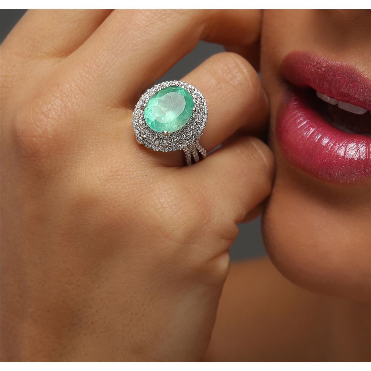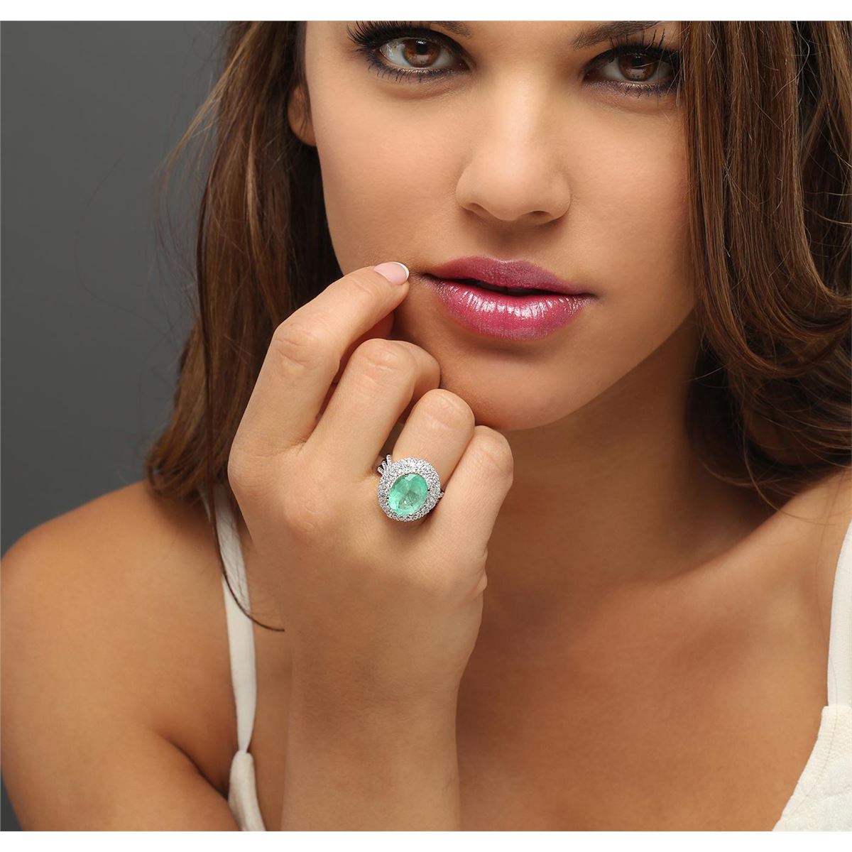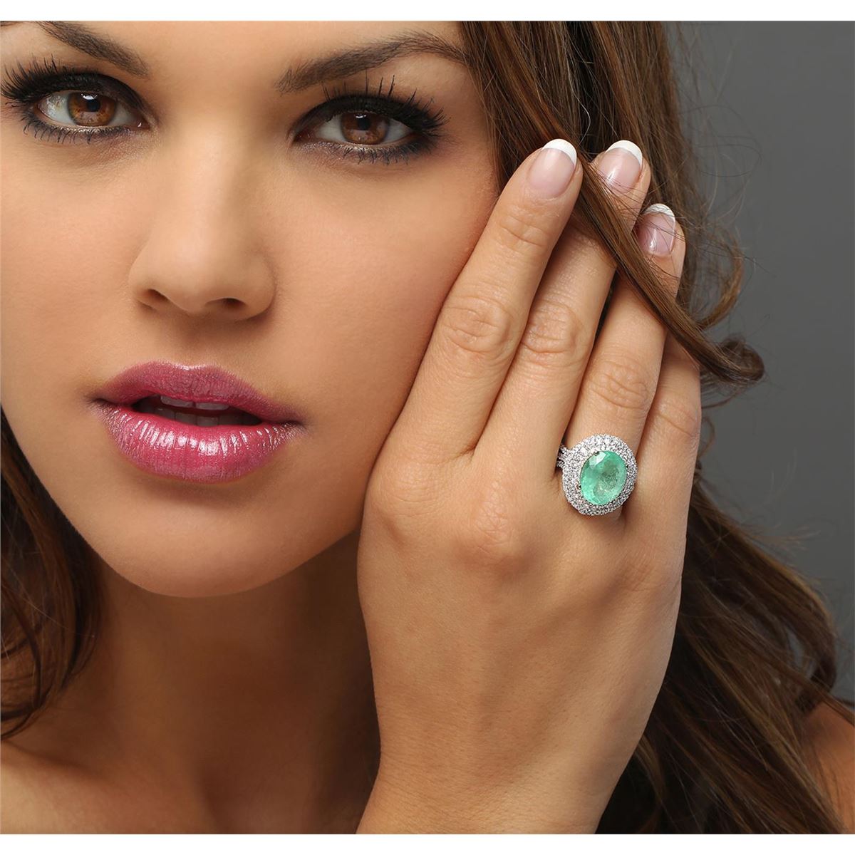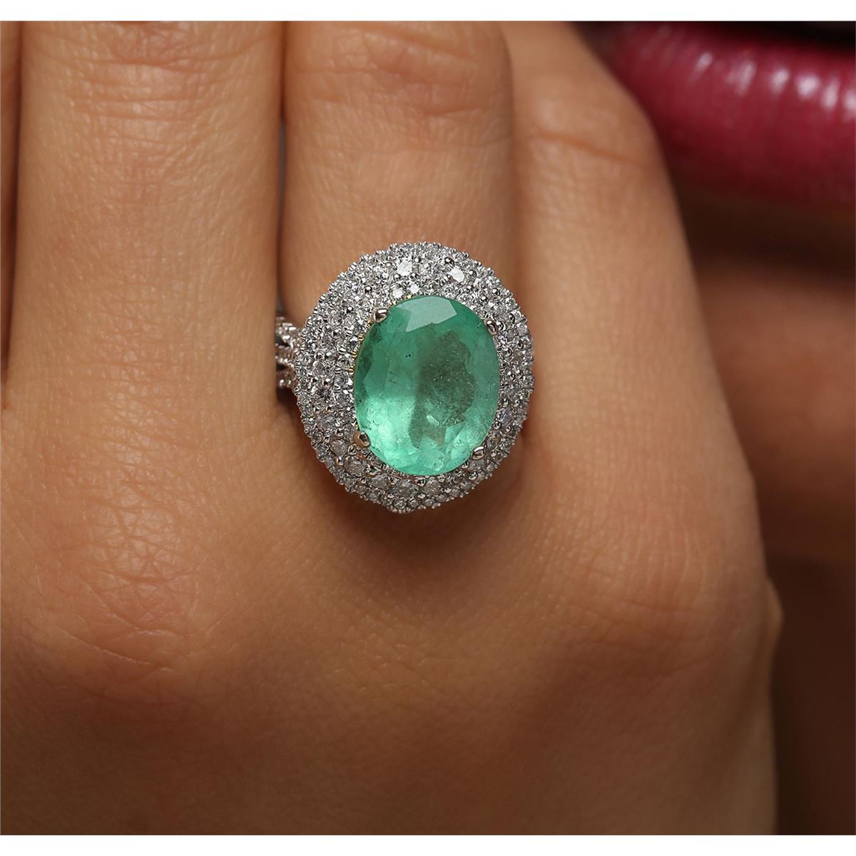 One electronically tested 14KT yellow gold ladies cast emerald & diamond ring with a bright finish. The featured emerald is set within tiered diamond bezels, supported by diamond set shoulders, completed by a three and one half millimeter wide band. Identified with markings of 14K. Condition is new, good workmanship. Containing: One prong set oval mixed cut natural emerald, measuring 13.11 x 10.66 x 7.16mm, exact weight 5.60ct., clarity is heavily included, type III, medium light, very slightly grayish, green color, (GIA G 4/3), cut is good. Transmitting light somewhat diffusely, transparent to translucent. Naturally occurring internal & external characteristics are present. Indications of clarity enhancement. Graded loose prior to setting in the GIA Laboratory, Report # 6167542613. The GIA Report is attached. One Hundred Fifty prong set round brilliant cut diamonds, measuring 1.70 - 1.00 x 0.81mm (depth est.) approximate total weight of 150 Stones = 1.50ct. Graded in the setting. Clarity: SI-1 to I-1. Color: H - I. Total Weight of Colored Stones 5.60ct. Total Weight of Diamonds 1.50ct. Total Weight of Ring 10.58 grams. AIG Appraised at $14,990.00.
