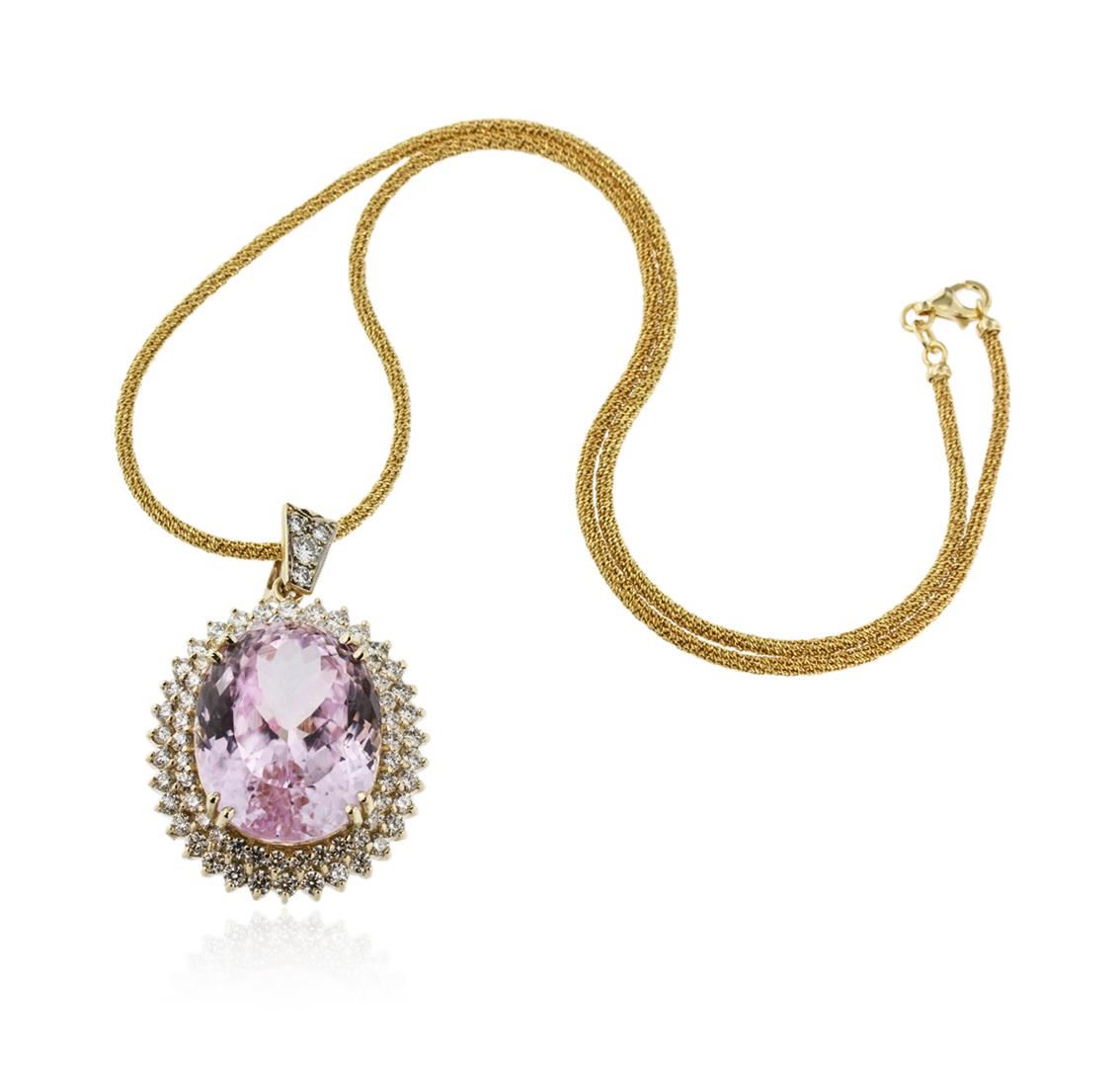 One electronically tested 14KT yellow gold Ladies combination cast & assembled pendant & chain 16.0" long, medium fancy link with a lobster claw clasp with a bright polish finish. Condition is new. Identified with markings of "14K". Containing: One prong set oval modified brilliant cut natural kunzite, measuring 24.80 x 19.87 x 16.12mm, exact weight 59.31ct., clarity is eye clean, type I, light, very slightly grayish, purple color, (GIA P 3/3), cut is good. GIA Report: 2151953417.One prong set round brilliant cut diamond, measuring 3.40 - 3.40 x 2.04mm (depth est.) approximate weight of 0.14ct. Clarity: SI-1. Color: I, Cut is Good. Forty-Six prong set round brilliant cut diamonds, measuring 2.50 - 2.00 x 1.35mm (depth est.) approximate. Total Weight of 46 Stones = 1.91ct. Clarity: SI-1 to SI-2. Color: I - J, Cut is Good. Diamonds graded in the mounting. Total Weight of Colored Stones 59.31ct. Total Weight of Diamonds 2.06ct. Total Weight of Pendant & Chain 35.60 grams. GGL Appraised at $38,340.00.