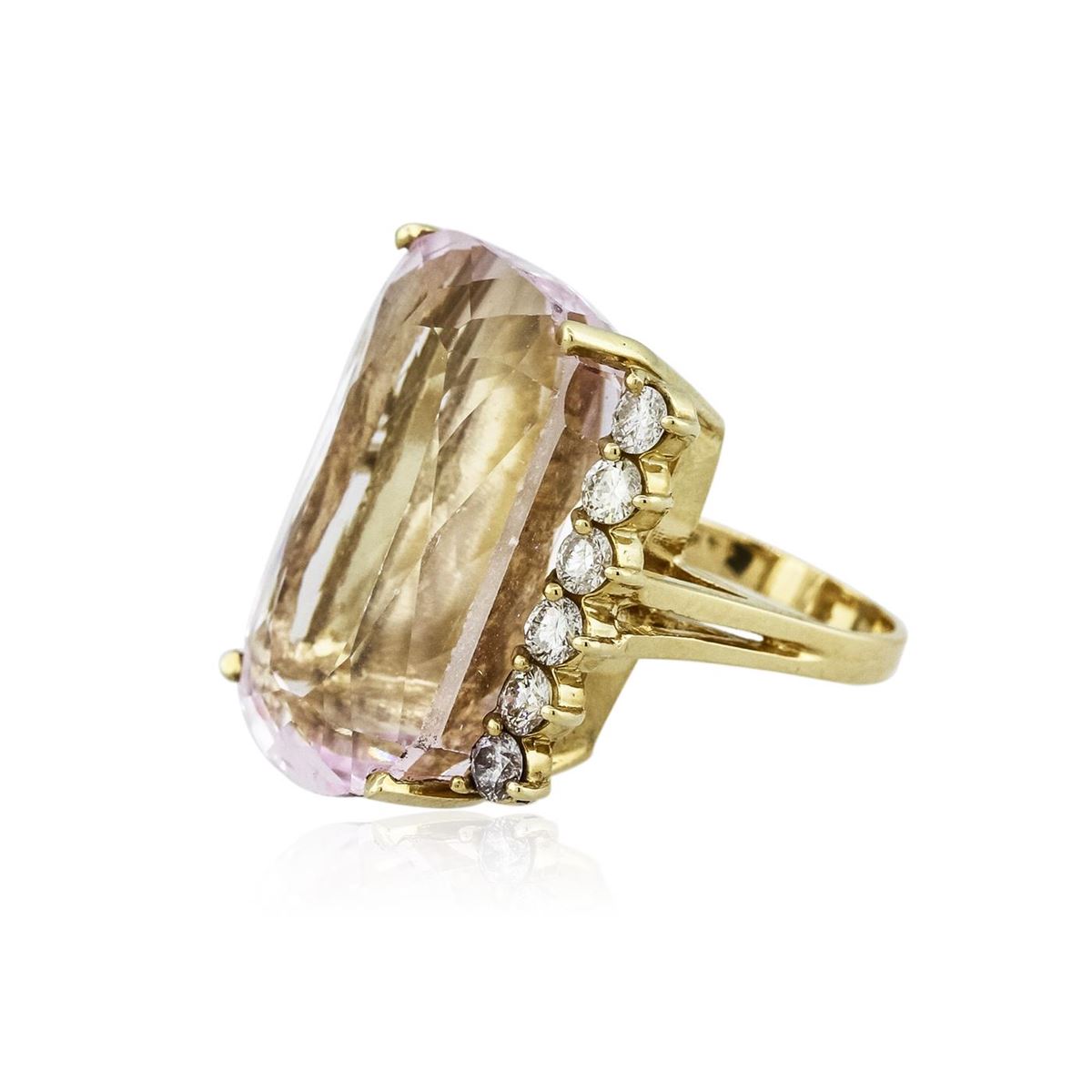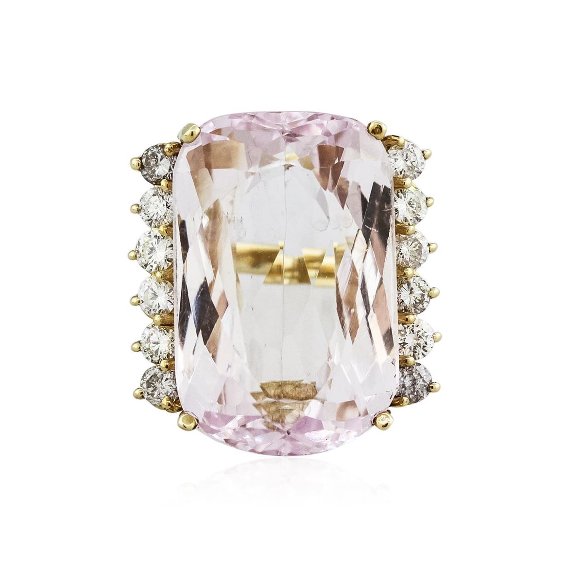 One electronically tested 14KT yellow gold ladies cast kunzite spodumene and diamond ring with a bright polish finish. Condition is new, good workmanship. The featured kunzite spodumene is framed by mirroring ribbons of diamonds, supported by split shoulders and completed by a two and one-half millimeter wide band. Identified with markings of "14K". Containing: One prong set rectangular cushion modified brilliant cut natural kunzite, measuring 28.03 x 18.20 x 13.44mm, 8%. bulge factor, exact weight 65.77ct., type I Clarity is eye clean, light, very slightly grayish, Pink-Purple color, (GIA PiP 3/3), cut is good. Transmitting light with no distortion, transparent. GIA Gemological Report attached. Graded loose prior to setting in the GIA Laboratory, Report #2151953638.Twelve prong set round brilliant cut diamonds, measuring 3.50 - 3.50 x 2.10mm (depth est.) approximate. Total Weight of 12 Stones = 1.98ct. Graded in the setting. Clarity: SI-2 to I-1. Color: G - I. Total Weight of Colored Stones 65.77ct. Total Weight of Diamonds 1.98ct. Total Weight of Ring 22.90gm. AIG Appraised at $27,435.00.
