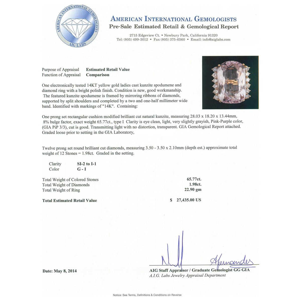 One electronically tested 14KT yellow gold ladies cast kunzite spodumene and diamond ring with a bright polish finish. Condition is new, good workmanship. The featured kunzite spodumene is framed by mirroring ribbons of diamonds, supported by split shoulders and completed by a two and one-half millimeter wide band. Identified with markings of "14K". Containing: One prong set rectangular cushion modified brilliant cut natural kunzite, measuring 28.03 x 18.20 x 13.44mm, 8%. bulge factor, exact weight 65.77ct., type I Clarity is eye clean, light, very slightly grayish, Pink-Purple color, (GIA PiP 3/3), cut is good. Transmitting light with no distortion, transparent. GIA Gemological Report attached. Graded loose prior to setting in the GIA Laboratory, Report #2151953638.Twelve prong set round brilliant cut diamonds, measuring 3.50 - 3.50 x 2.10mm (depth est.) approximate. Total Weight of 12 Stones = 1.98ct. Graded in the setting. Clarity: SI-2 to I-1. Color: G - I. Total Weight of Colored Stones 65.77ct. Total Weight of Diamonds 1.98ct. Total Weight of Ring 22.90gm. AIG Appraised at $27,435.00.